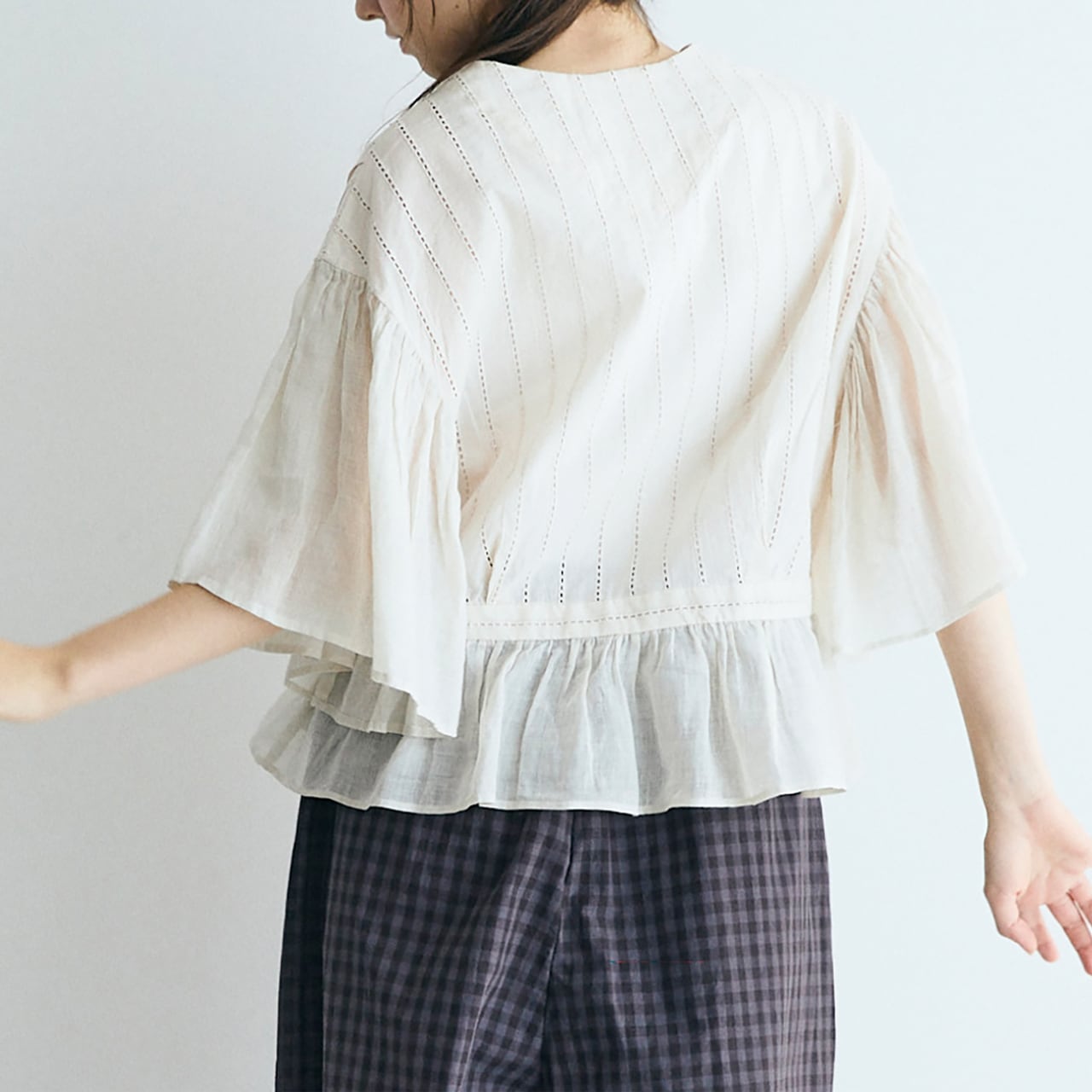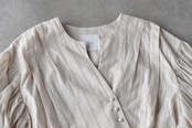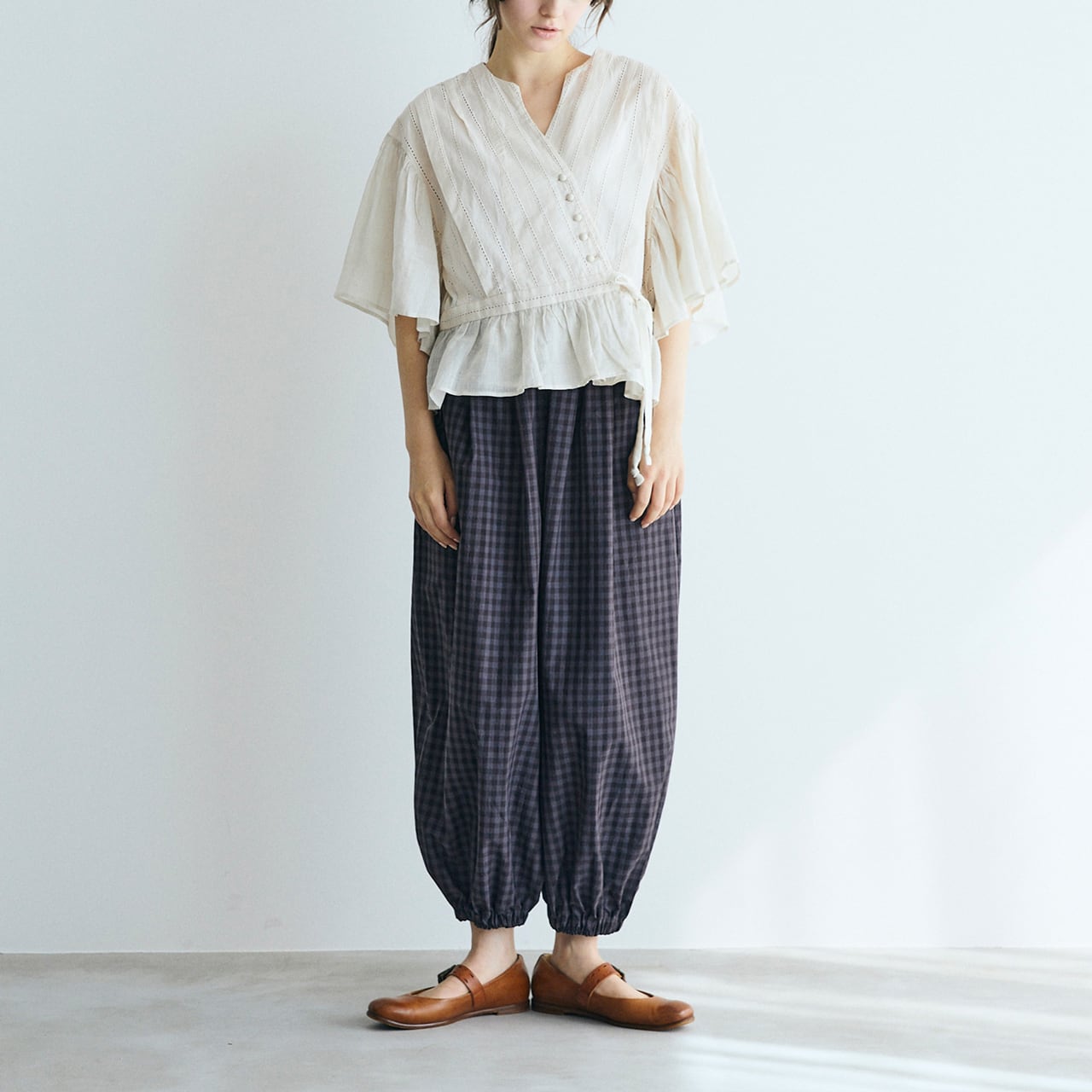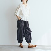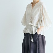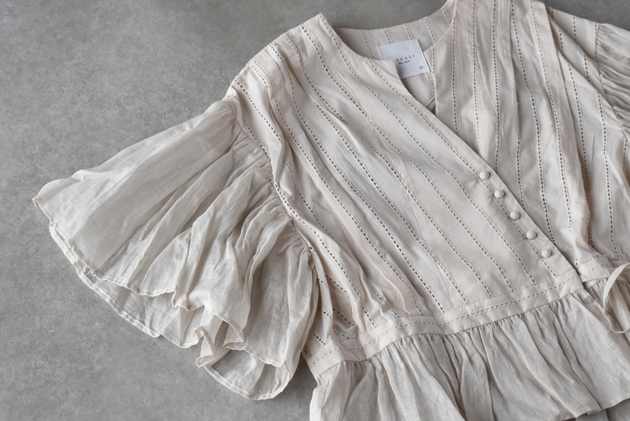 MAGALIから、ウエストのリボンをキュッと結んでカシュクールのようなデザインで楽しめる、コットンレースのブラウスが届きました。繊細なレースの表情と、空気を纏う様な軽やかさが魅力的な一枚です。広い袖にはたっぷりとギャザーを寄せ、動く度にふわりと揺れる姿がとっても美しいです。斜めに並んだクルミボタンも個性的。ブラウスとしてはもちろん、前を開けてワンピースに羽織ったコーディネートもオススメです。