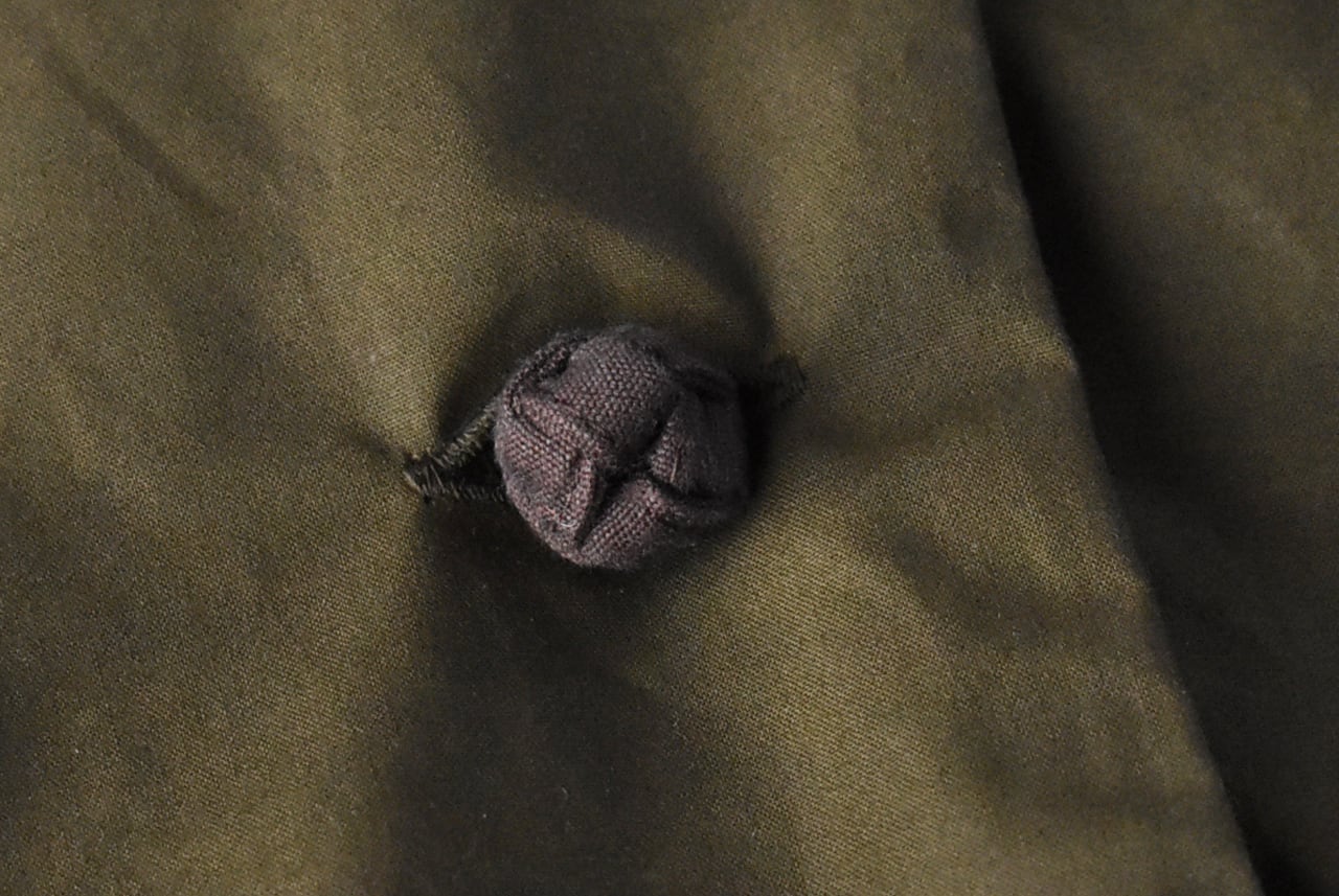 Atelier d'antanから、スコットランドの伝統的なワックスドコットンで仕立てたスプリングコート「ベルタン」が届きました。コットンにワックスをコーティングする事で、着る度に「チョークマーク」と呼ばれる立体的なシワが生まれ、ヴィンテージのような風合いへと変化していく特別な一着です。大きめの丸襟や両サイドのパッチポケットなど、愛らしいディテールを取り入れながらも、着用するとどこかモードな香りに仕上がるのもカッコいいです。着心地も軽く、風を通しにくいしっかりとしたハリのある生地が美しいシルエットをキープしてくれますよ。職人が一本のヒモを間隔を計算しながら結んで仕上げた玉状のボタンもダンタンならではの芸術的な見どころの一つです。