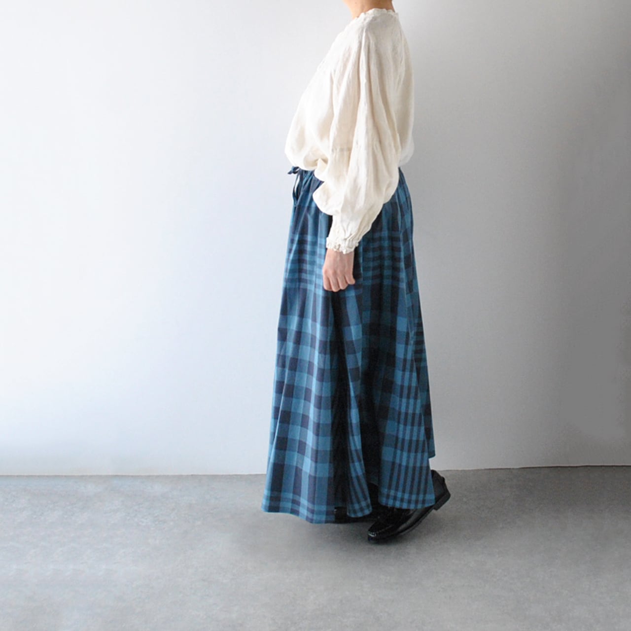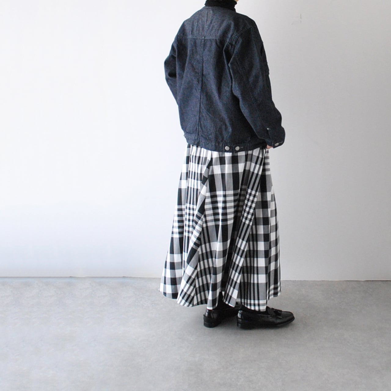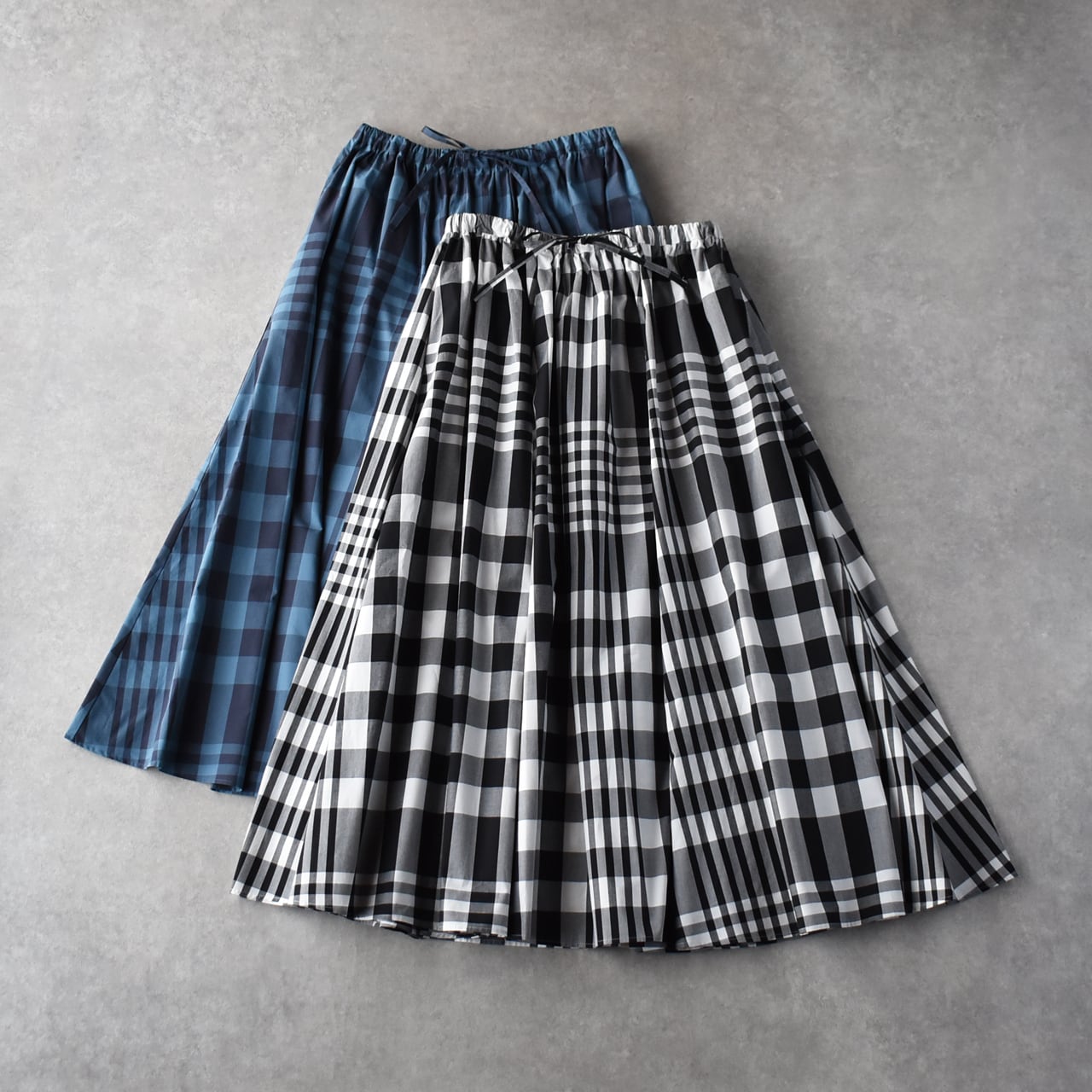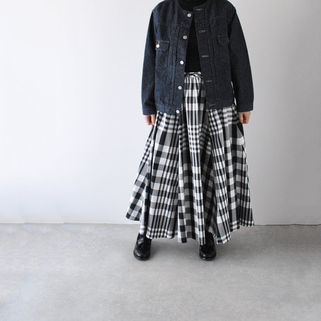 Vent d'ouestから、前後左右に4枚の布をつなぐ事でたっぷりのボリューム感と動きのある柄が生まれる美しいスカートが届きました。マルチパターンのビッグチェック柄は存在感があり、シンプルなトップスを合わせるだけで着映えする一枚ですよ。Tシャツや女性らしいブラウスはもちろん、スポーティーなアウターまで、幅広いスタイリングにお使い頂けます。高密度に織り上げたタイプライターコットンは、薄手ながらしっかりとしたハリとコシがあって軽い履き心地。動く度に揺れる姿も本当に素敵ですよ。
