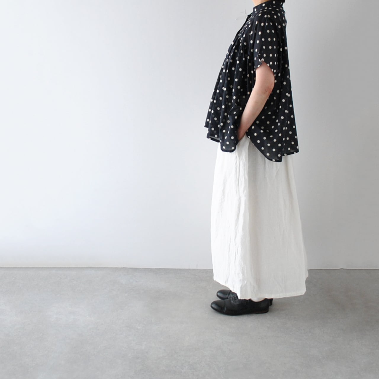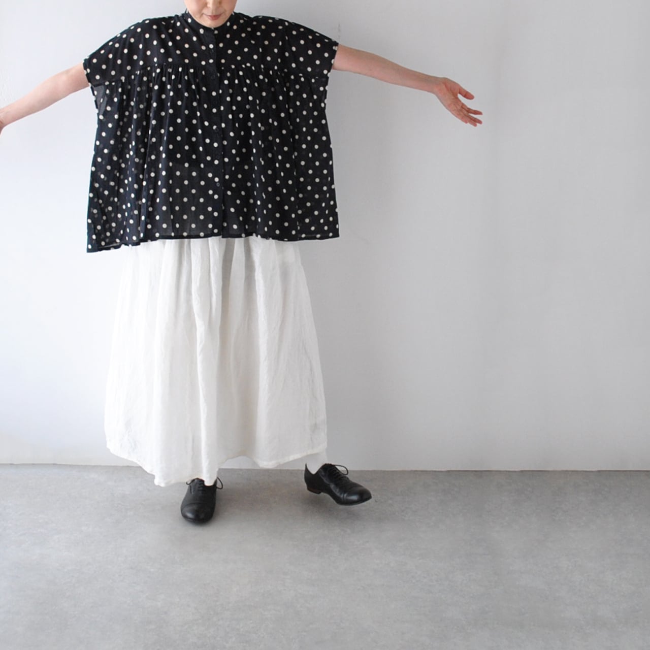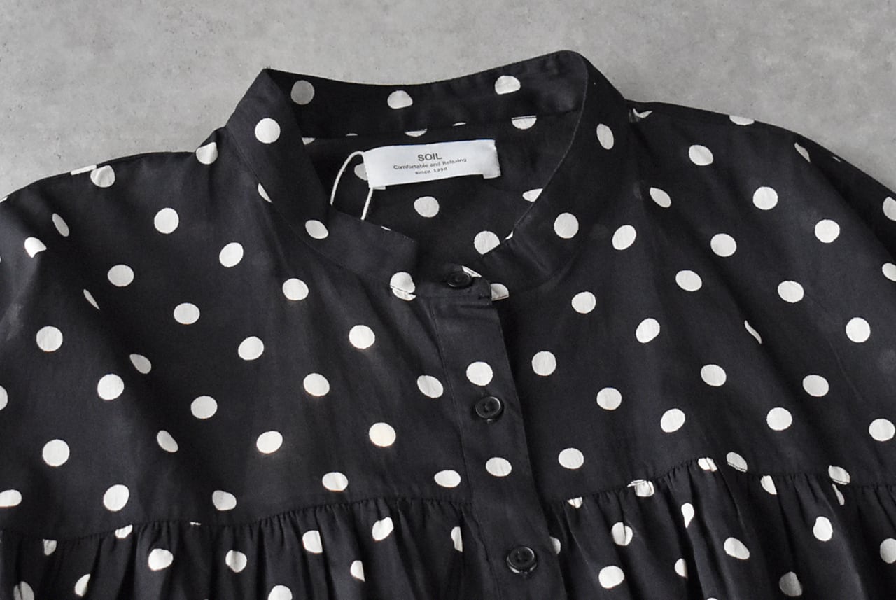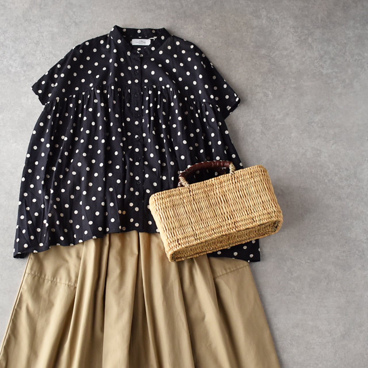 SOILから、甘くなりすぎない、大人の女性に楽しんで頂ける水玉ブラウスが届きました。SOILらしいふっくらエアリーなAラインシルエットがとっても美しい一枚です。ボディと袖が一体になったフレンチスリーブデザインは、身幅もたっぷりでリラックス満点。上品な透け感のあるコットンボイル素材もサラリとして風通しが良く、とっても涼やか。空気を纏うような軽い着心地で、暑い季節も快適に過ごして下さいね。