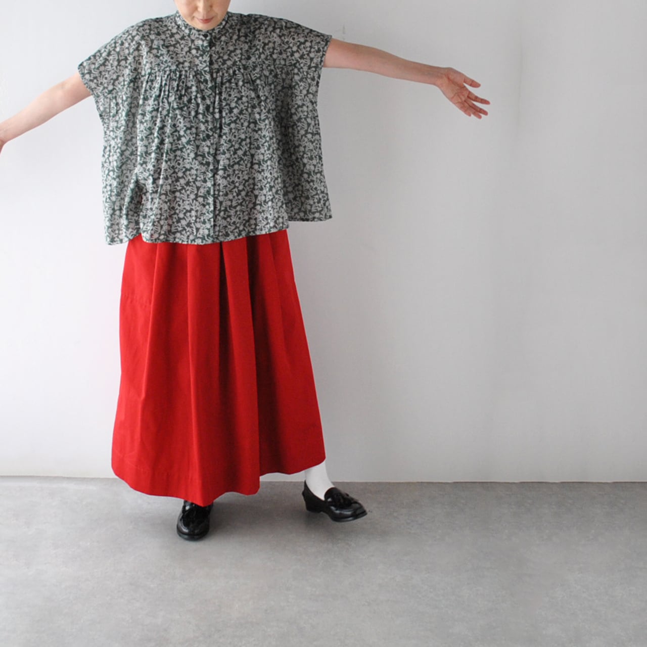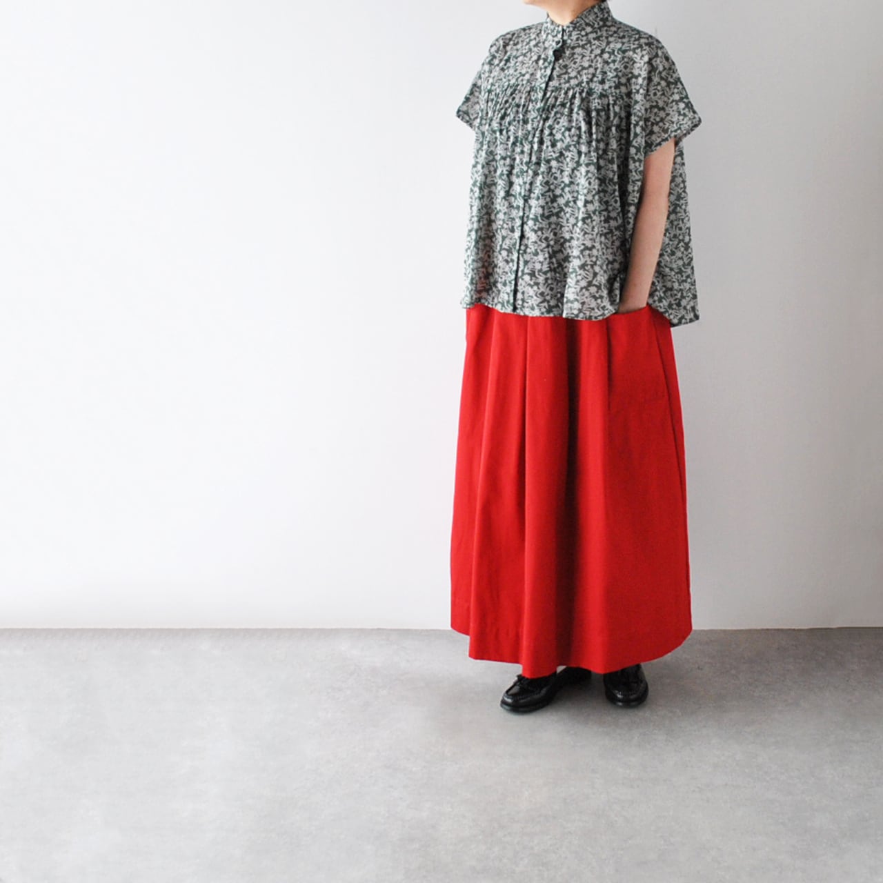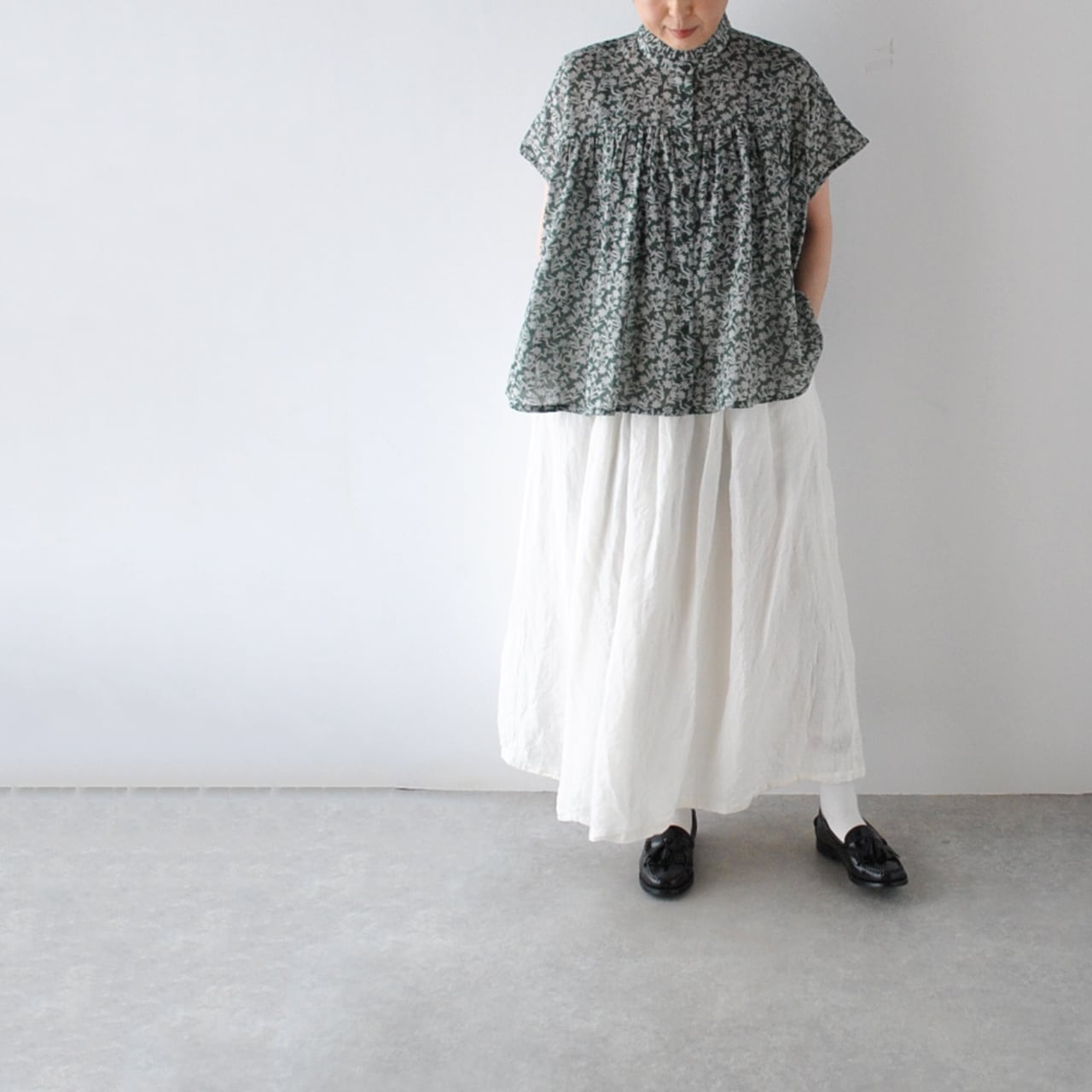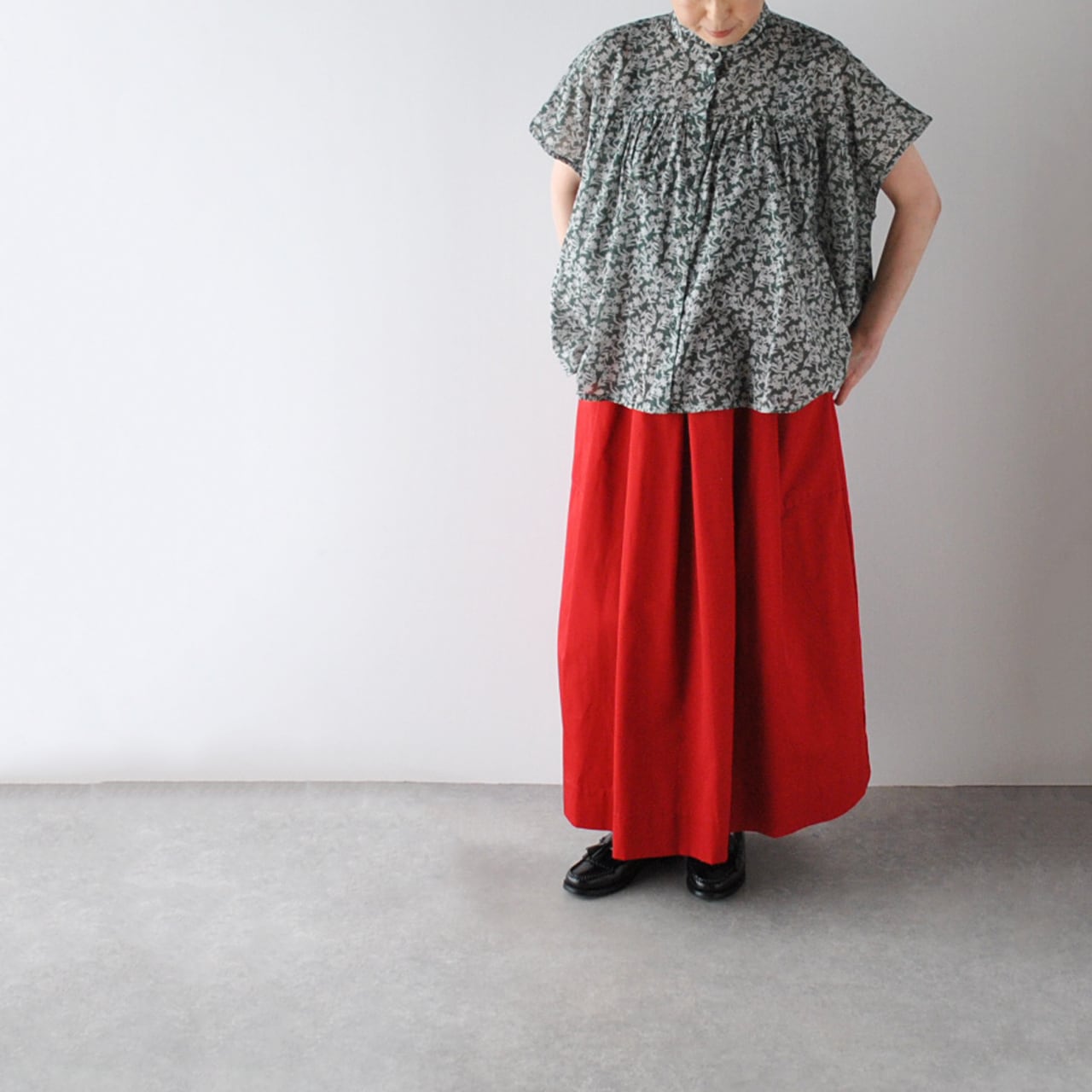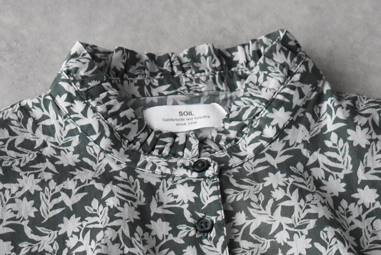SOILから、ガーゼの様な風合いの柔らかなコットンボイル素材が軽やかな、フレンチスリーブブラウスが届きました。風が通り抜ける様な涼やかな着心地が、暑くなるこれからの季節にピッタリの一枚。シックなカラーリングのフラワープリントは、大人っぽく楽しんで頂けますよ。フリルの襟と前身頃にギャザーを寄せた、ふんわりと広がる優しいシルエットも綺麗ですね。パンツにもスカートにも本当にバランス良く合わせて頂けるのでとっても重宝しますよ。