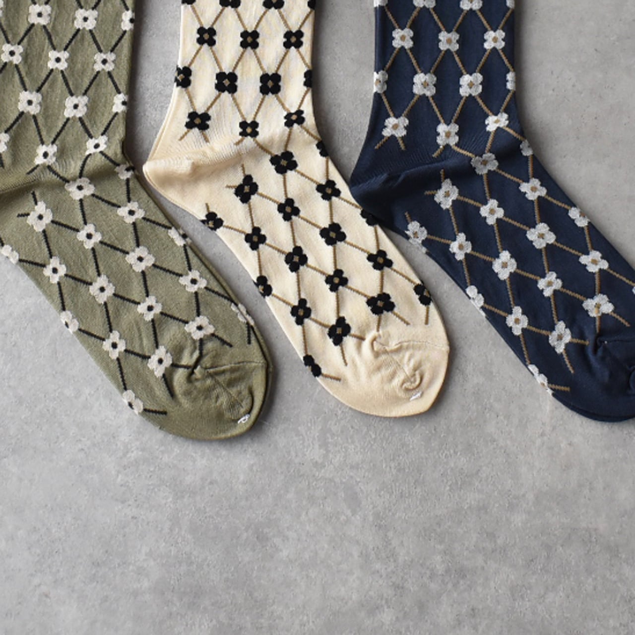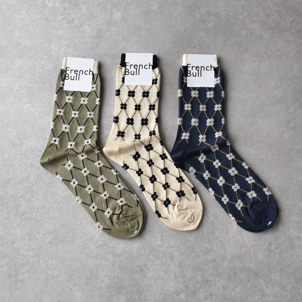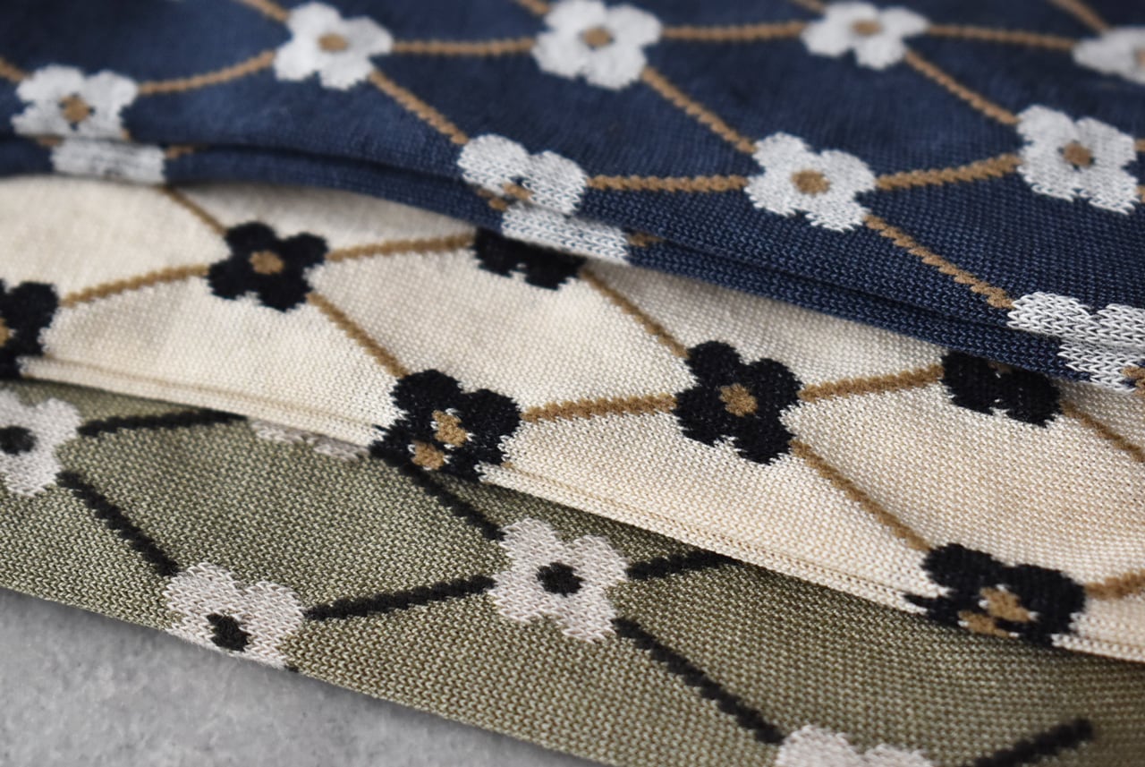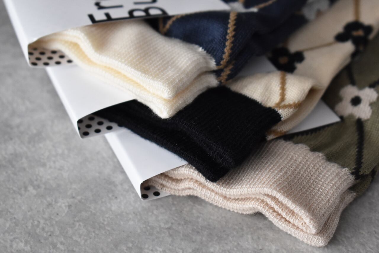 French Bullから、春のソックス第2弾が届きましたよ。こちらは、花かごをイメージしたパニエソックス。北欧チックな小花柄が可愛いですね。落ち着いたカラーが揃っていますので、モノトーン系のコーディネートにも使いやすい一足です。