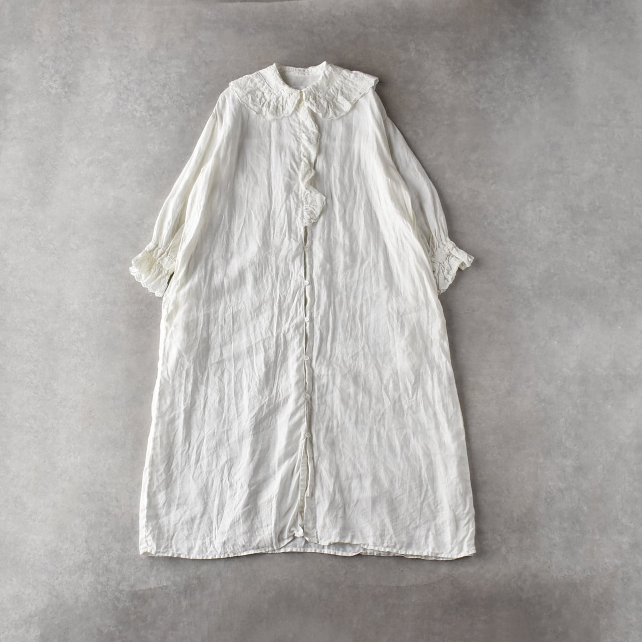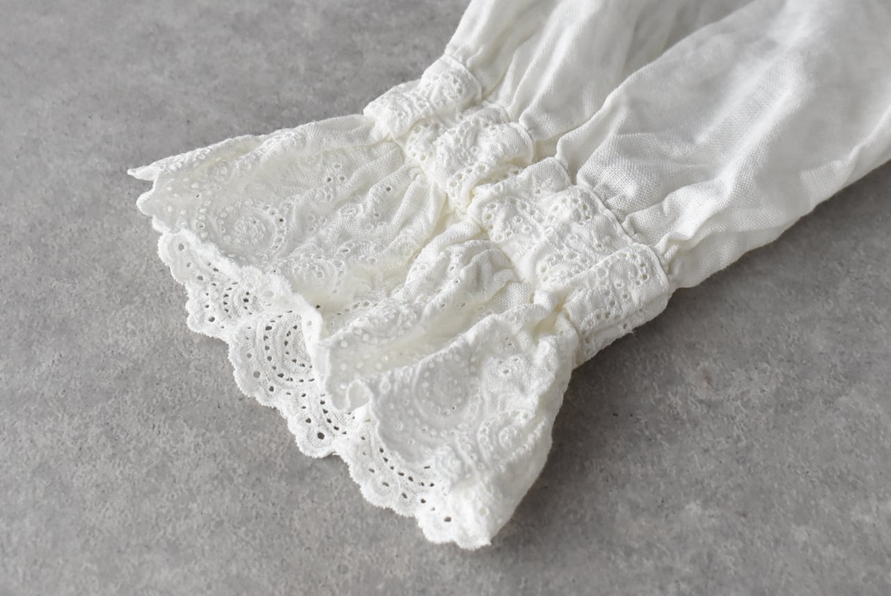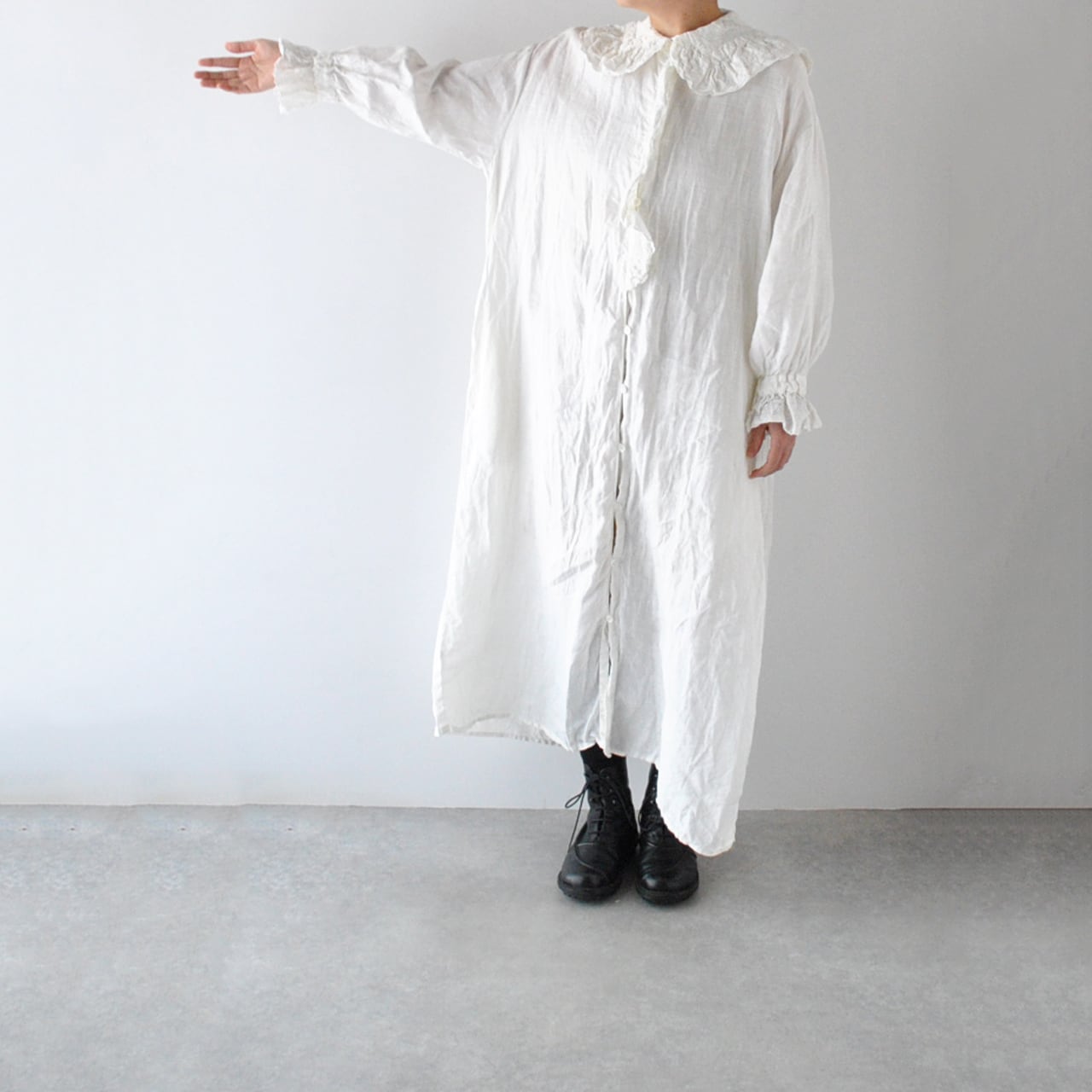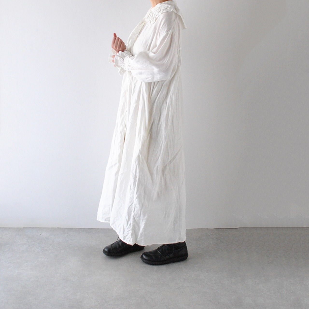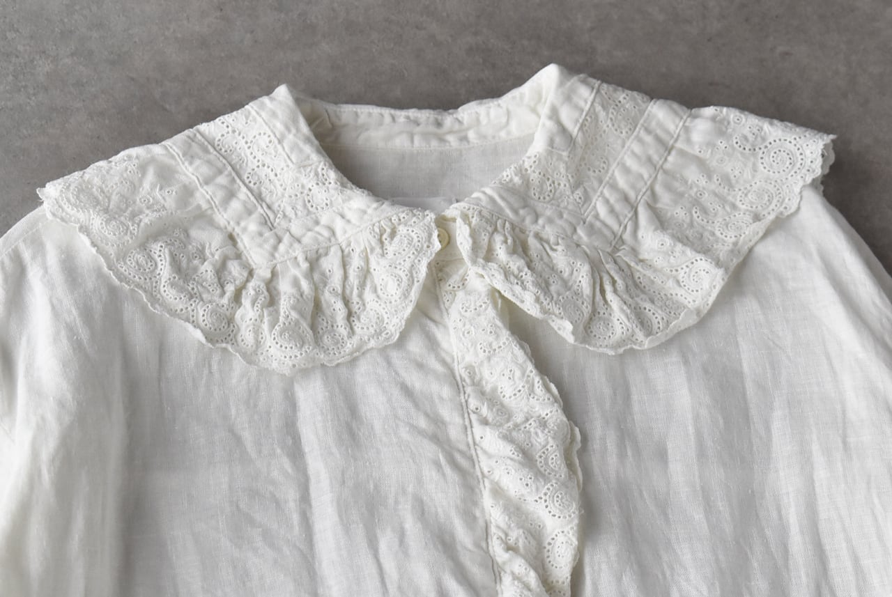 Gauze# から、架空のおとぎの国の少女のワードローブをイメージして作られた新作ワンピースが届きました。復刻したアンティークレースを襟と前立て、袖口に贅沢にあしらった、Gauze# ファンにはたまらない一枚です。古布を思わせる、ざっくり、くったりとしたリネンの風合いと、何年も時を経たかのようなくすみのある色味が生み出す佇まいは唯一無二の美しさ。袖口はゴムギャザーになっていて、ふっくらとしたフォルムにブラウジングしても可愛いですよ。甘さの中にも静かな品を宿す、Gauze# でしか味わうことの出来ない特別な一着です。