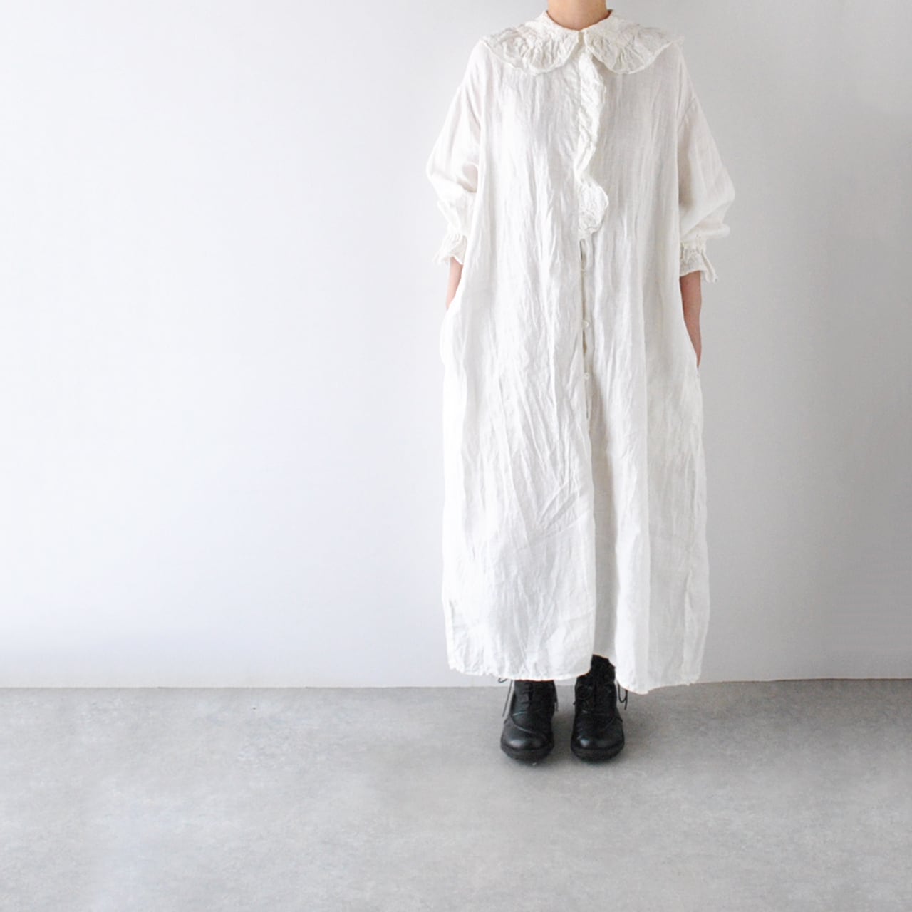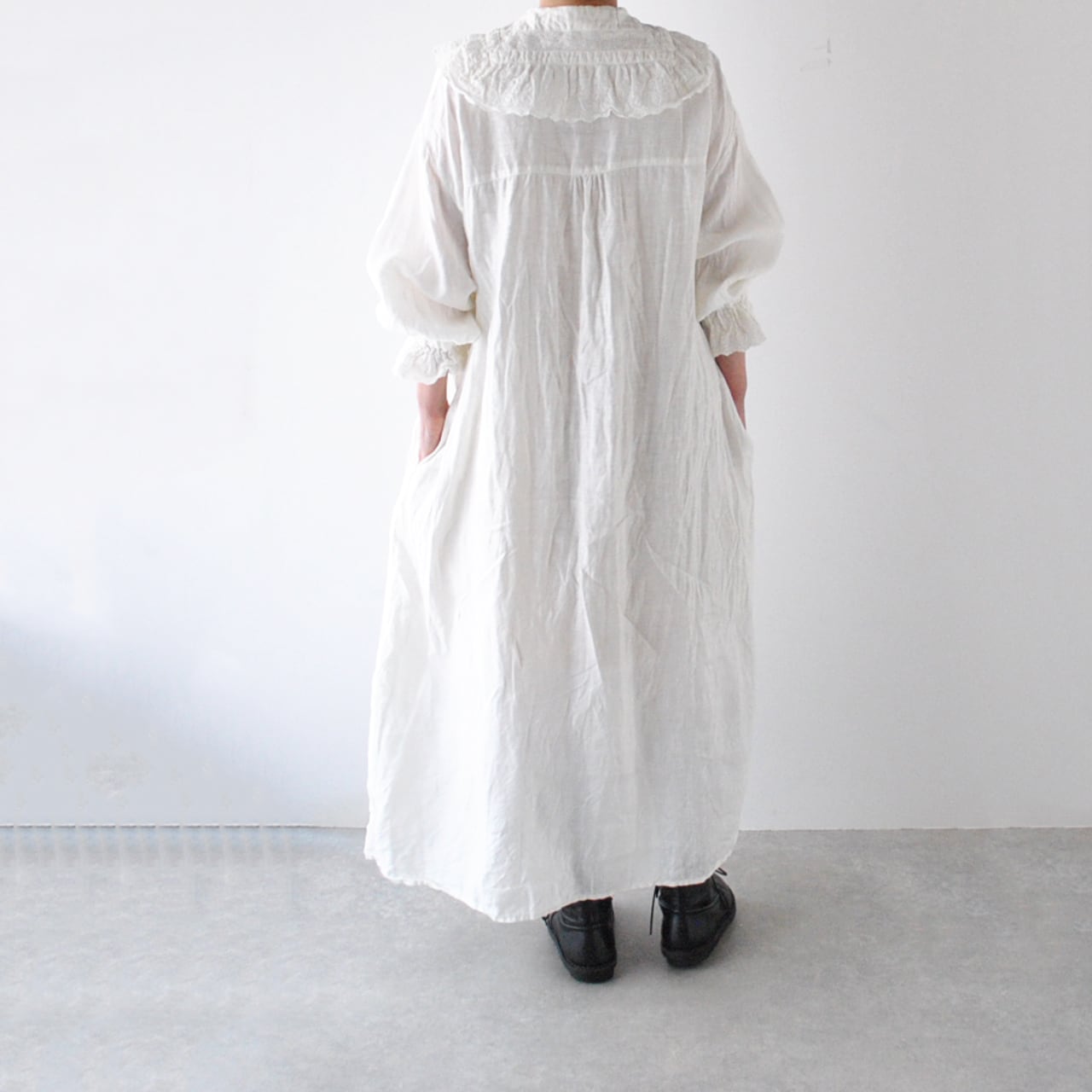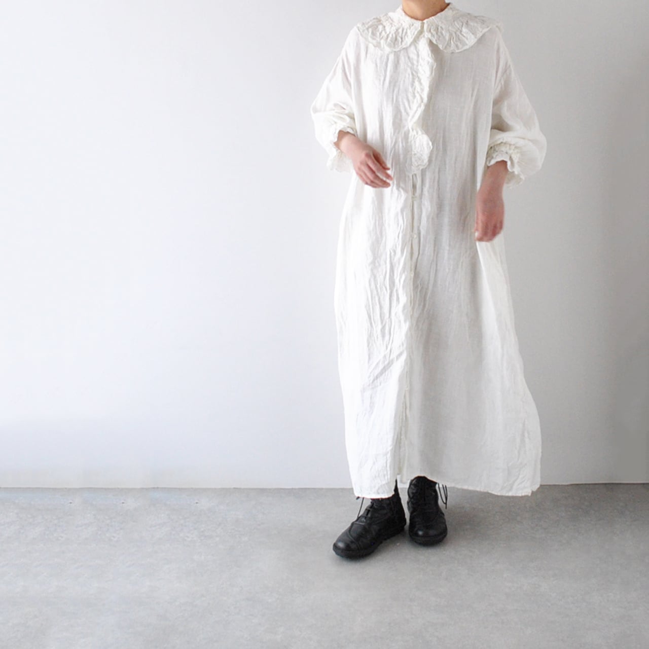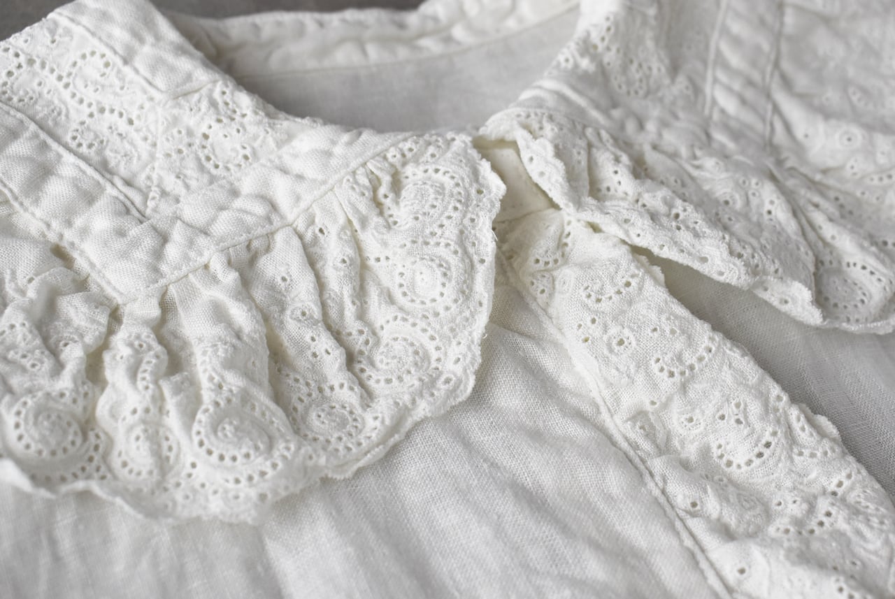 Gauze# から、架空のおとぎの国の少女のワードローブをイメージして作られた新作ワンピースが届きました。復刻したアンティークレースを襟と前立て、袖口に贅沢にあしらった、Gauze# ファンにはたまらない一枚です。古布を思わせる、ざっくり、くったりとしたリネンの風合いと、何年も時を経たかのようなくすみのある色味が生み出す佇まいは唯一無二の美しさ。袖口はゴムギャザーになっていて、ふっくらとしたフォルムにブラウジングしても可愛いですよ。甘さの中にも静かな品を宿す、Gauze# でしか味わうことの出来ない特別な一着です。