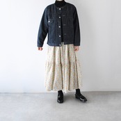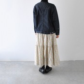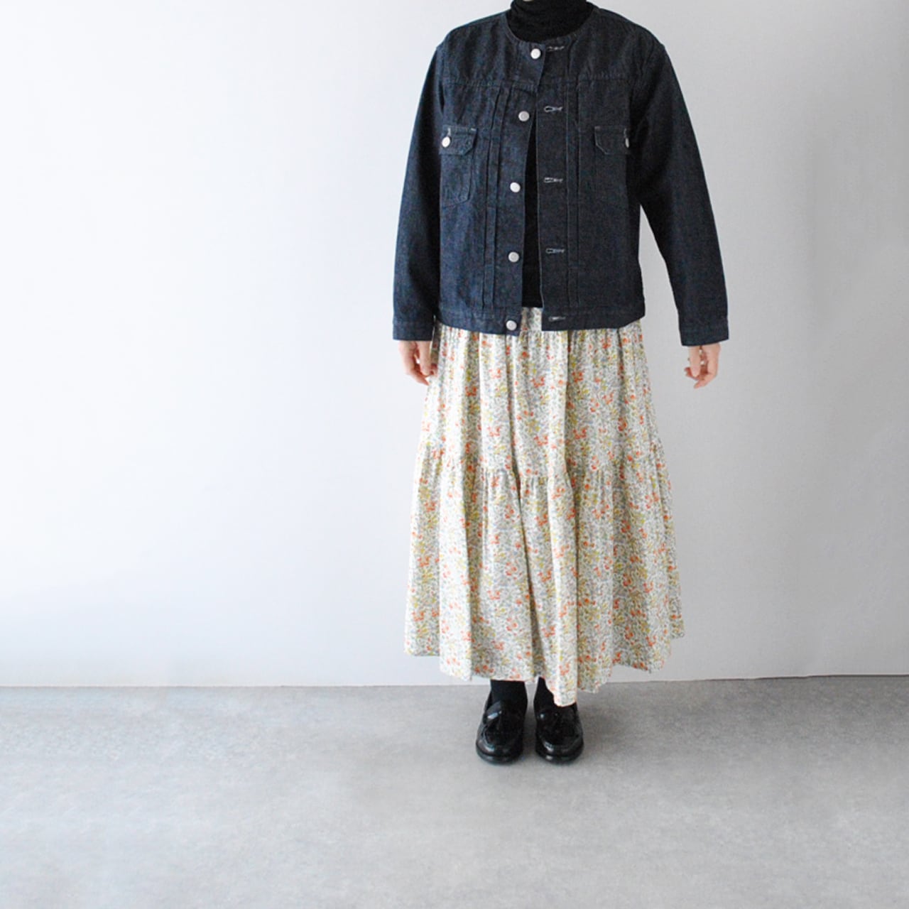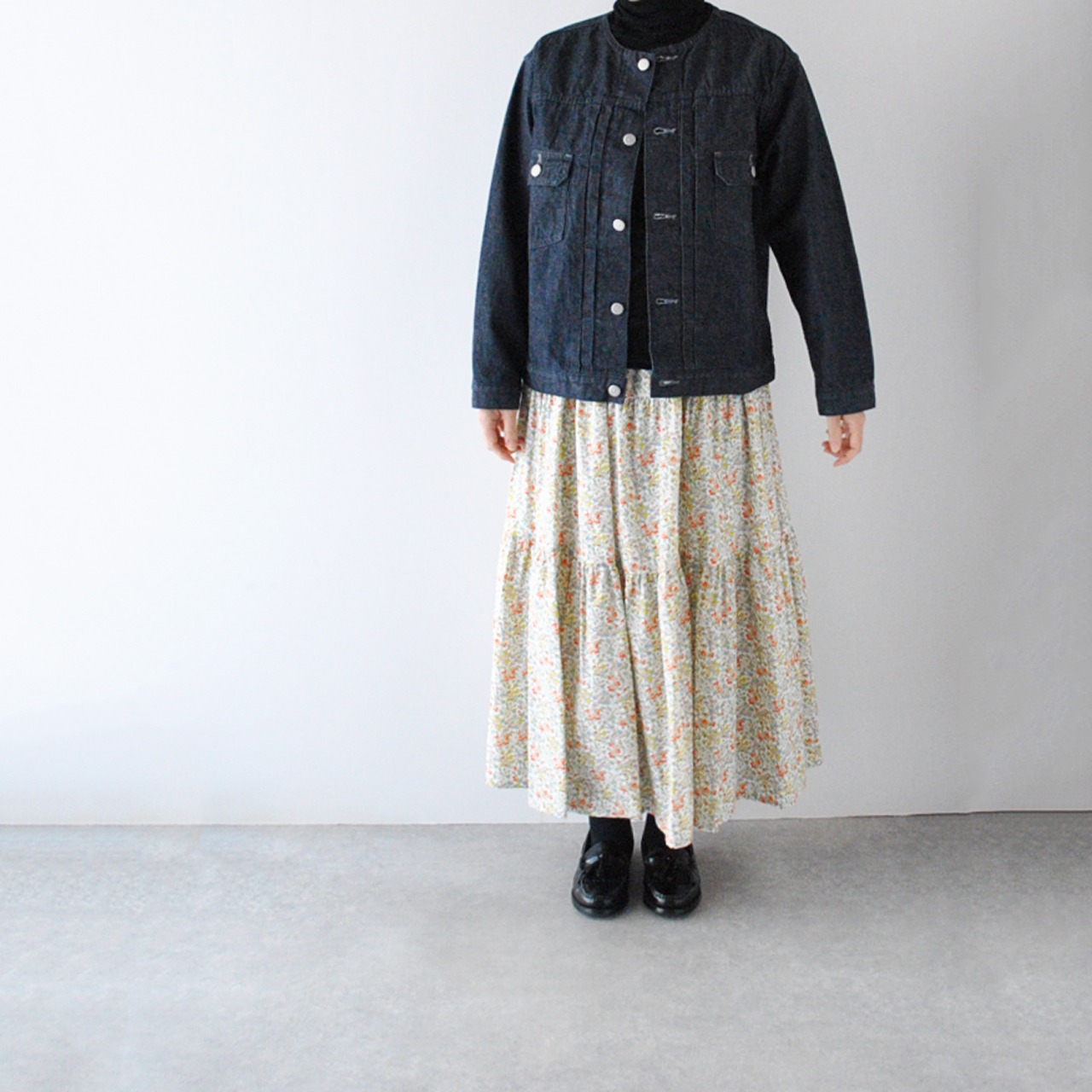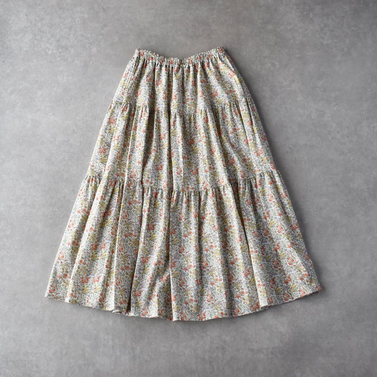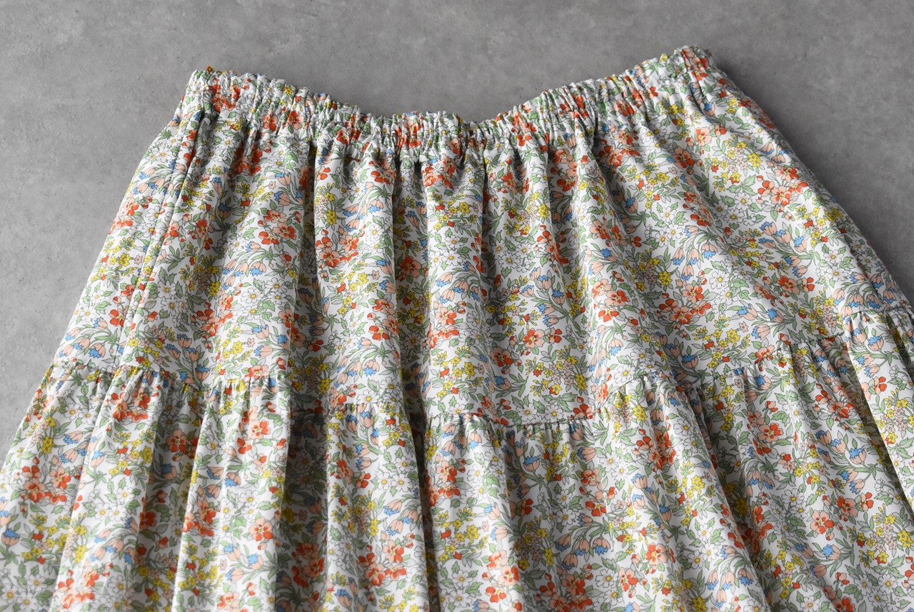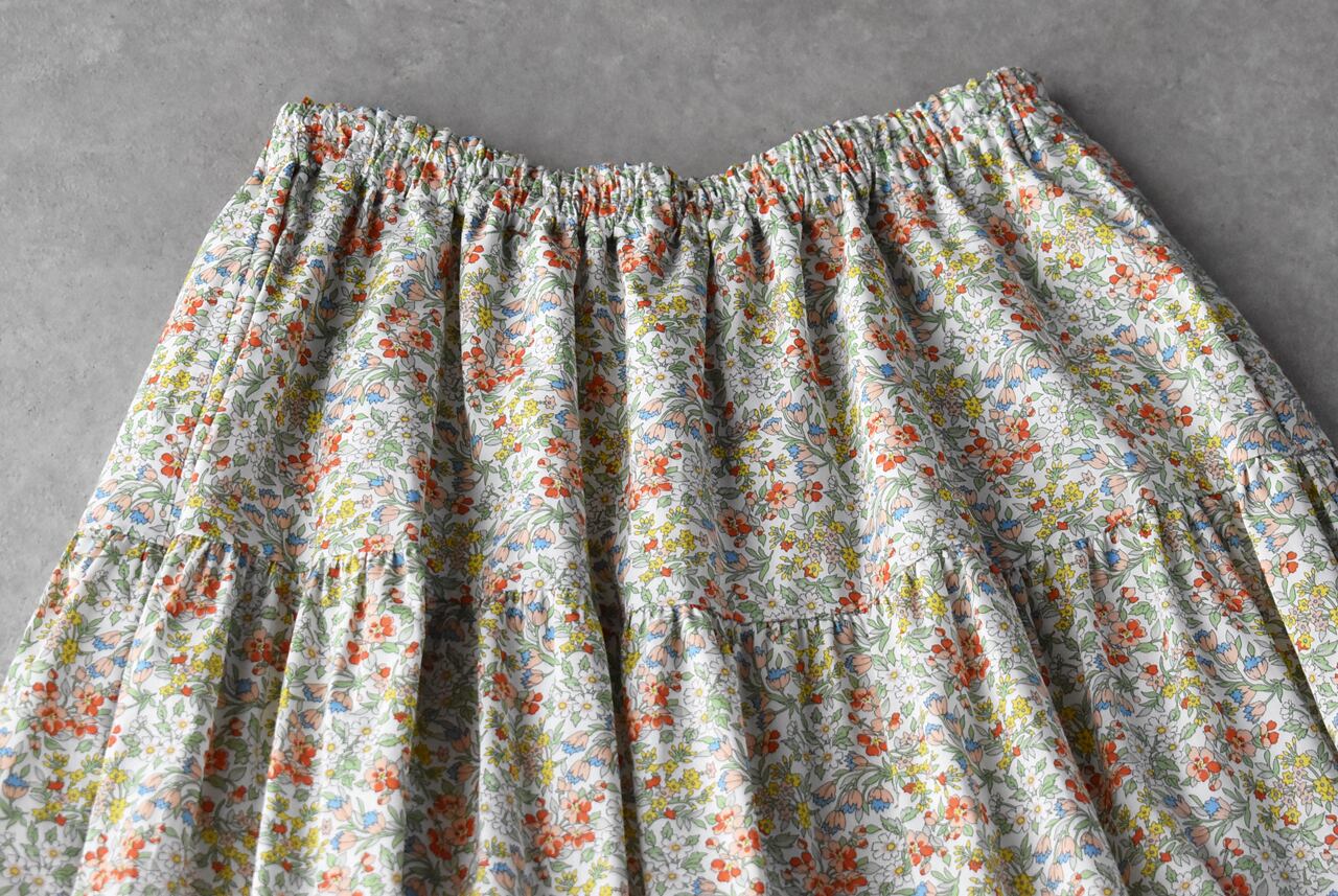 Vent d'ouestからリバティプリントの小花柄がクラシカルなギャザースカートが届きました。2段の切替えを入れたティアードデザインがとても美しく、シンプルなトップスと合わせるだけで上品に女性らしく楽しんで頂ける一枚です。さらりとした肌触りの薄手のタナローンコットンでとっても軽い履き心地。裏地付きなのも安心感がありますね。ちょっとかしこまったシーンにもぴったりなので、一枚あるときっと重宝してくれますよ。ゴムウエスト。