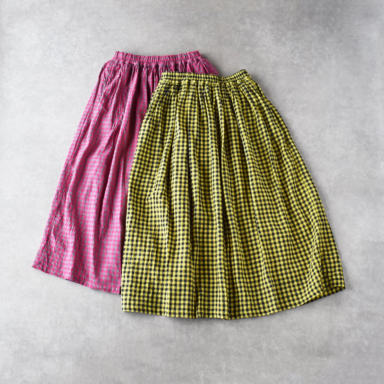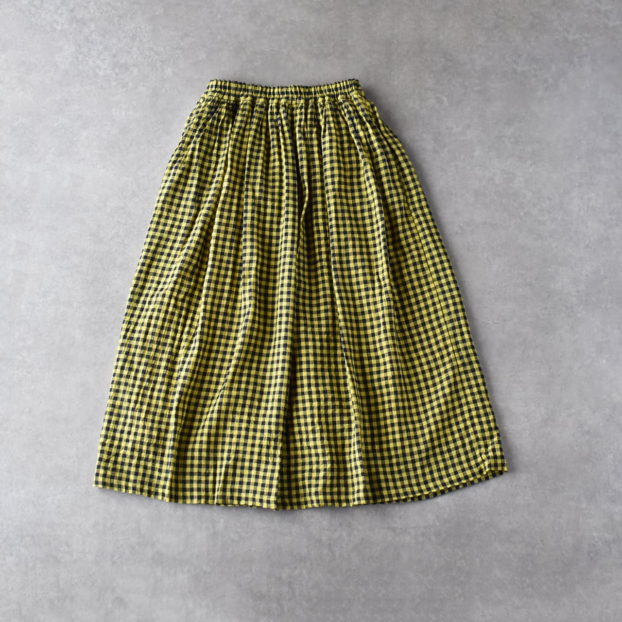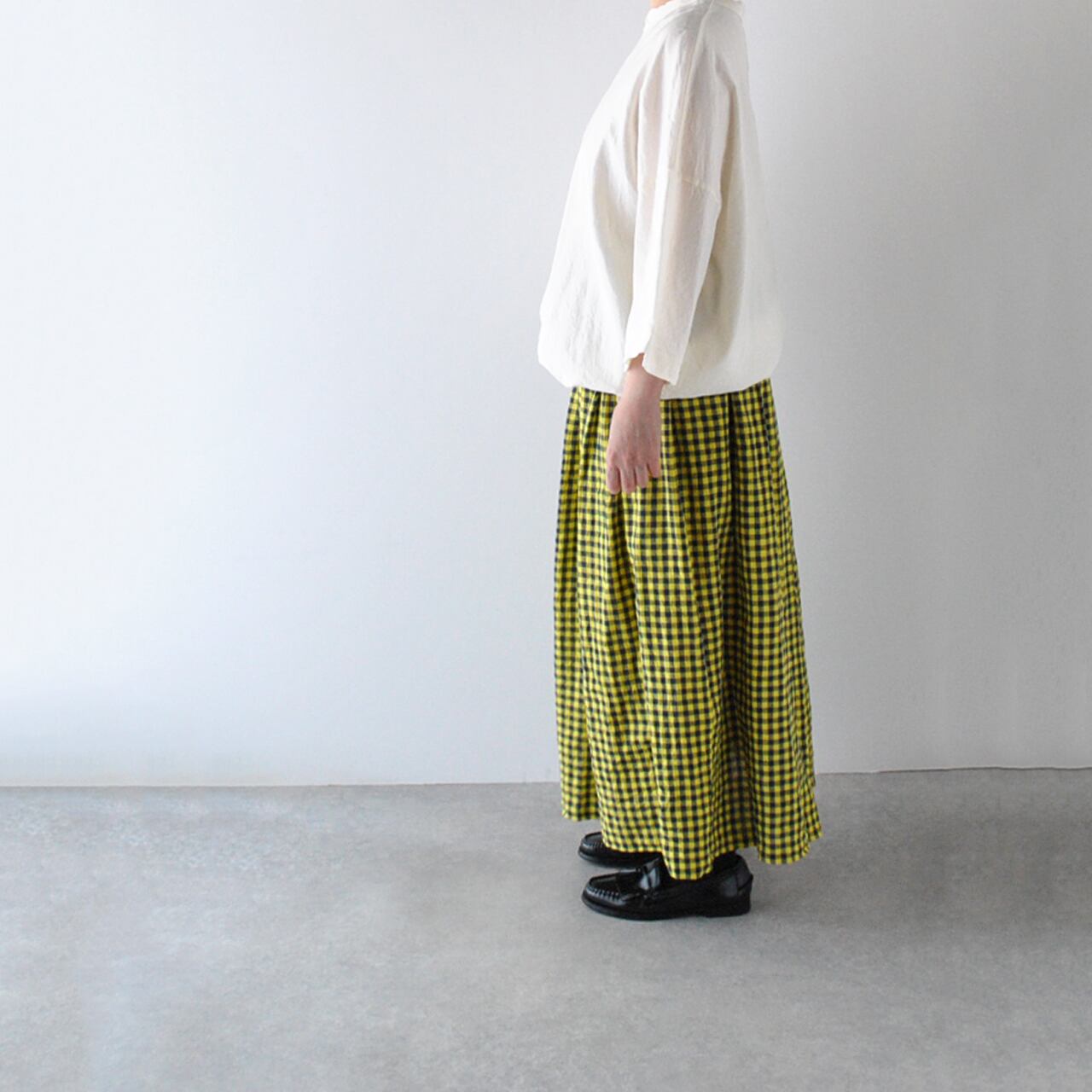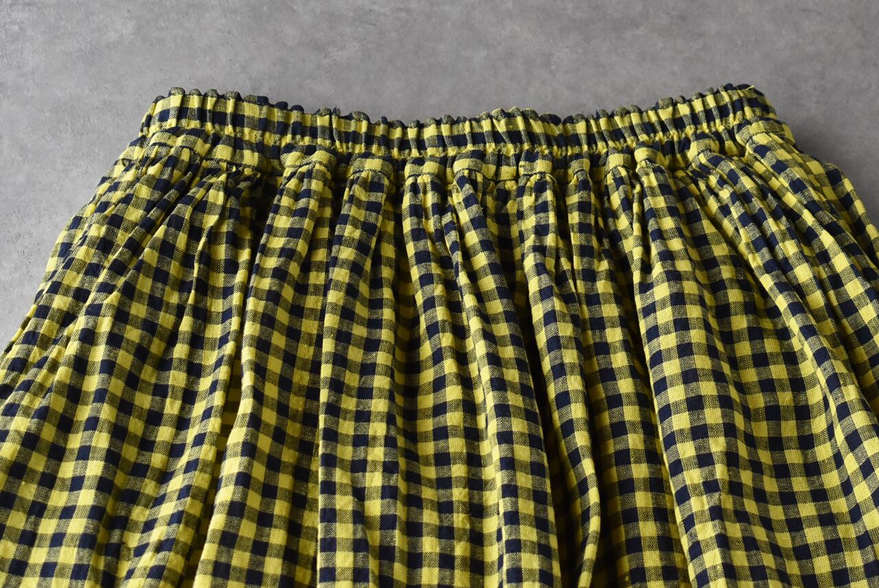 ichi Antiquitésから、個性的な色使いのギンガムチェック柄が楽しいギャザースカートが届きました。イエロー×ネイビー、ピンク×グレーの色合わせは、どちらも可愛いですよ。これからの季節はTシャツやブラウスはもちろん、肌寒い時期はGジャンやニットなんかとも合わせやすいですよ。裏地付きなのも安心ですね。リネン×コットンのくたっとした風合いと、優しく広がる美しいシルエットをじっくりと味わって欲しい一枚です。