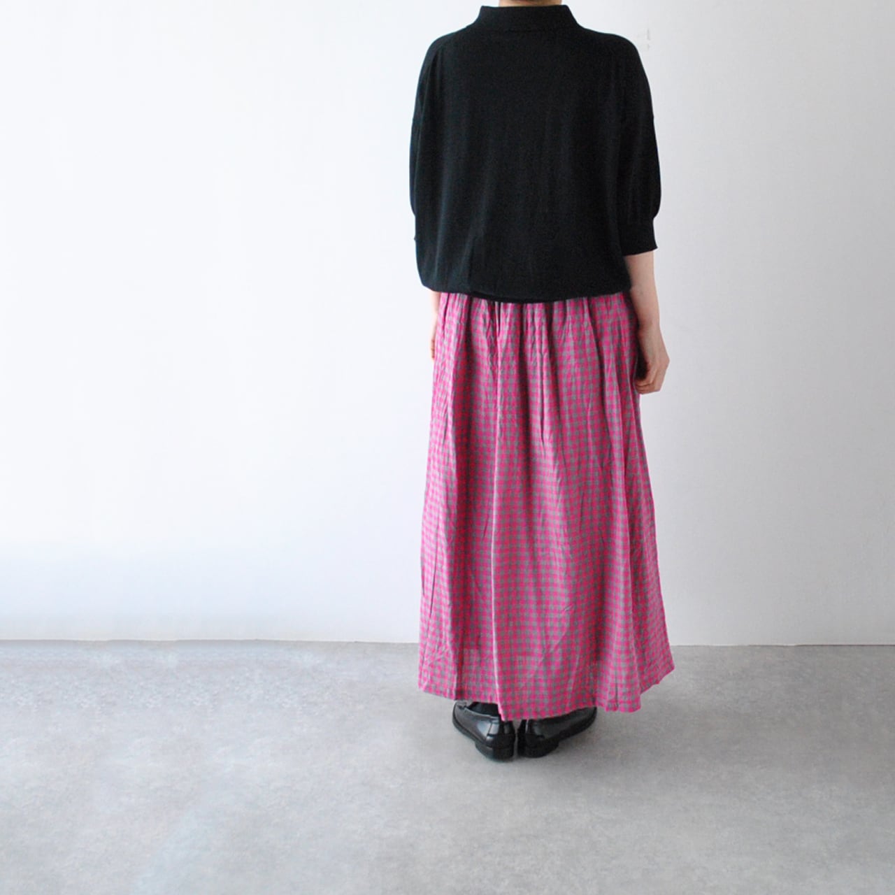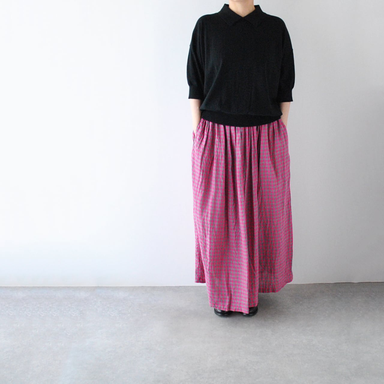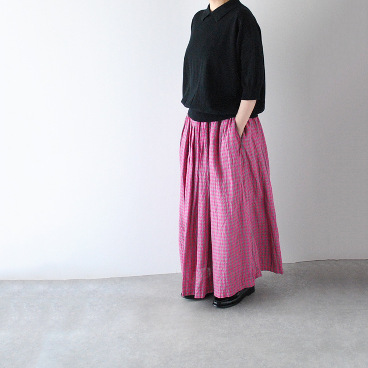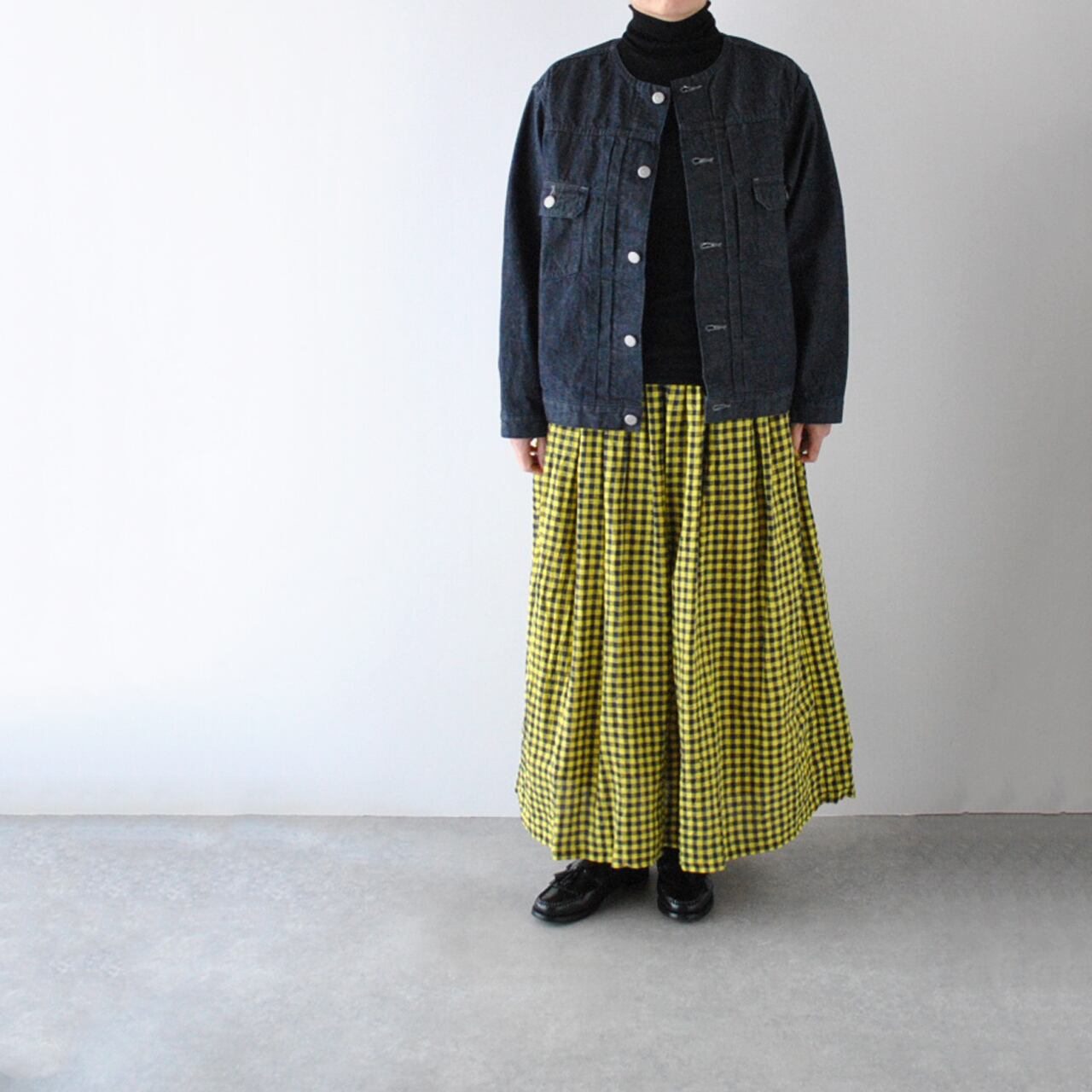 ichi Antiquitésから、個性的な色使いのギンガムチェック柄が楽しいギャザースカートが届きました。イエロー×ネイビー、ピンク×グレーの色合わせは、どちらも可愛いですよ。これからの季節はTシャツやブラウスはもちろん、肌寒い時期はGジャンやニットなんかとも合わせやすいですよ。裏地付きなのも安心ですね。リネン×コットンのくたっとした風合いと、優しく広がる美しいシルエットをじっくりと味わって欲しい一枚です。