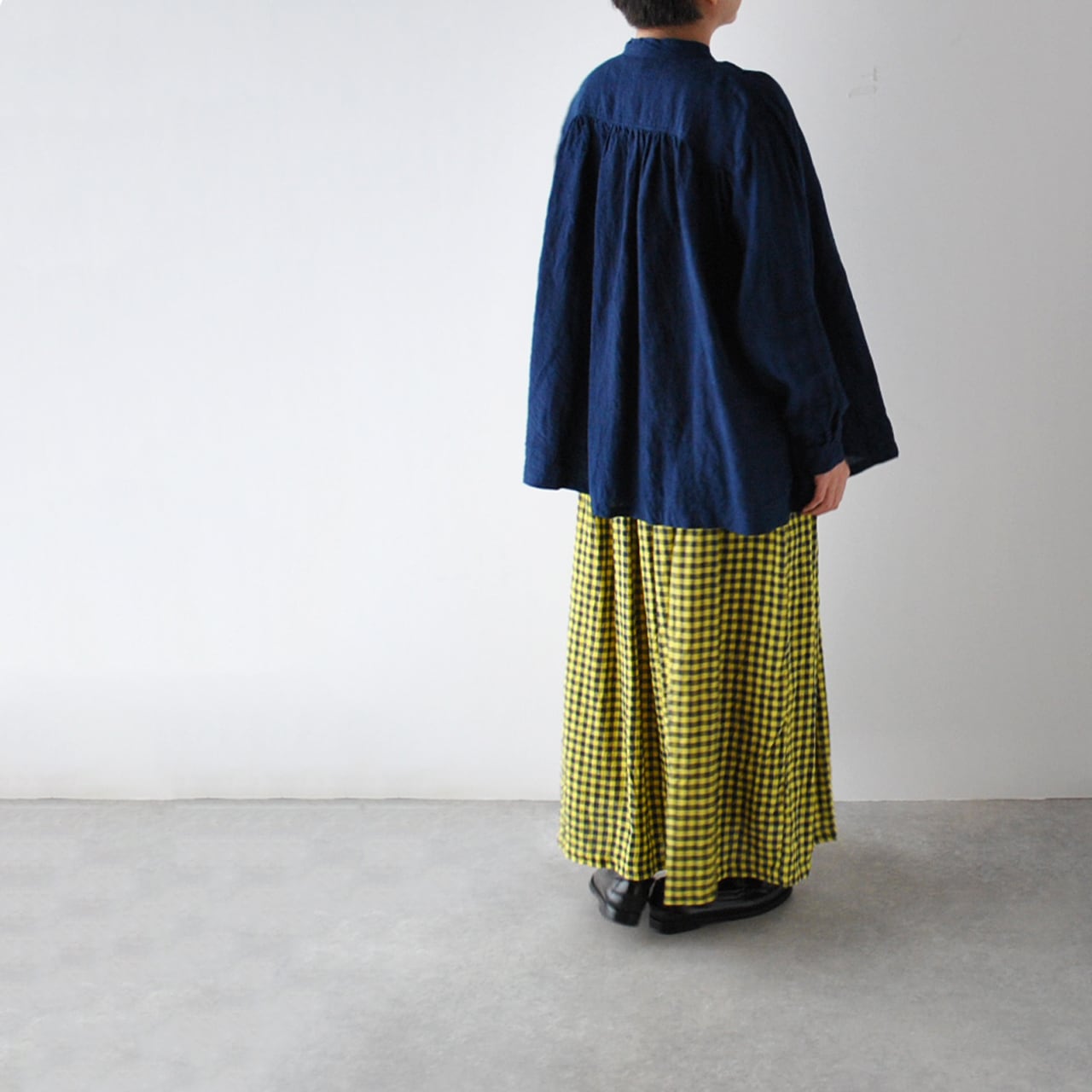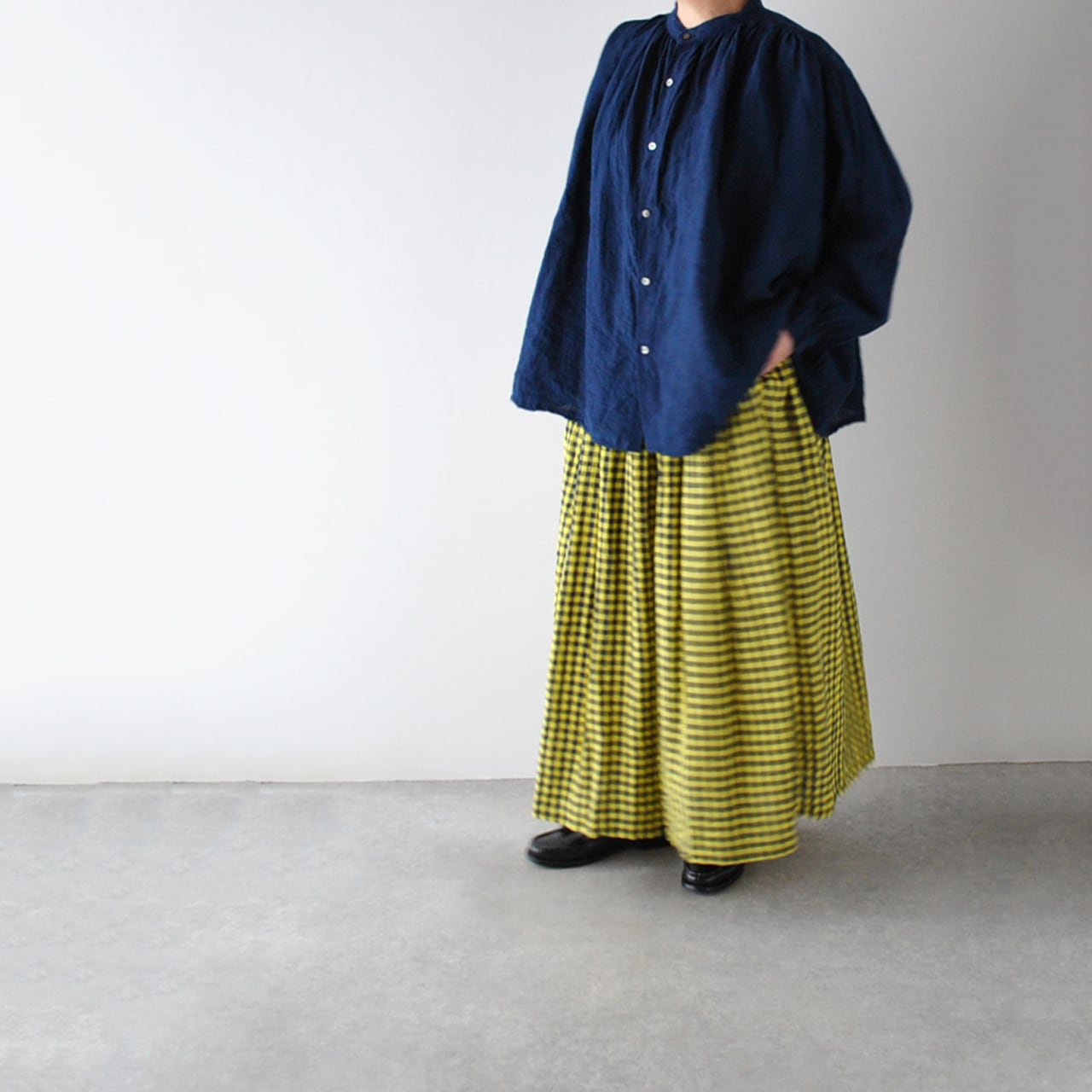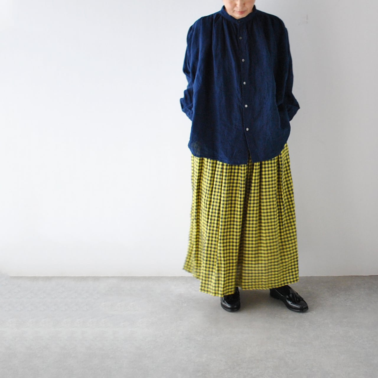 ichi Antiquitésから、個性的な色使いのギンガムチェック柄が楽しいギャザースカートが届きました。イエロー×ネイビーの色合わせがとても可愛いです。これからの季節はTシャツやブラウスはもちろん、肌寒い時期はGジャンやニットなんかとも合わせやすいですよ。裏地付きなのも安心ですね。リネン×コットンのくたっとした風合いと、優しく広がる美しいシルエットをじっくりと味わって欲しい一枚です。