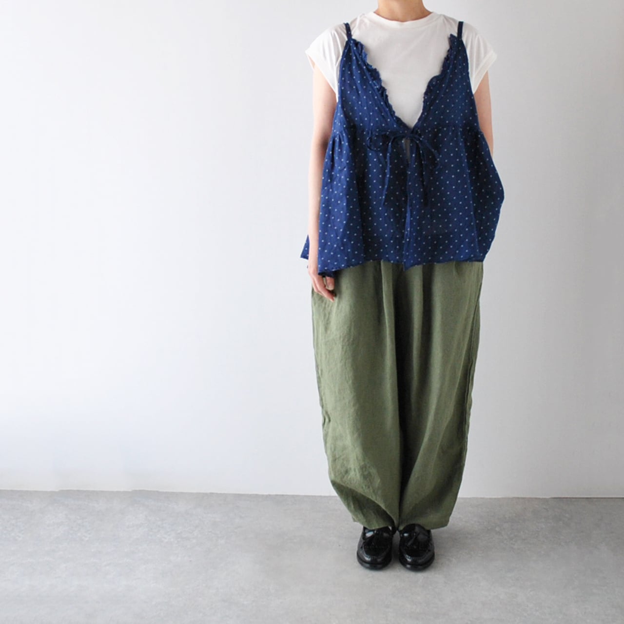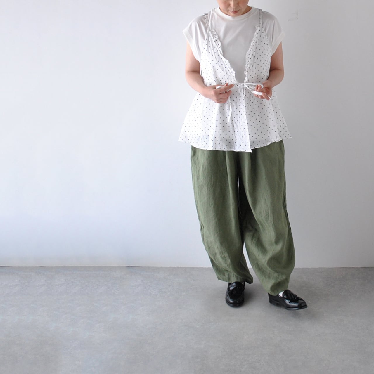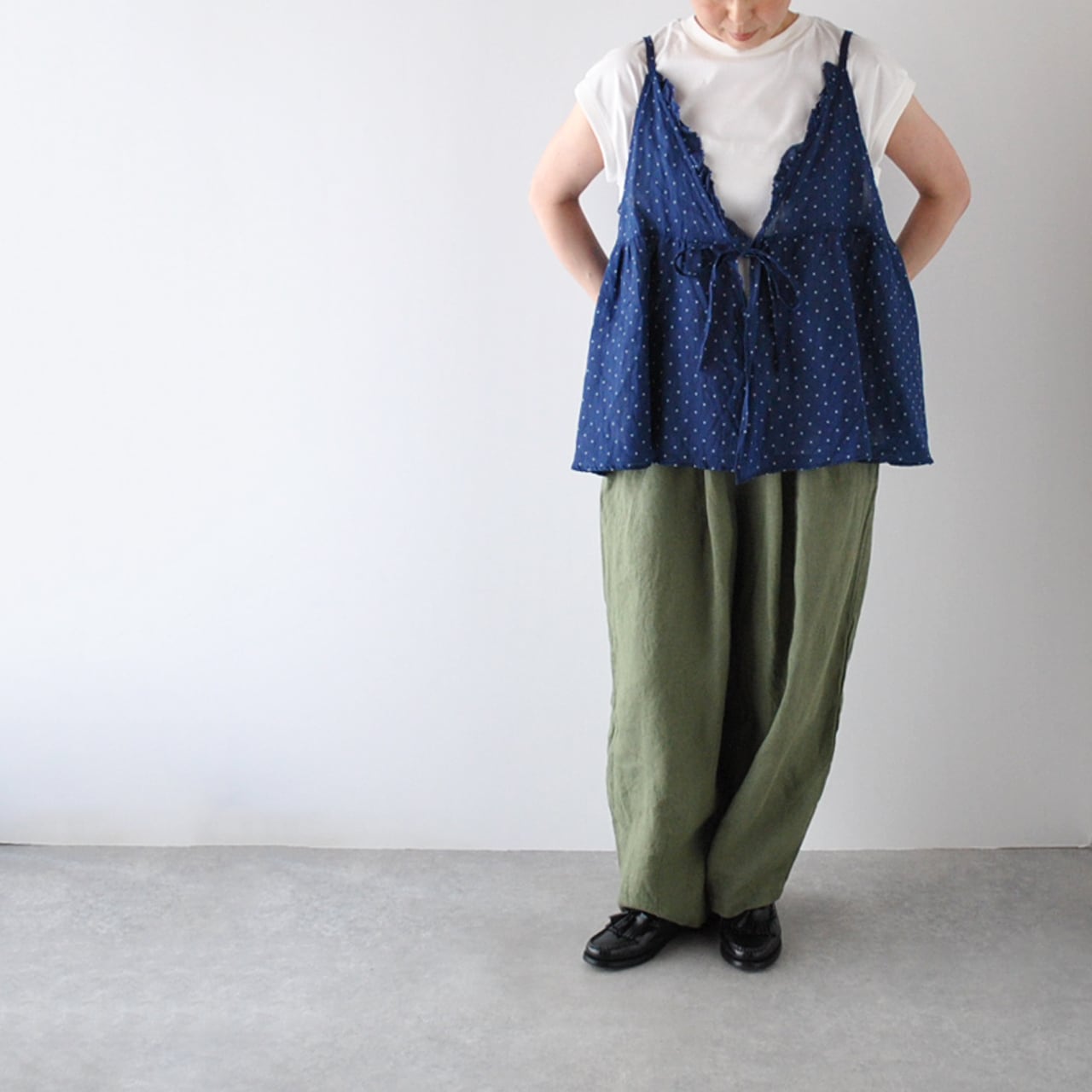Gauze# から、春夏の装いに豊かな表情を与えてくれる、カシュクールキャミソールが届きました。Tシャツ+イージーパンツといったラフなスタイルにサッと一枚プラスして頂ければ、グッと雰囲気よく仕上げてくれますよ。ほんのりと透け感が上品なラミーリネンもしなやかな素材感で、繊細で美しいドレープを生み出します。肩紐はアジャスター付きで無段階の調節が可能。
