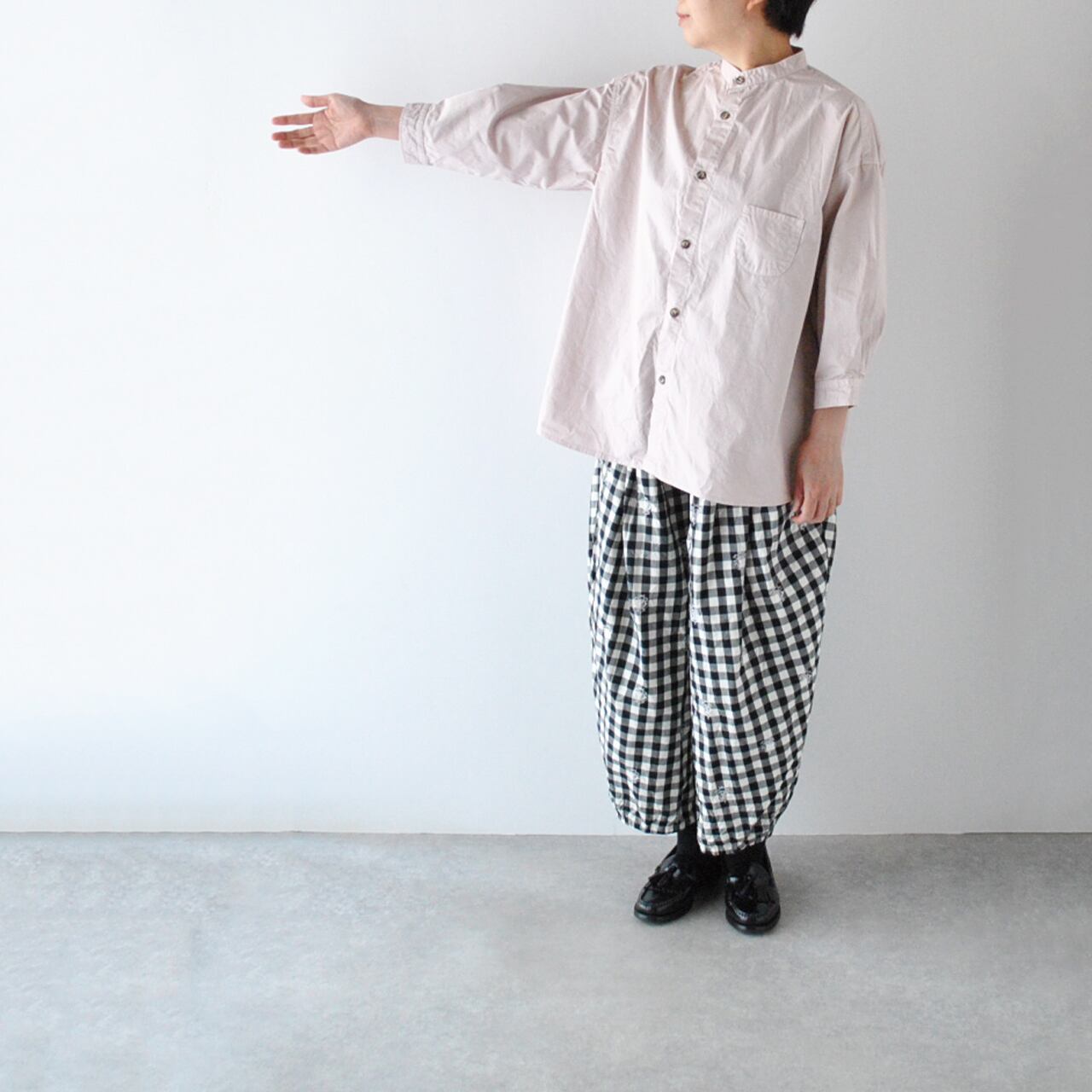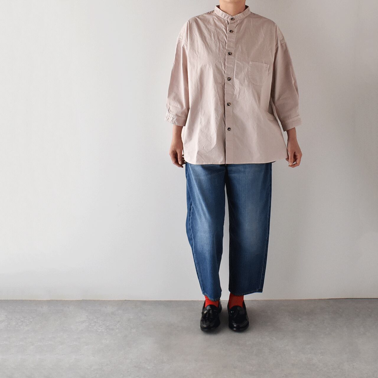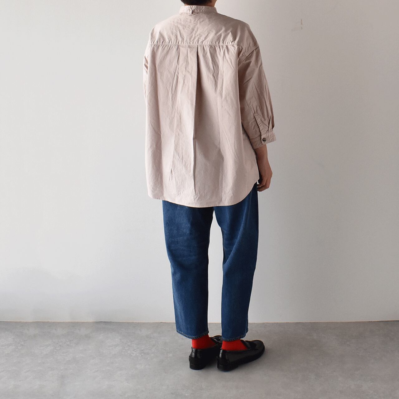 pritから、毎シーズン、カラーを変えて楽しませてくれる人気のスタンドカラーシャツが届きました。袖が7分丈なので、とても軽やかな印象で楽しんで頂ける一枚。ゆったりとしたサイズ感+少し長めの丈感は、体型の気になる部分をカバーしつつ、スッキリとしたシルエットで着て頂けますよ。今シーズンは春らしいピンクとベージュ、深みのあるこっくりとしたパープルの3色をセレクトしました。