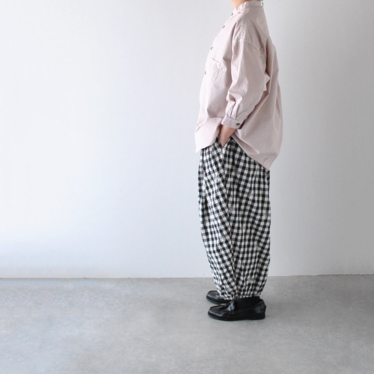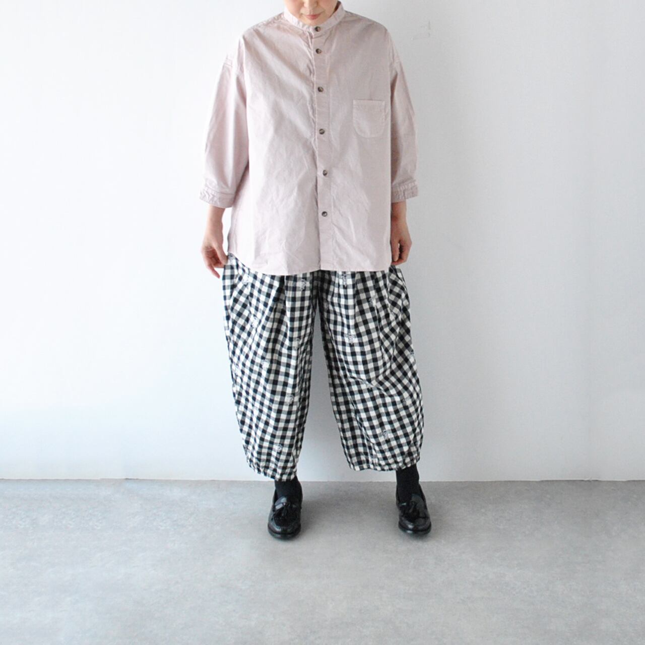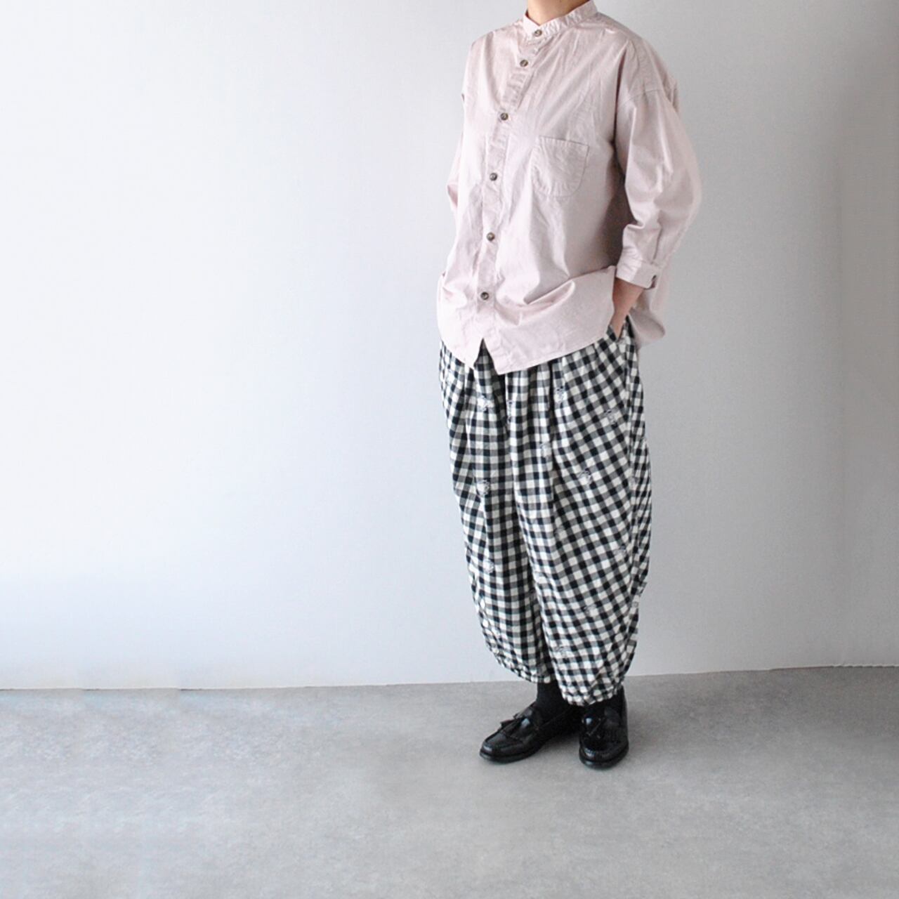 pritから、毎シーズン、カラーを変えて楽しませてくれる人気のスタンドカラーシャツが届きました。袖が7分丈なので、とても軽やかな印象で楽しんで頂ける一枚。ゆったりとしたサイズ感+少し長めの丈感は、体型の気になる部分をカバーしつつ、スッキリとしたシルエットで着て頂けますよ。今シーズンは春らしいピンクとベージュ、深みのあるこっくりとしたパープルの3色をセレクトしました。