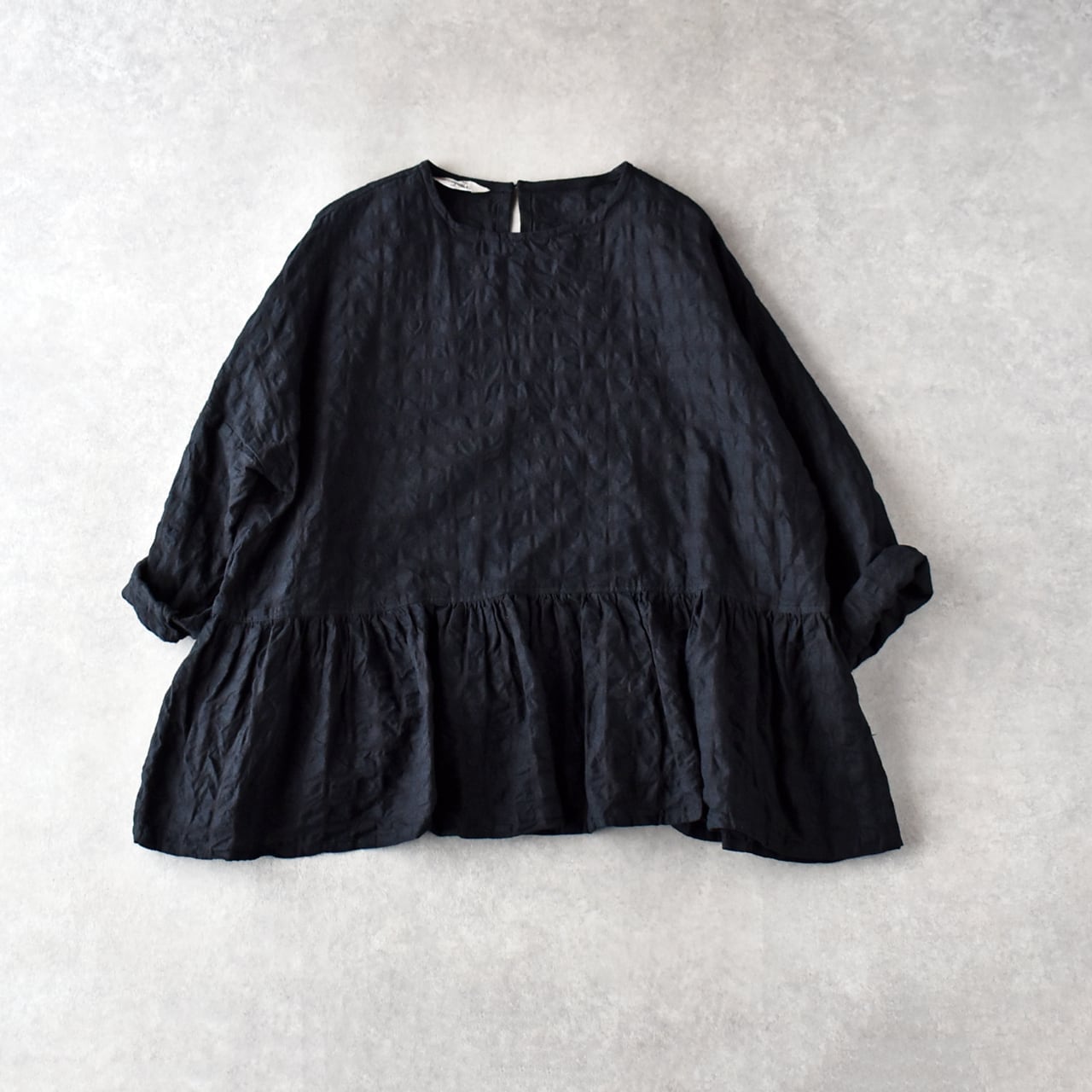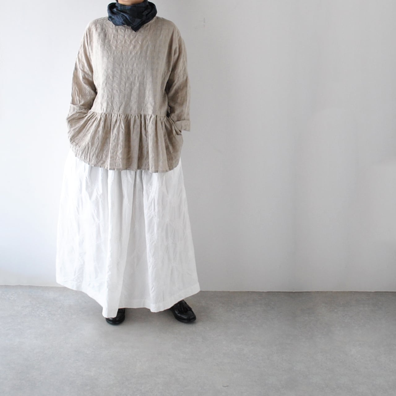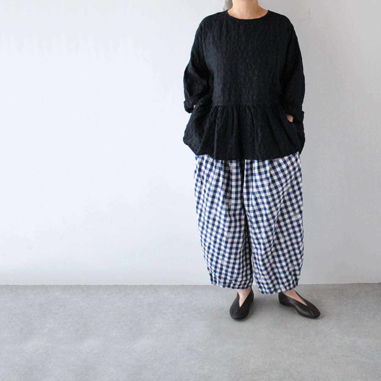 ichi Antiquitésから、ウエストの切替にギャザーを寄せた愛らしいシルエットで楽しめる、綿麻素材のプルオーバーブラウスが届きました。一見無地に見えますが、同系色のギンガムチェック柄になっていて、ポコポコとしたウネのある生地感も風合い豊かな一枚。ボリューム感のあるスカートやパンツと合わせてシンプルに楽しんでくださいね。袖は少し長めなので、ロールアップすると雰囲気が出てオススメですよ。