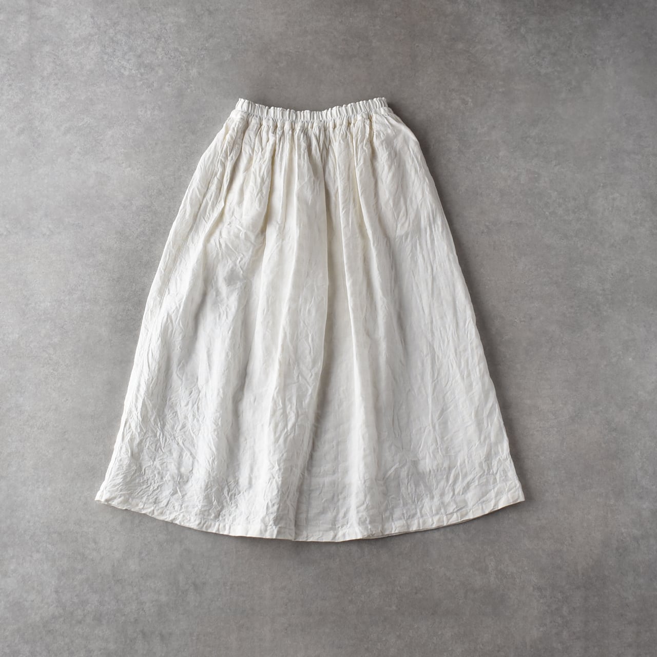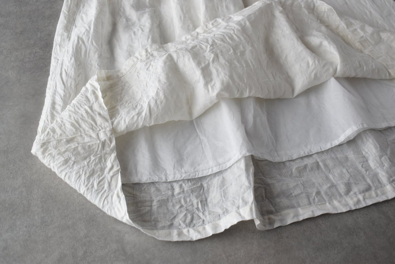 ichi Antiquitésから、たっぷりの丈感と程よいボリューム感が美しい、綿麻素材のギャザースカートが届きました。一見無地に見えますが、同系色のギンガムチェック柄になっていて、ポコポコとしたウネのある生地感も風合い豊かな一枚。Tシャツとシンプルに合わせるだけでも本当に美しいシルエットに仕上がりますよ。裏地付きなのも安心ですね。白色とキナリ色のスカートは、どんなお色のトップスともコーディネートしやすいので、一枚あると本当に便利ですよ。