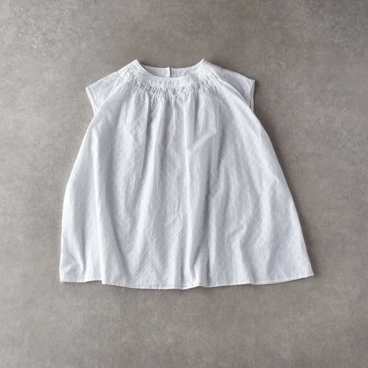 ichi Antiquitésから、サークルが連なったようなジャガード柄がレトロな雰囲気のプルオーバーブラウスが届きました。襟元に繊細なギャザーをぐるりと寄せたドレープ感のある美しいシルエット。程よい透け感と、フレンチスリーブのデザインも上品な印象ですよ。空気を纏うような軽い着心地で、暑い季節も涼やかに楽しめます。