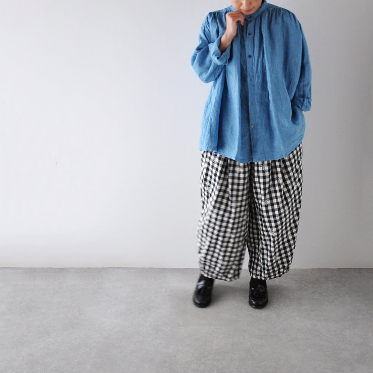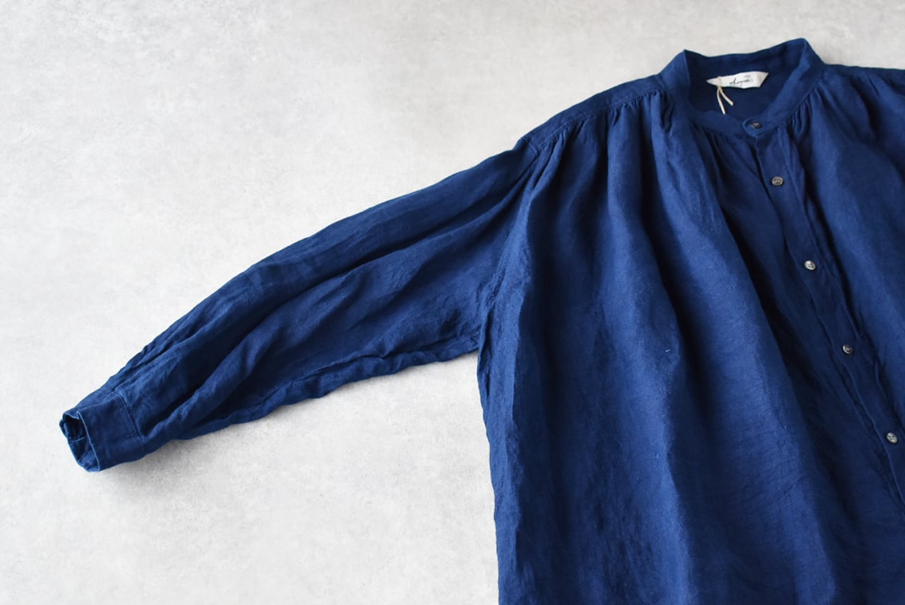ichi Antiquitésから、ふっくらと織り上げたリネンにインディゴ染めを施したブラウスが届きました。藍染めのような深みのあるインディゴブルーと、着古したようなアンティーク感のあるブリーチ、どちらも本当に素敵なお色ですよ。襟元、肩口、背中にたっぷりと寄せた繊細なギャザーが生み出す美しいシルエットは雰囲気たっぷり。広い身幅のゆったりとした着心地もリラックス感満点。着る程に風合いの増す、経年変化も楽しみですね。ウエストインで着て頂くのもオススメですよ。