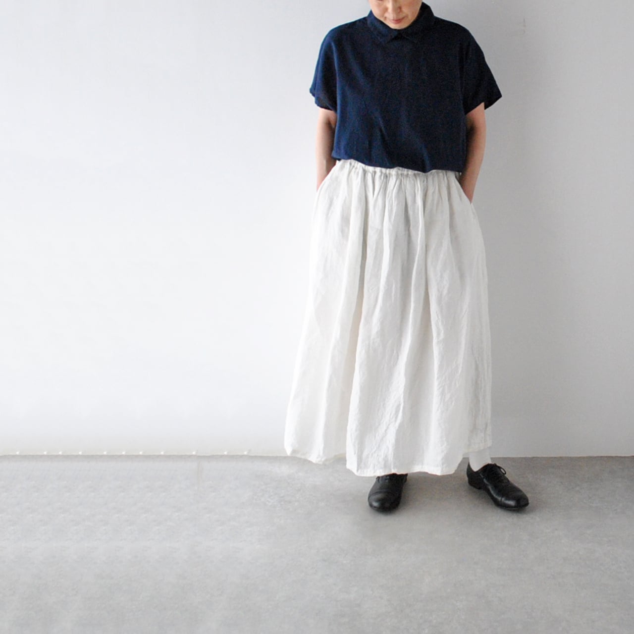 ichi Antiquitésから、ふっくらと織り上げた風合い豊かなリネンが心地よい、ギャザースカートが届きました。何と言ってもこの透明感のある白色と、温かみのある優しい表情がとっても魅力的な一枚。このスカートを合わせると、いつものトップスが何倍にも素敵に見える気がします(笑)動く度に緩やかに揺れる姿も本当に美しいですよ。裏地付きなのも嬉しいですね。「白スカートに初めてトライしてみたいな~」という方にも是非オススメしたいです!ヒモ調節可能なゴムウエスト。