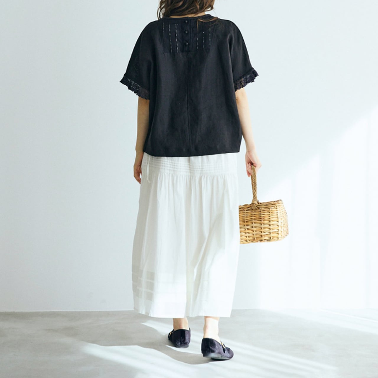 MAGALIから、暑い季節でも軽やかに上品に楽しめるリネン素材のプルオーバーブラウスが届きました。胸元にはピンタックの様に繊細なコットンレースを、袖口には華奢な糸で結んだリネンレースを、背中には小さなクルミボタンを3つあしらった、MAGALIらしい愛らしさが詰まった一枚ですよ。ベルギー産のコルトレイクリネンのふっくら柔らかな質感も上質で、空気を纏う様な軽い着心地。デニムなどのラフなボトムと合わせてもとっても品よく仕上げてくれますよ。