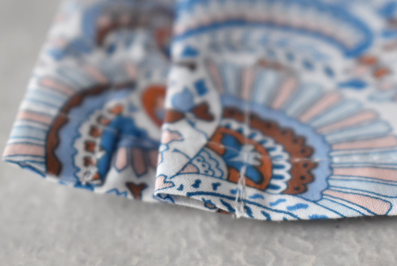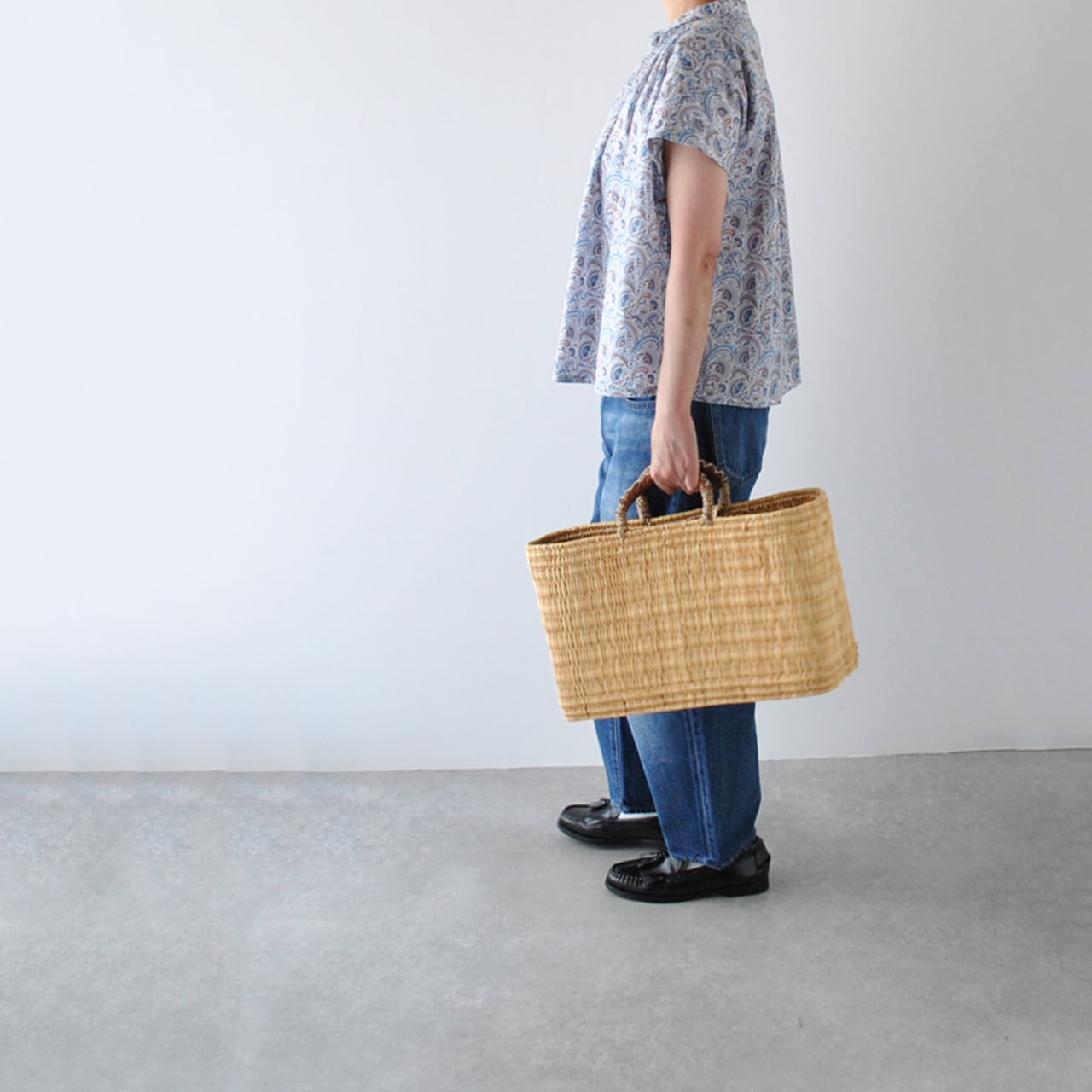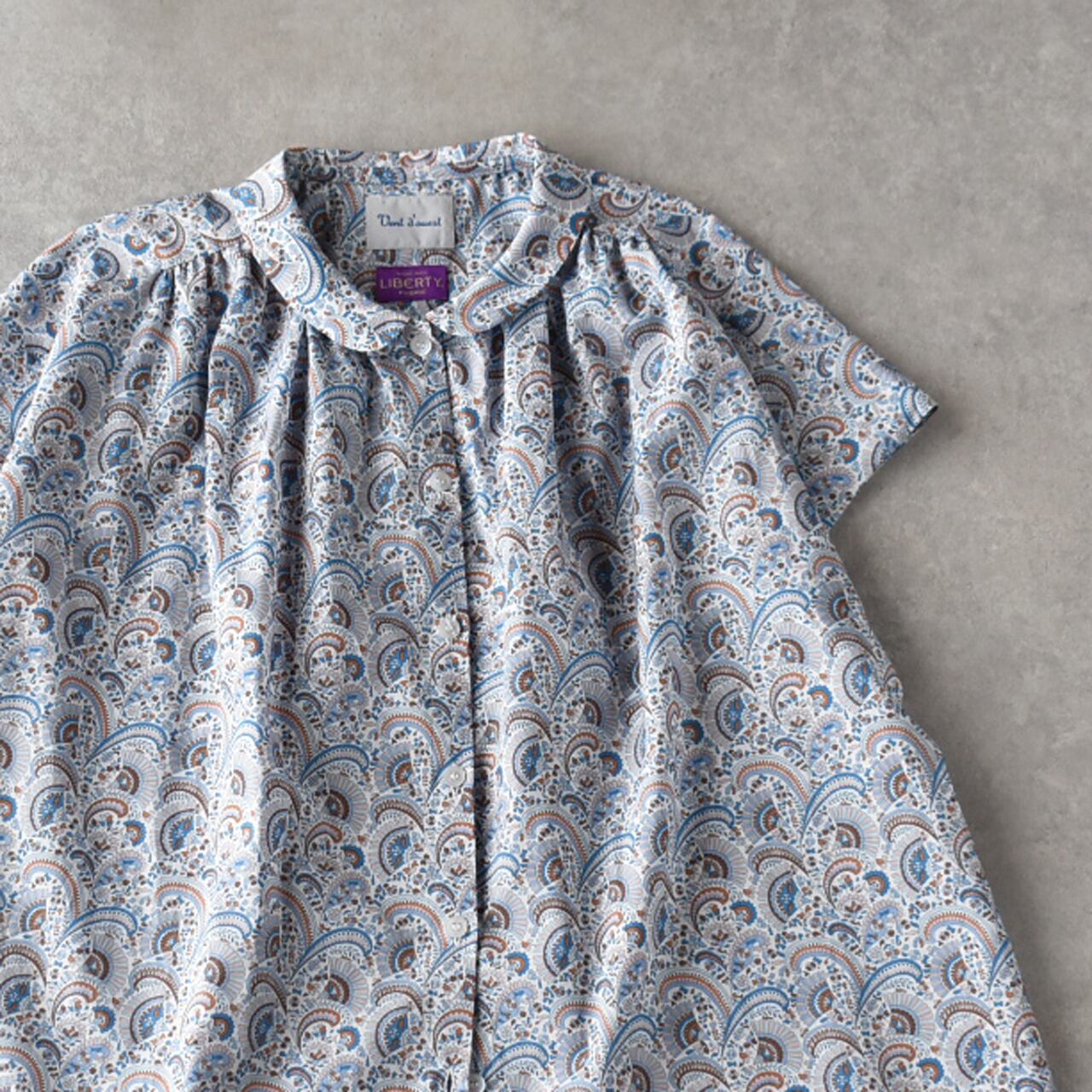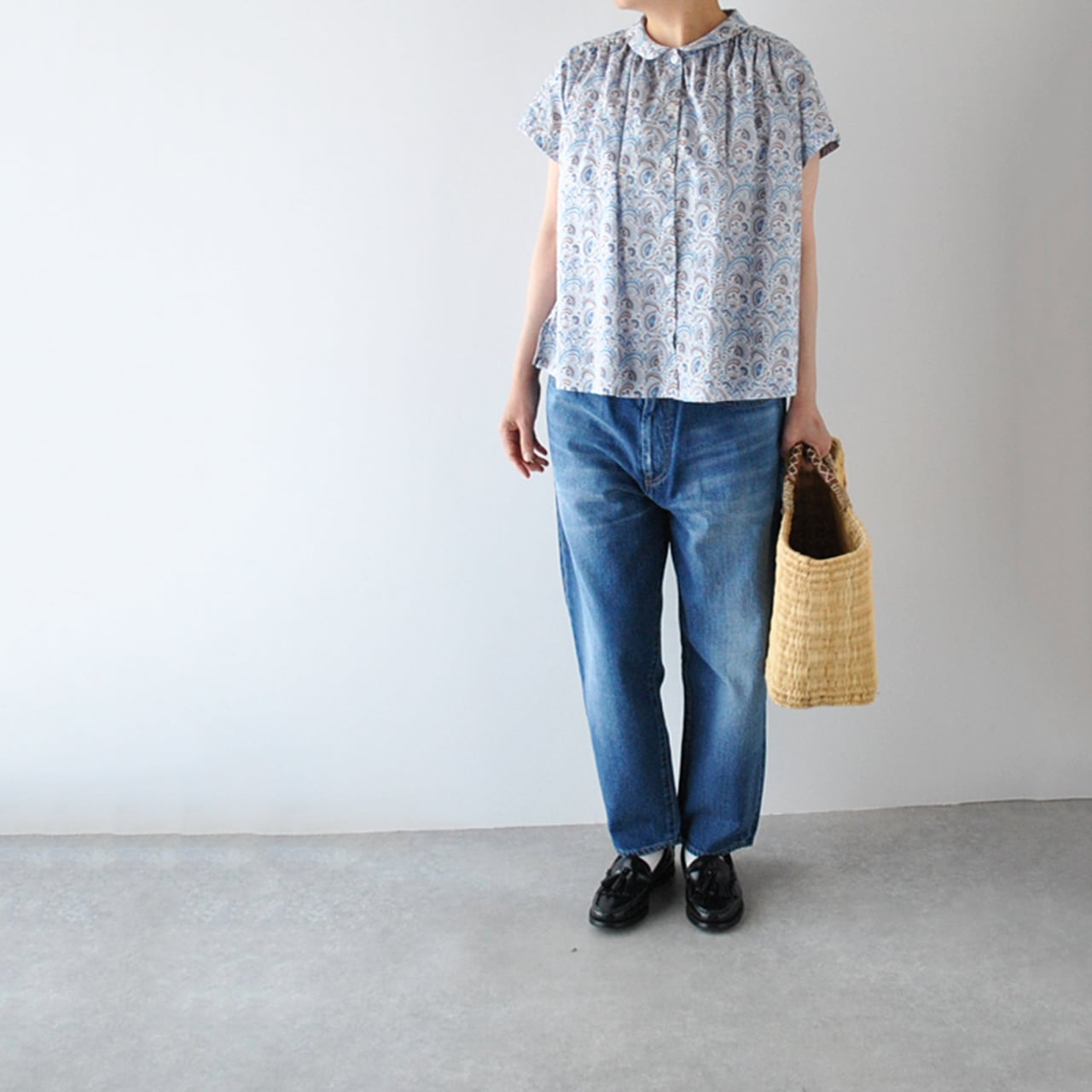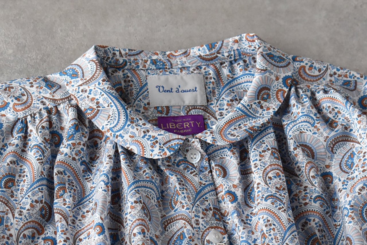 Vent d'ouestから、暑い季節でもきちんとした印象で楽しんで頂けるリバティプリントのブラウスが届きました。襟元にギャザーを寄せた女性らしいシルエットで、コンパクトな襟が愛らしく、フレンチスリーブデザインもとっても軽やか。ゆったりとした着心地なのに、着用するとスッキリコンパクトに見せてくれるのも嬉しいです。ベーシックなボトムにサッと合わせて頂くだけで上品に楽しんで頂けますよ。