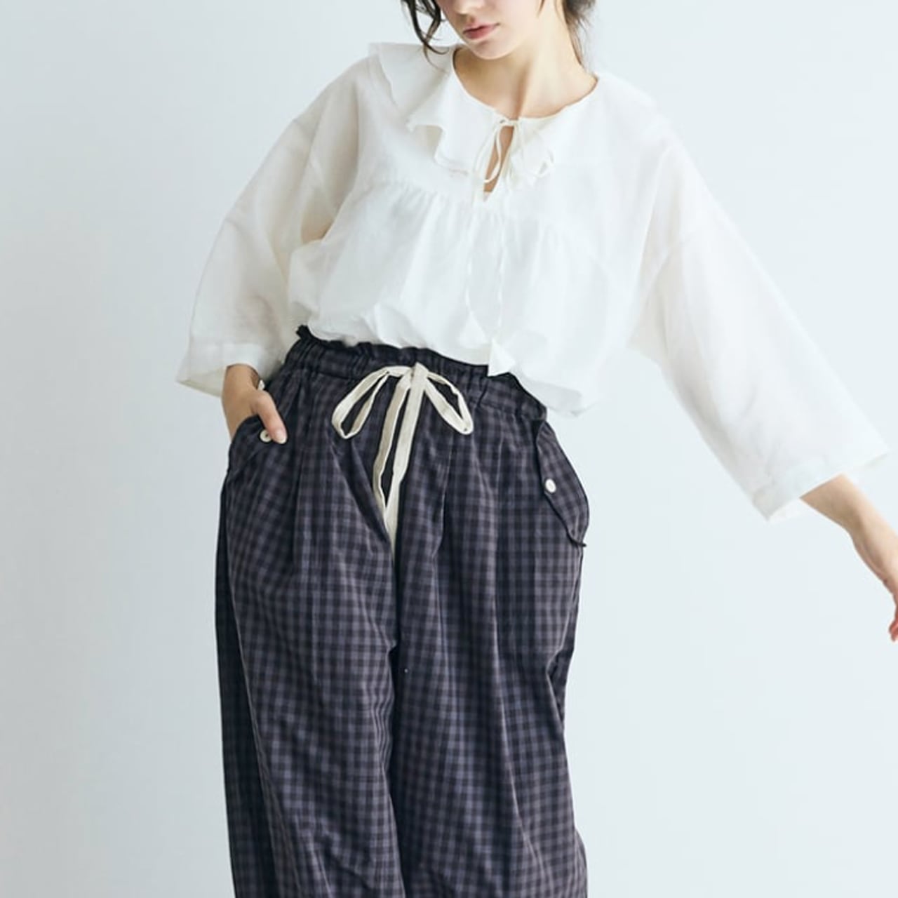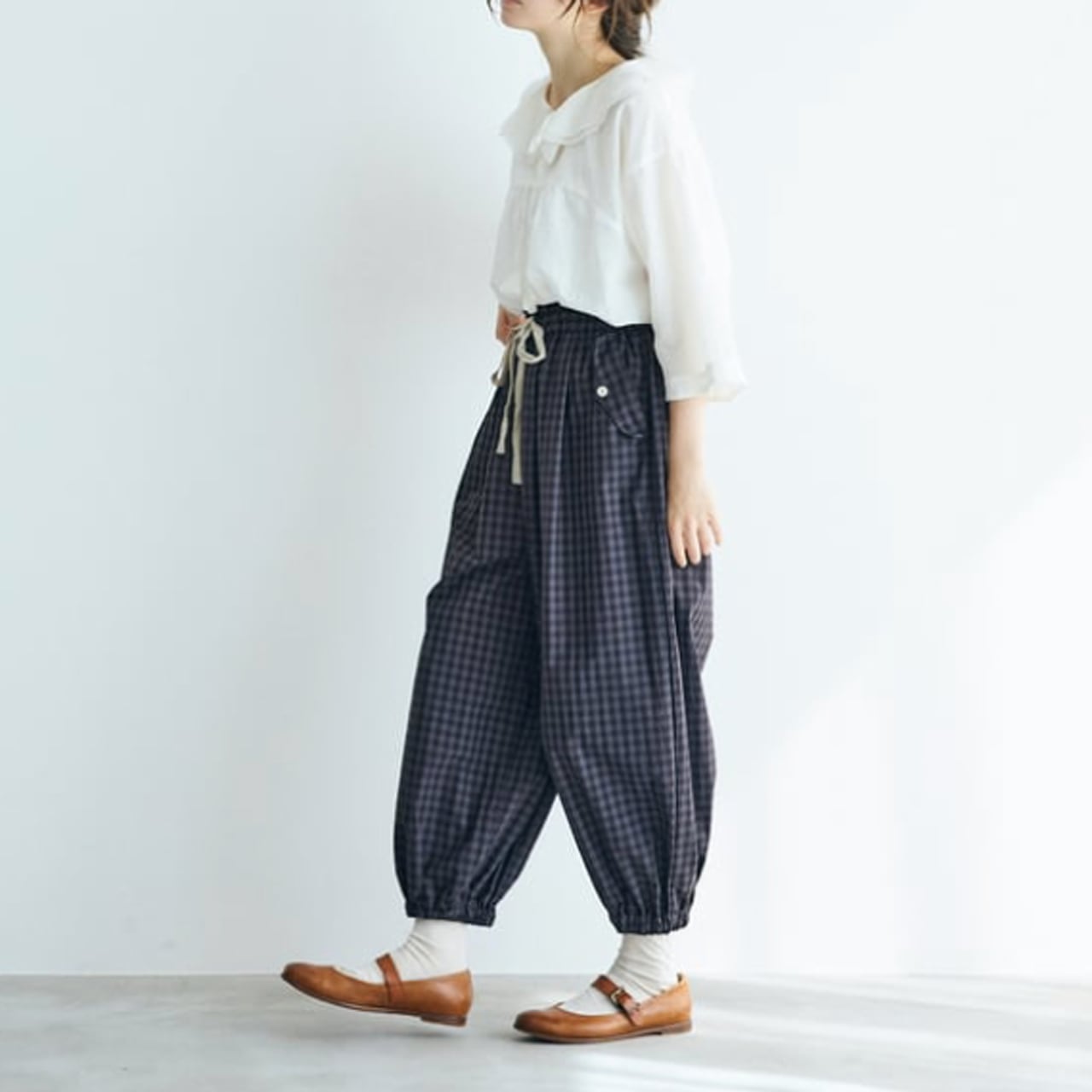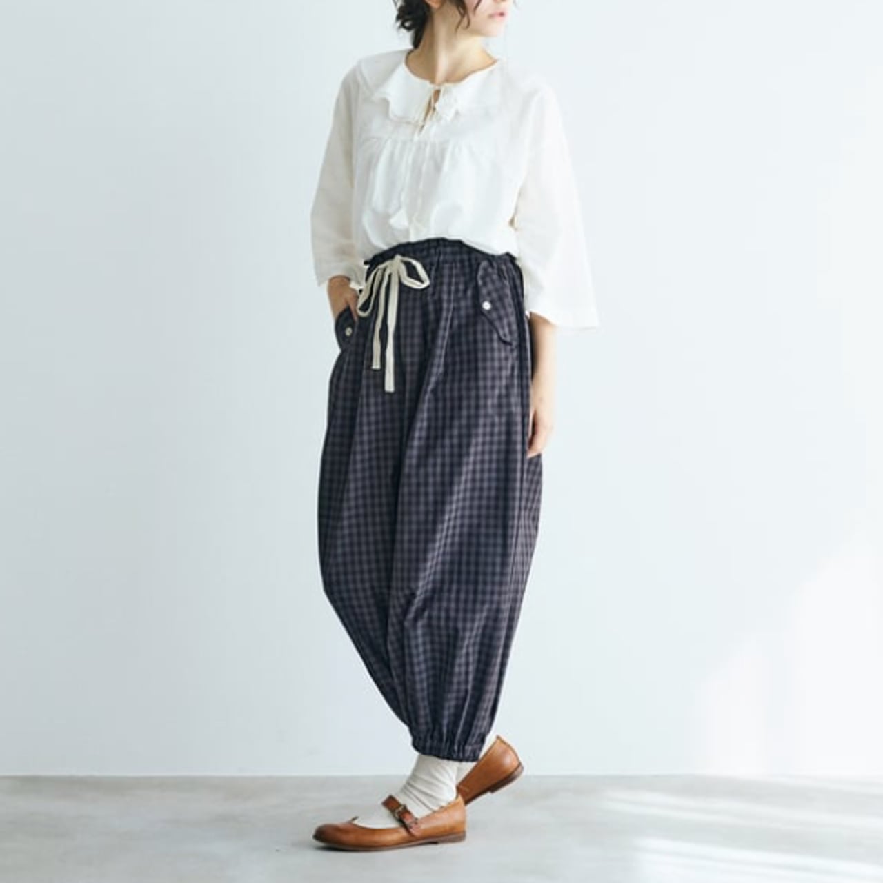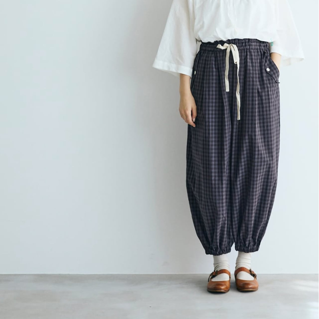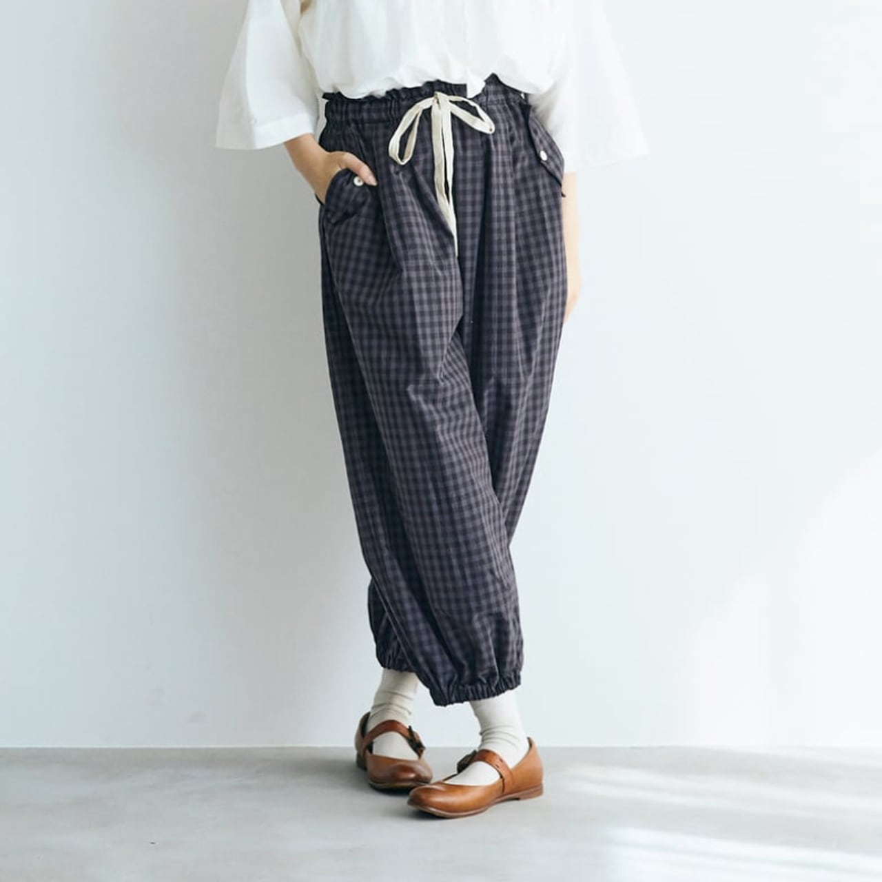 (未)MAGALI ウォッシュドコットン・バルーンギャザーパンツ (ギンガムチャコール) PT69CH