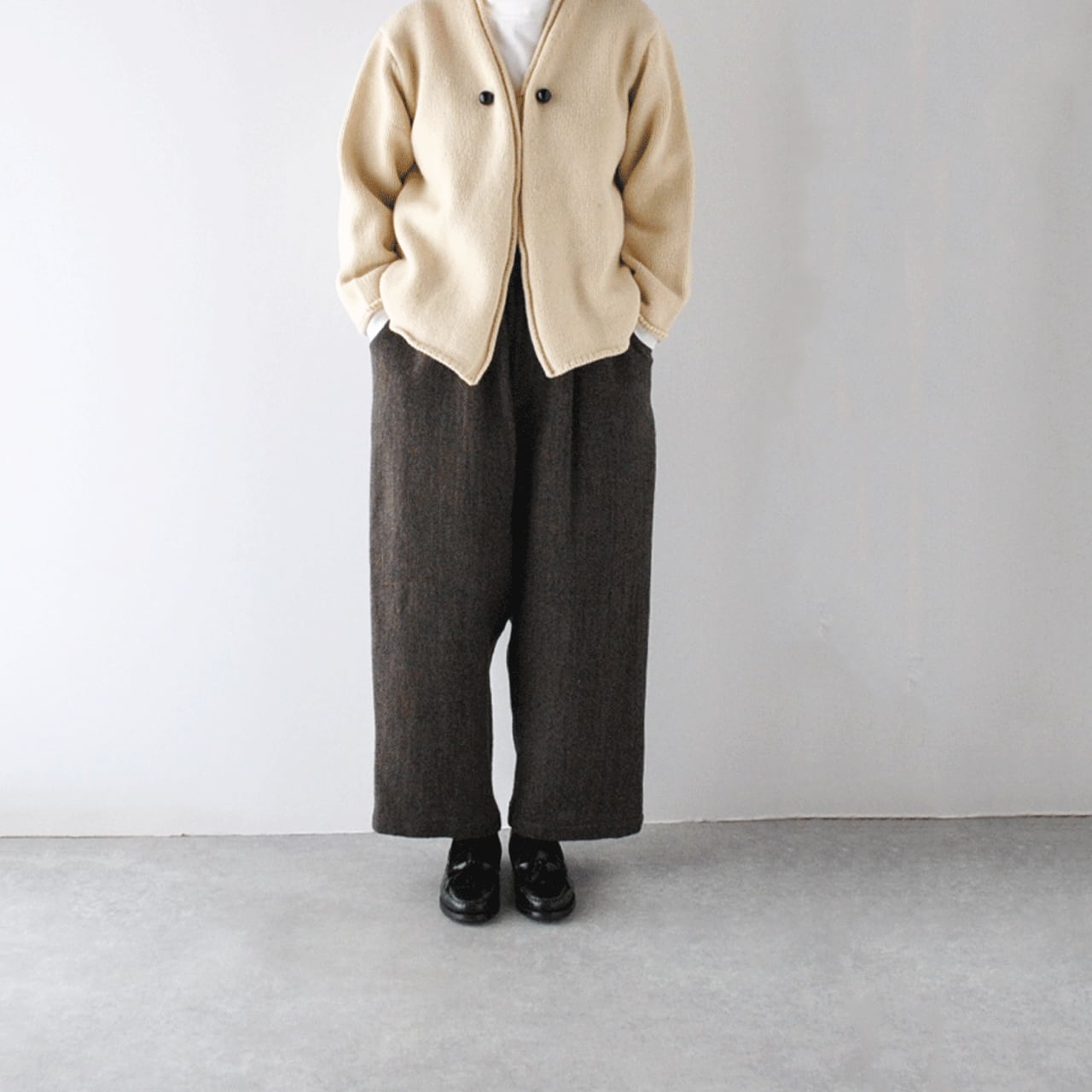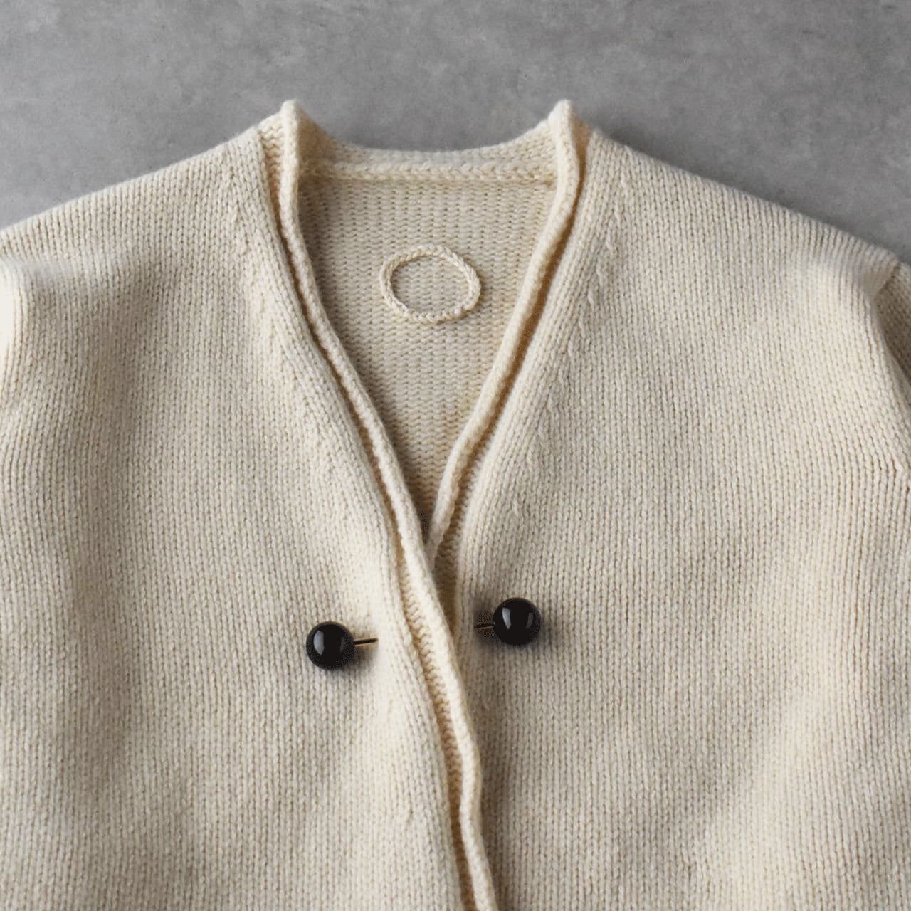 Atelier d'antanの冬を象徴するニットアイテム「ドガ」が届きました。軽くて温かな着心地で、アウターとしても着用いただけるニットカーディガンです。今シーズンは以前のものよりゆったりとしたサイズ感で製作されていますよ。ラムズウールで編み上げられた優しい雰囲気とふっくらとした質感が本当に愛らしい一枚です。スカートやパンツ、ワンピースなど様々なアイテムとも合わせやすく、付属のピンをお好きな位置で留めてご着用いただけます。