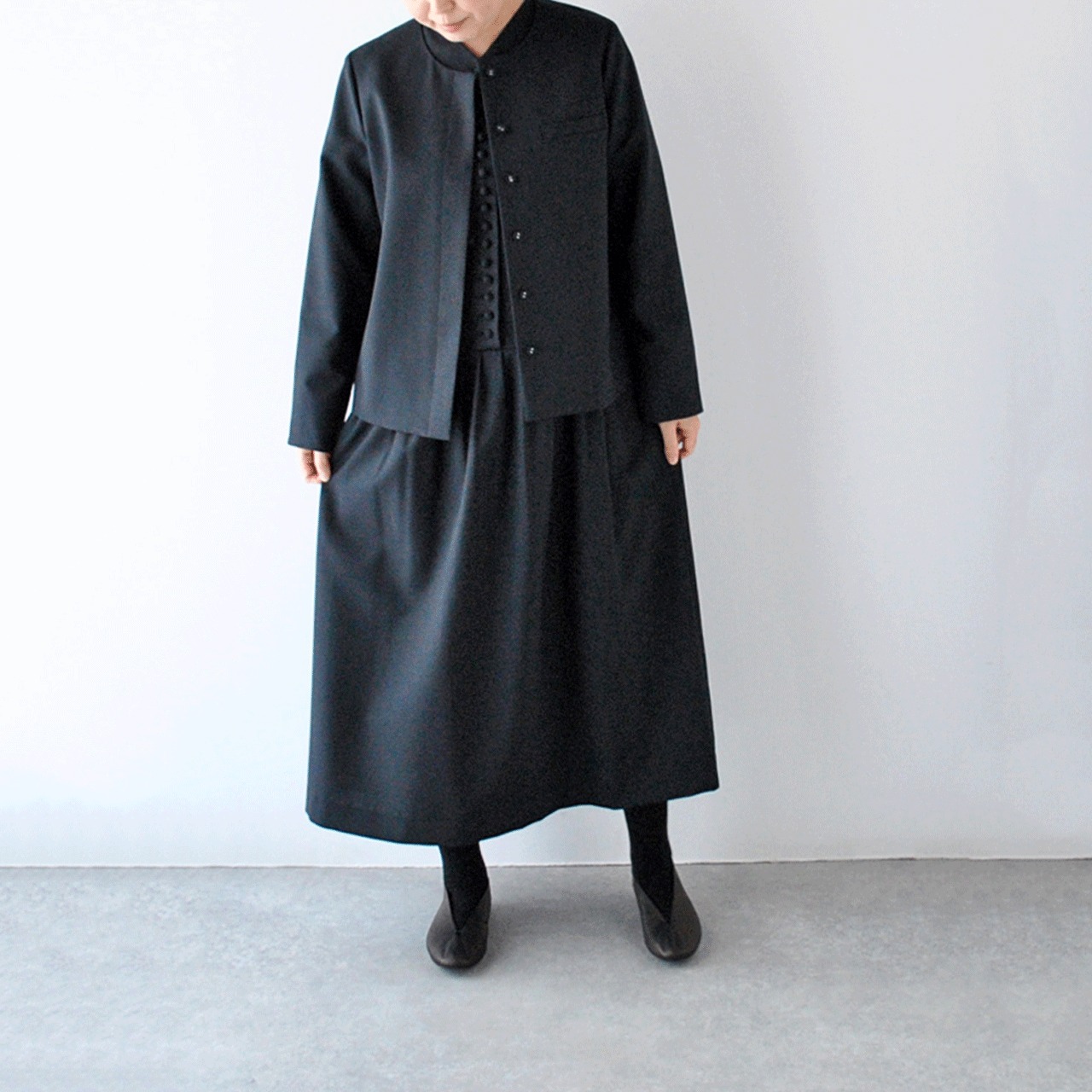 少しコンパクトなV開きの襟元が首周りをスッキリと見せてくれる洗練されたデザイン。スカート丈はロング丈なので幅広い年代の方に着ていただけるようになっています。