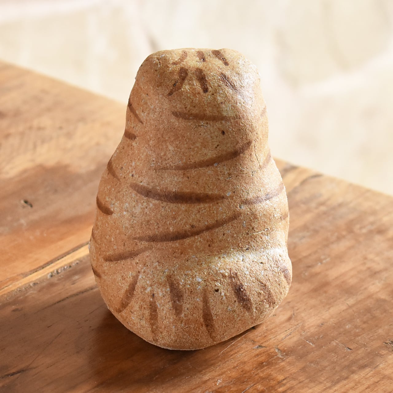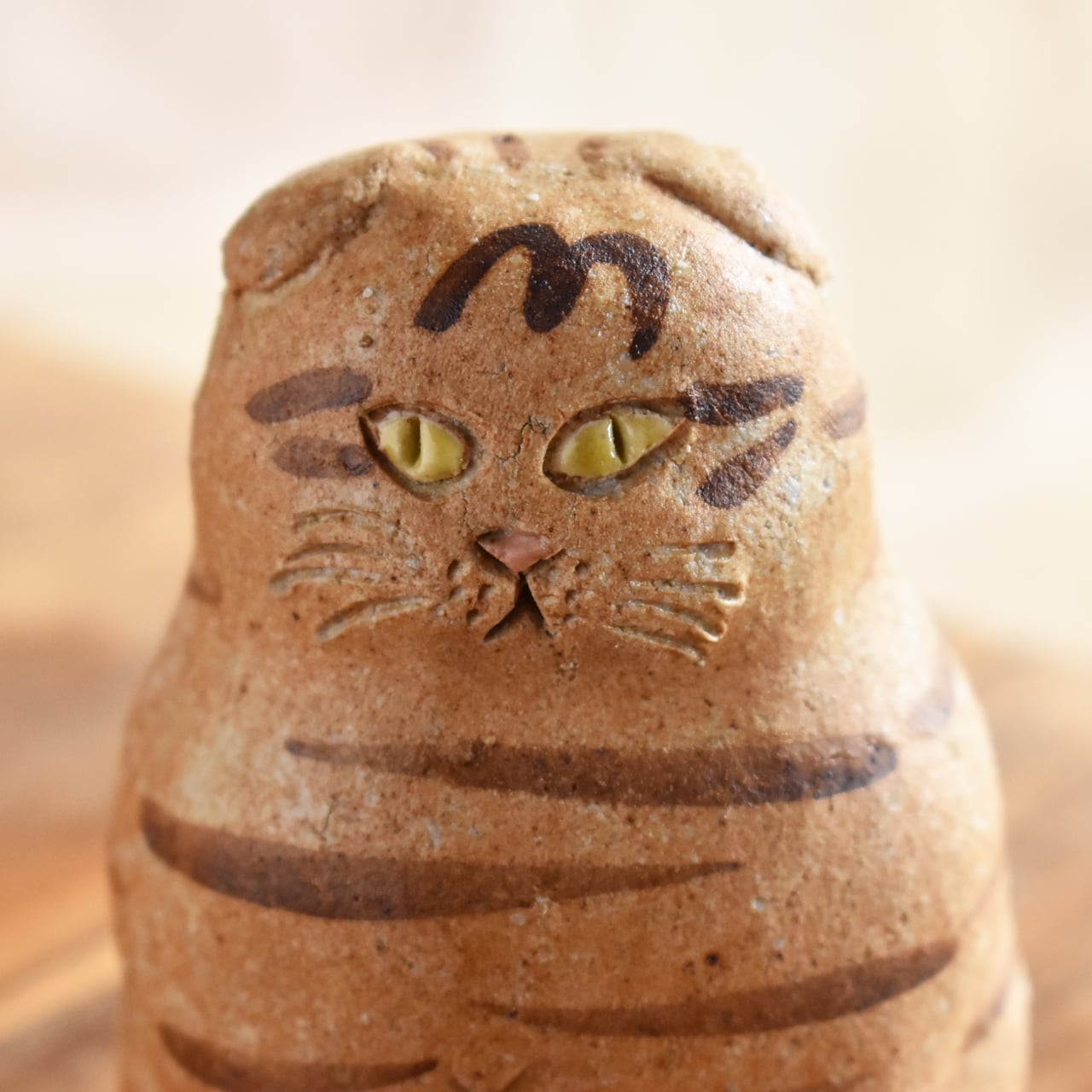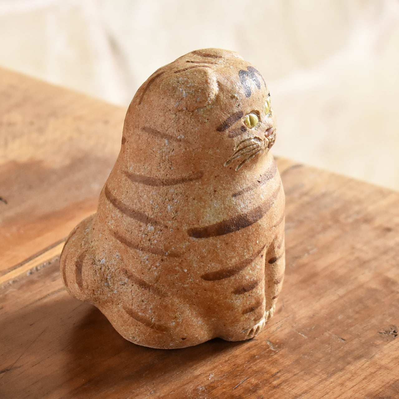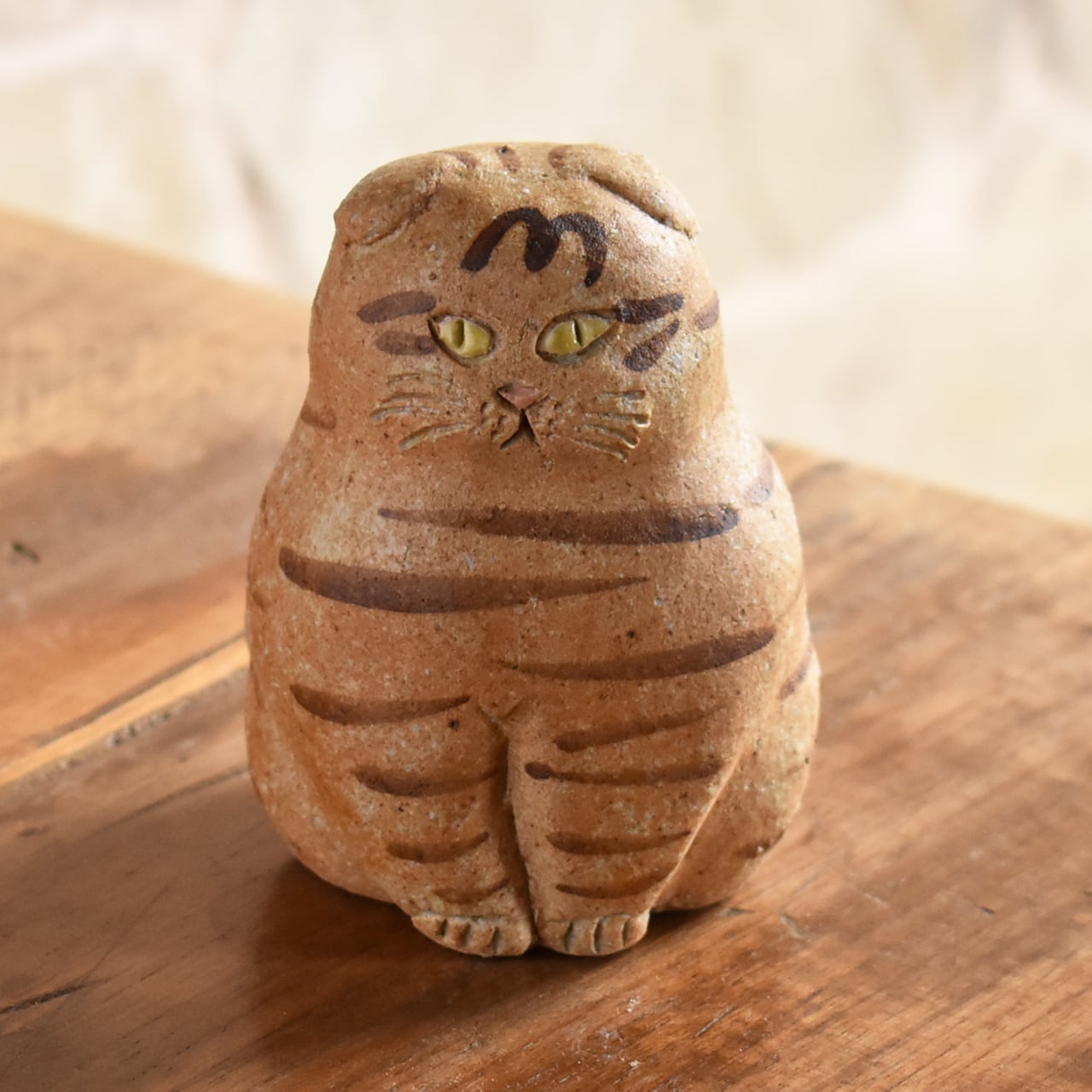 ぽってりとしたフォルムと垂れた耳がかわいい、しましまの猫。少しやんちゃで負けず嫌い。好奇心は旺盛です。大好物は”七面鳥のテリーヌ”です。