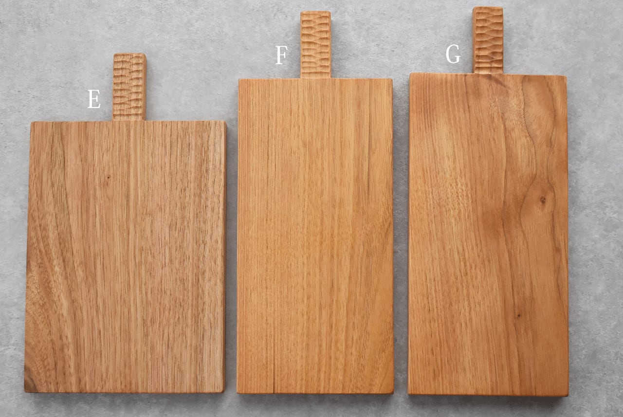 木工作家「icura」さんのカッティングボードです。ラフに使ってもらいたいという思いから、あえて節などの自然の味わいを残すことにより汚れたりキズがついても不自然でない愛着のあるものになっていきます。持ち手の部分はつかみやすいようにデコボコと削ってあります。