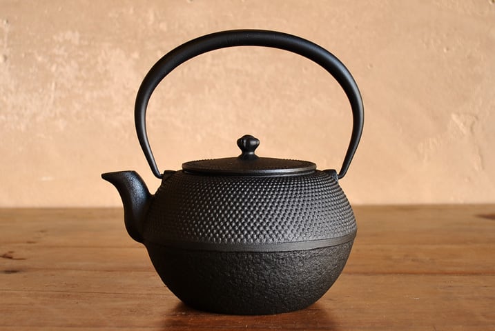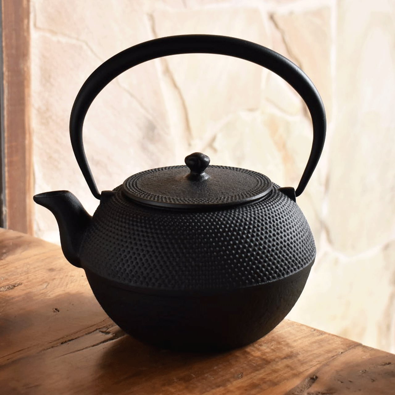 1Lサイズの鉄瓶です。南部鉄の鉄瓶でお湯を沸かすと体に良いとされる二価鉄が溶け出して、鉄分の補給にも役立ちます。また、水道水の塩素除去にも大きな効果があることが科学的に実証されていますので、鉄瓶で沸かしたお湯でお茶を入れるとミネラルウォーターを使うよりもおいしく出来るそうです。