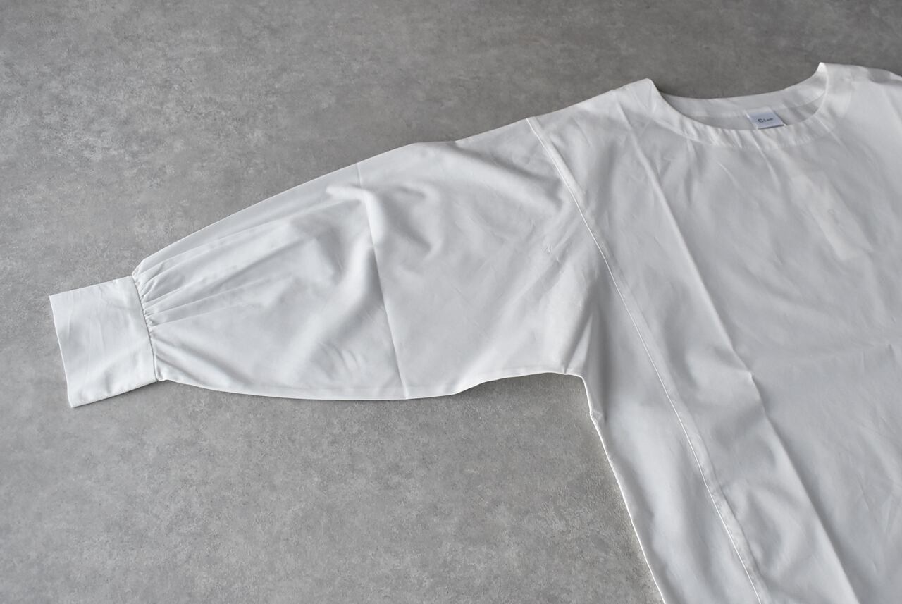 ドルマンスリーブと丸みのあるワイドなシルエットが魅力のスモックブラウスです。生地にはソフトで程よいハリ感のあるコットン生地を使用し、スッキリとした襟元とシンプルなデザインでオンオフ問わずに幅広くコーディネートをお楽しみいただける一枚です。