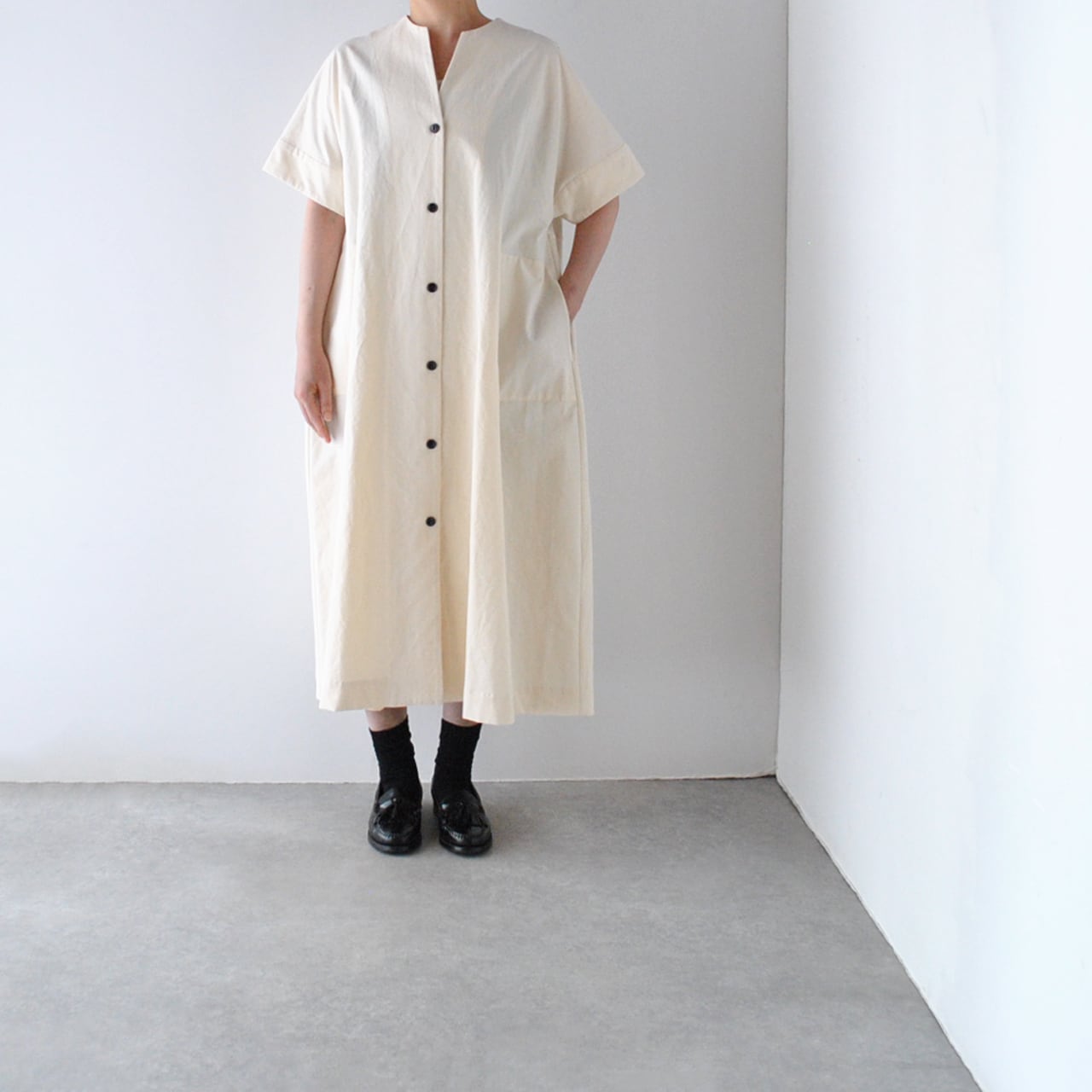 Atelier d'antanから、オリジナルコットンを使用したアトリエシリーズのワンピース「Zola (ゾラ)」が届きました。スッキリとしたキーネックから、バックスタイルに施されたタックによってゆるやかに広がるシルエットが美しく、一度着てみるとその上質で上品な佇まいを感じて頂ける一枚です。ボタンを全て開けて羽織りのように楽しむのもいいですね。肌寒い時期は長袖のインナーとの重ね着を、温かくなれば一枚で、と長いシーズン着用頂けますよ。旧式の織り機でゆっくりと織り上げられたアトリエシリーズの特別なコットンは、時間をかけてつくられる分、生地にふくらみがあり、マットな質感もとても上質な印象です。着こむほどにくたっとアンティークのような風合いに変化していくのも楽しみ。