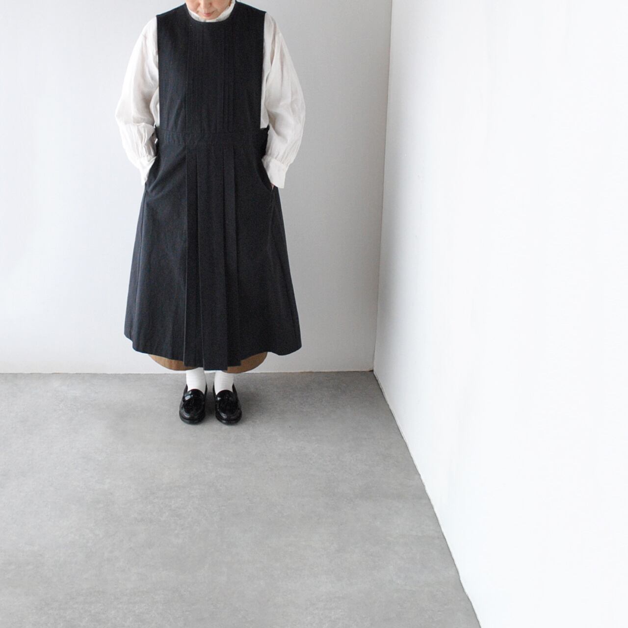 オリジナルコットンを使用したAtelier d'antanアトリエシリーズのエプロンワンピース「Kobell(コベル)」。フロントにプリーツを施したクラシックで凛とした中世の修道着のような佇まいが本当に美しい一枚です。後ろ開き(ボタンが三か所ございます)のデザインで、季節に合わせてインナーやボトムを替えて頂くことで様々な着こなしを楽しんで頂けますよ。旧式の織り機でゆっくりと織られた生地はふっくらとしていて、適度なハリと厚みがありツヤをおさえた質感でとても上品な印象です。着こんでいくほどに風合いが増すのも楽しみ。