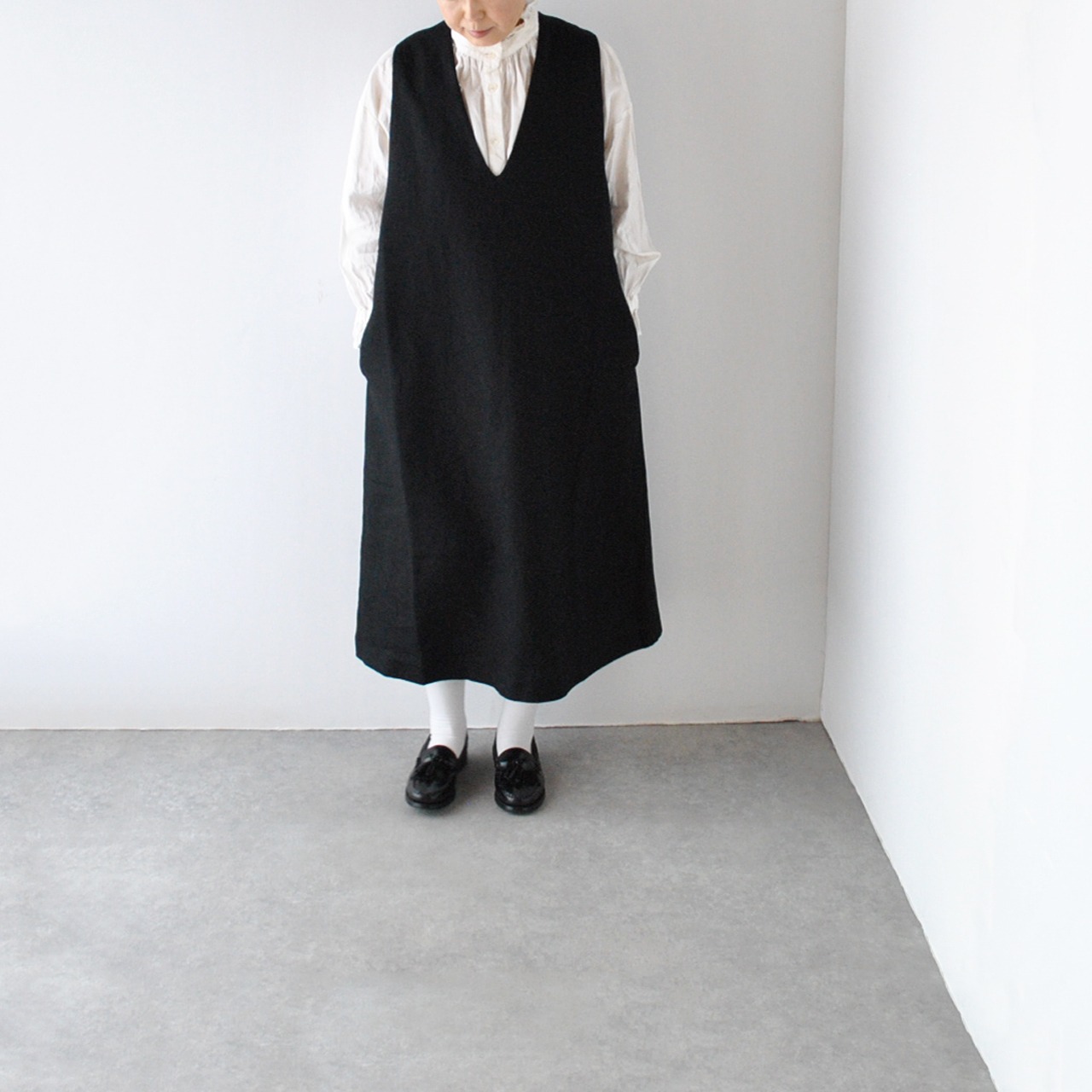 上品な光沢感のある厚手のリネンツイル生地を使用した、落ち感のあるゆったりとしたシルエットと深めのVネックが女性らしいワンピース。印象的なブラウスはもちろん、秋冬はタートルネック、春夏はボーダーTなど、季節に合わせたインナーとのコーディネートで、一年を通して楽しんで頂ける人気の一枚です。程よい厚みがあり、スカート部分にはコットンの裏地も付いていて、とても安心感がありますよ。ちょっとしたフォーマルな場面にもオススメです。