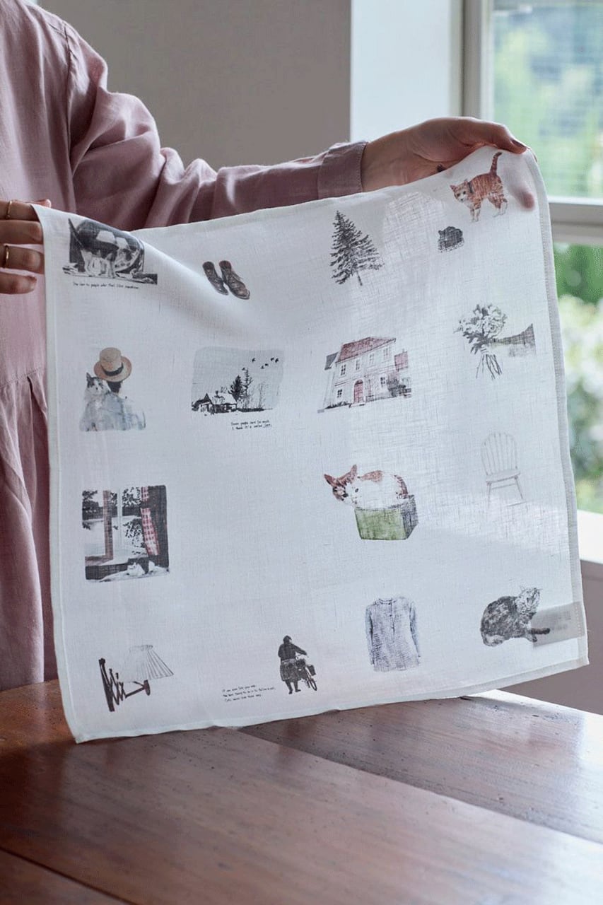 イラストレーター・萩原美里さんの、静かで美しい世界観のイラストがとても素敵なハンカチです。鞄の中で見つけるたび、手に取るたびに嬉しくなる様な特別な一枚。