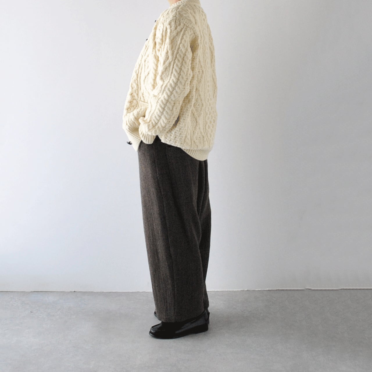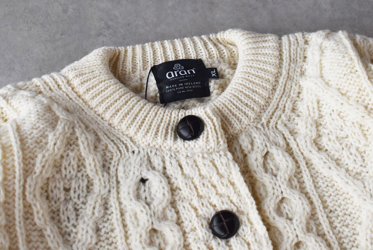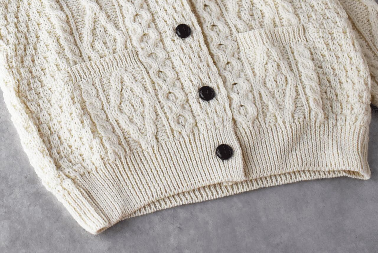 1968年から続くアイルランドのニットメーカーAran Woollen Mills(アランウーレンミルズ)のアラン編みのニットカーディガンです。ゆったりと着て頂けるように少し大きめのXLサイズをセレクトしています。ボリューム感のあるロングスカートやワイドパンツ、ワンピースなどと合わせて絶妙なバランスでコーディネートして頂けますよ。しっかりとした質感、美しい編み目を見るたびその上質さを感じさせられる1枚。アラン諸島のケルト民族に伝わる伝統ある編み目、しっかりと編まれたことによりもたらされる温かさ、丈夫で汚れにくく型崩れしにくい着心地、流行に流されない落ち着いた雰囲気がとても素敵で、長年大事にしたくなるアイテムです。