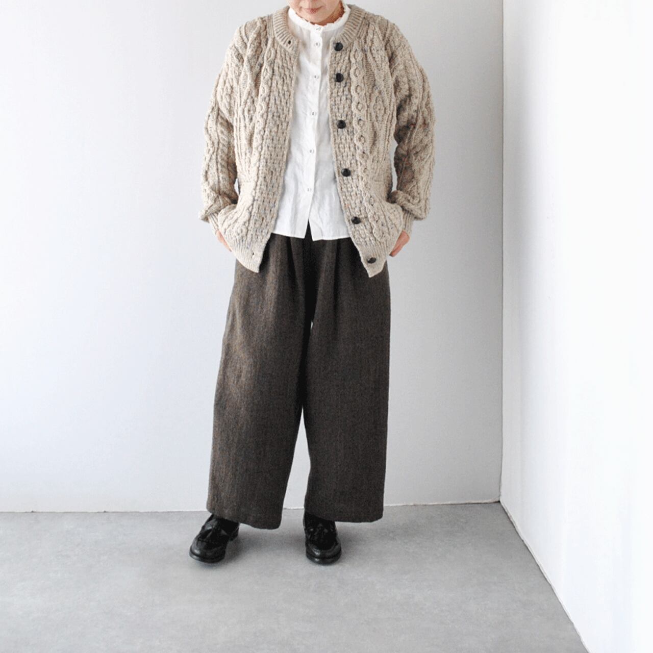 1968年から続くアイルランドのニットメーカーAran Woollen Mills(アランウーレンミルズ)のアラン編みのニットカーディガンです。ゆったりと着て頂けるように少し大きめのXLサイズをセレクトしています。ボリューム感のあるロングスカートやワイドパンツ、ワンピースなどと合わせて絶妙なバランスでコーディネートして頂けますよ。しっかりとした質感、美しい編み目を見るたびその上質さを感じさせられる1枚。アラン諸島のケルト民族に伝わる伝統ある編み目、しっかりと編まれたことによりもたらされる温かさ、丈夫で汚れにくく型崩れしにくい着心地、流行に流されない落ち着いた雰囲気がとても素敵で、長年大事にしたくなるアイテムです。