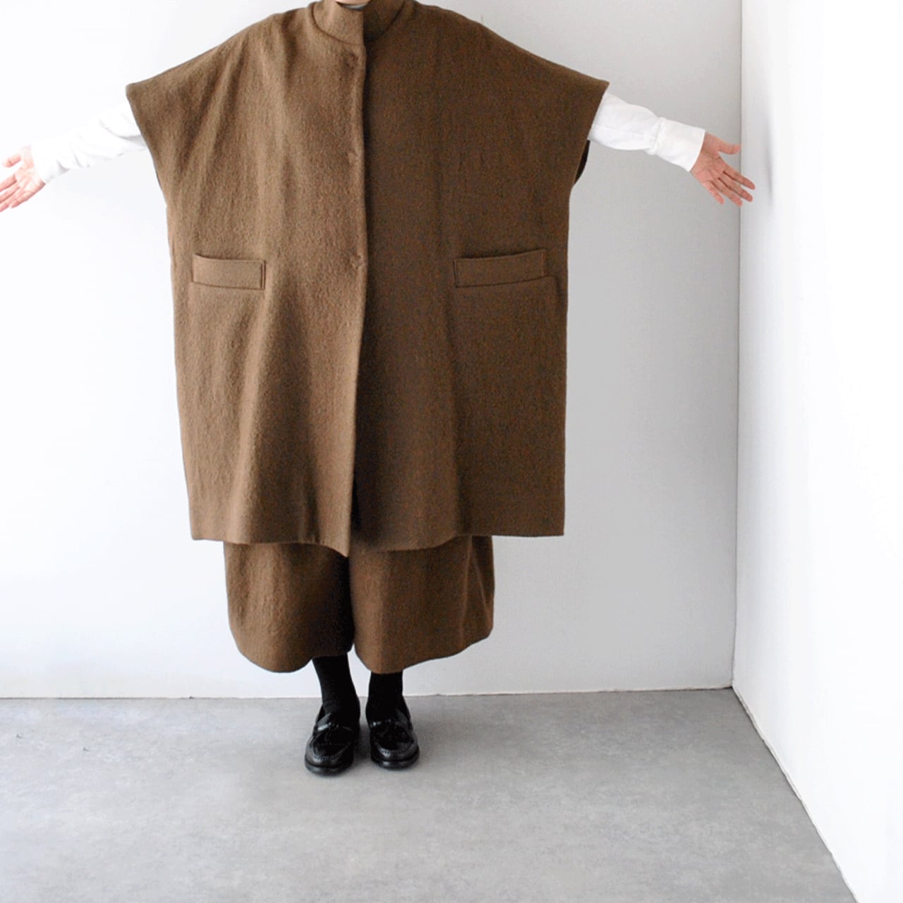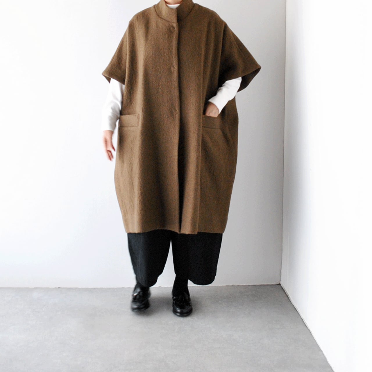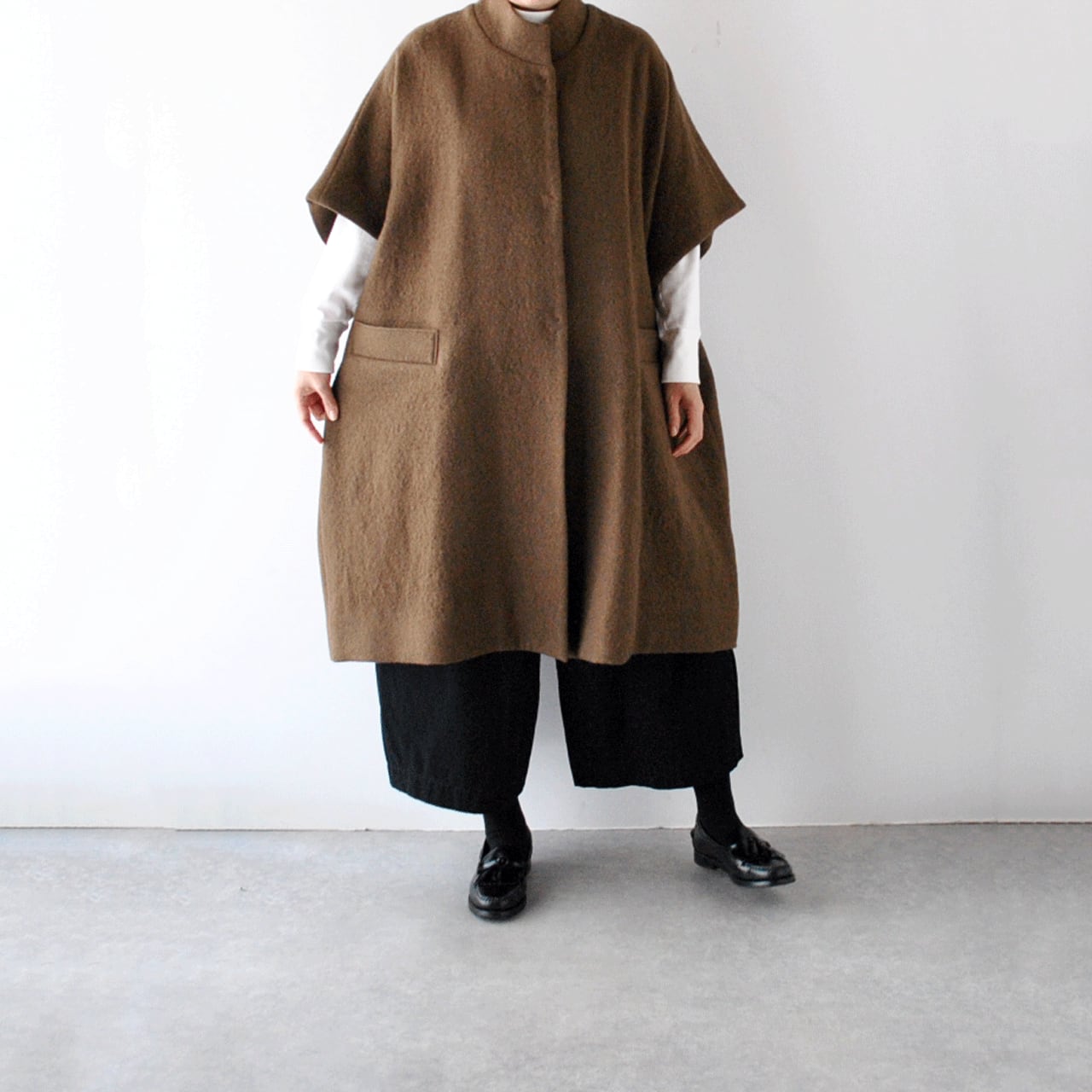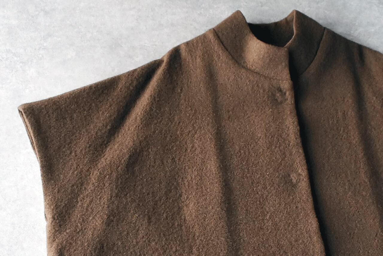 Atelier d'antanから、上質なイタリア産の縮絨ウールで仕立てたショートスリーブコート「テュルク」が入荷しました。ゆったりとした広い身幅でベストのようにざっくりと着ていただけるデザインがとってもこなれた印象で、全体のコーディネートを何とも言えない良い雰囲気とバランスに仕上げてくれますよ。ふっくらとした質感で着心地も軽く、スナップ式の前ボタン、滑りのよいキュプラの裏地付きで着脱もストレスフリー。ダンタンらしい絶妙なニュアンスを感じていただけるオススメの一枚です。