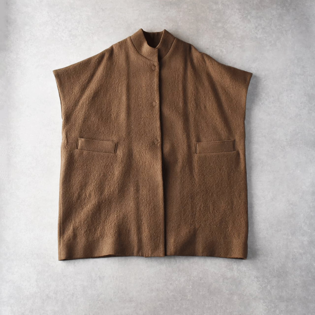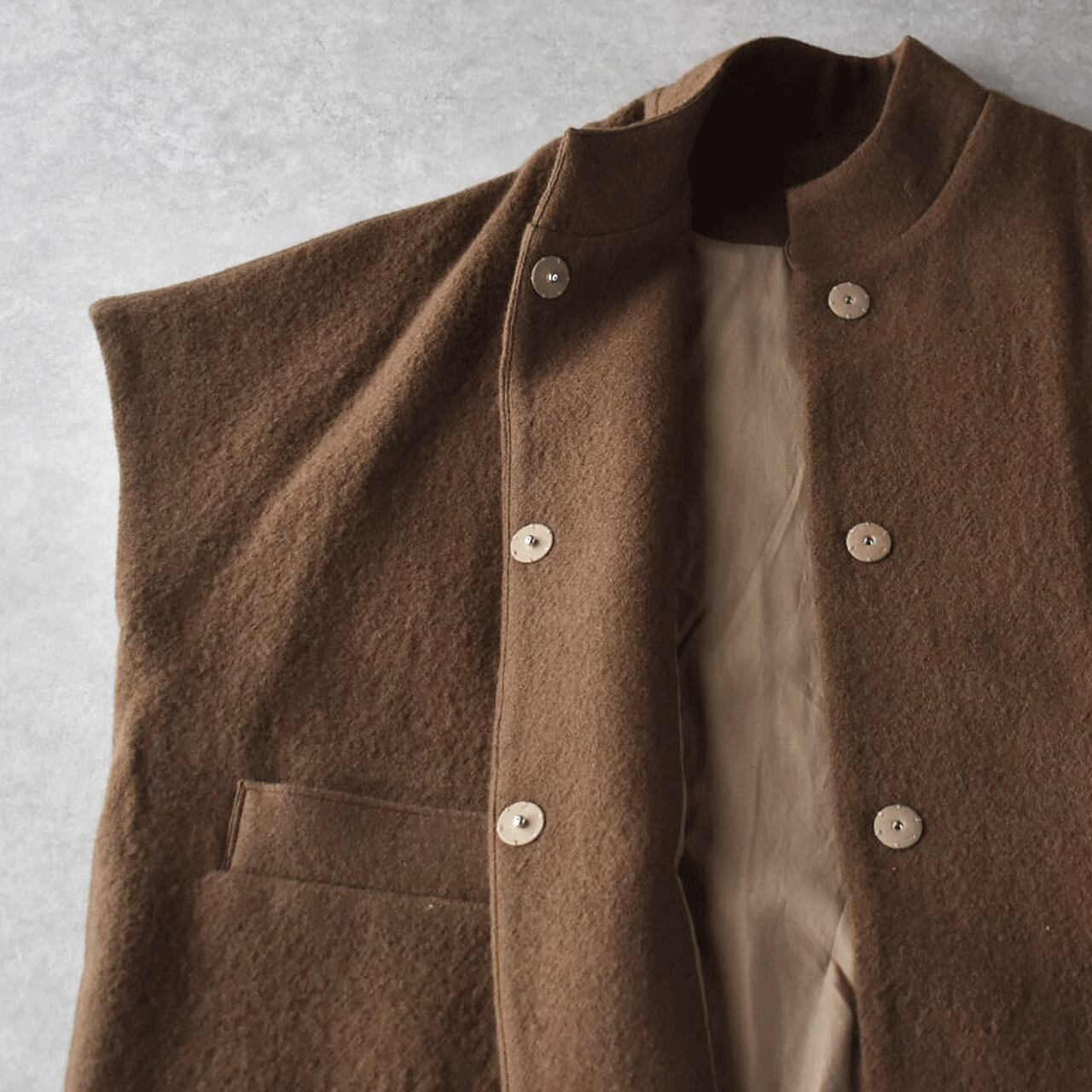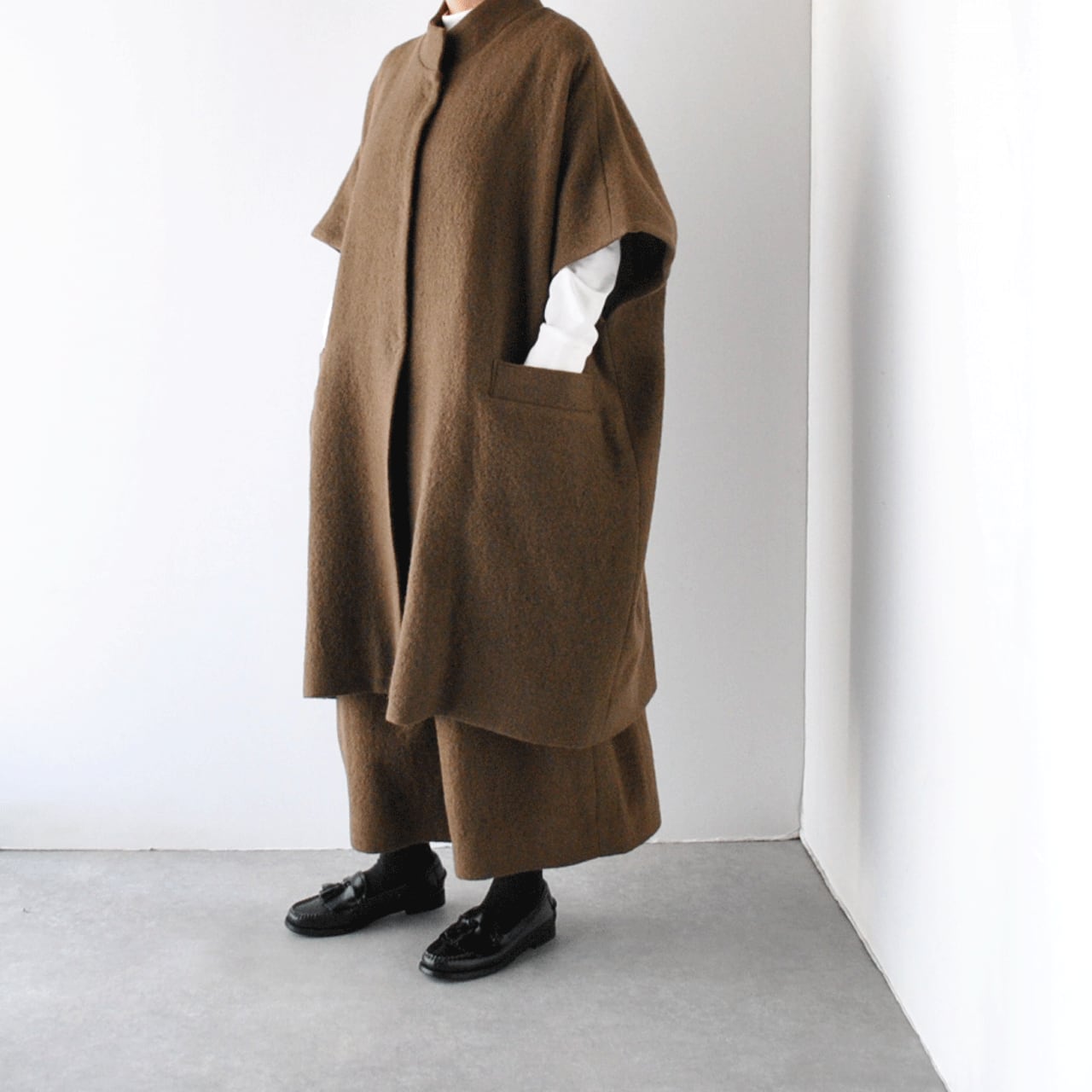 Atelier d'antanから、上質なイタリア産の縮絨ウールで仕立てたショートスリーブコート「テュルク」が入荷しました。ゆったりとした広い身幅でベストのようにざっくりと着ていただけるデザインがとってもこなれた印象で、全体のコーディネートを何とも言えない良い雰囲気とバランスに仕上げてくれますよ。ふっくらとした質感で着心地も軽く、スナップ式の前ボタン、滑りのよいキュプラの裏地付きで着脱もストレスフリー。ダンタンらしい絶妙なニュアンスを感じていただけるオススメの一枚です。
