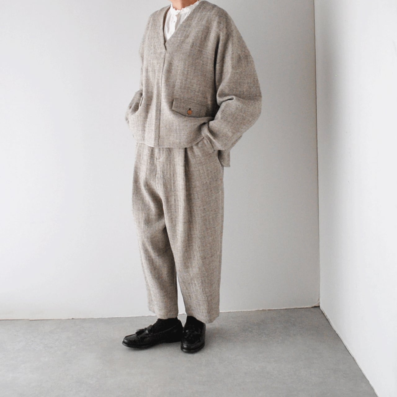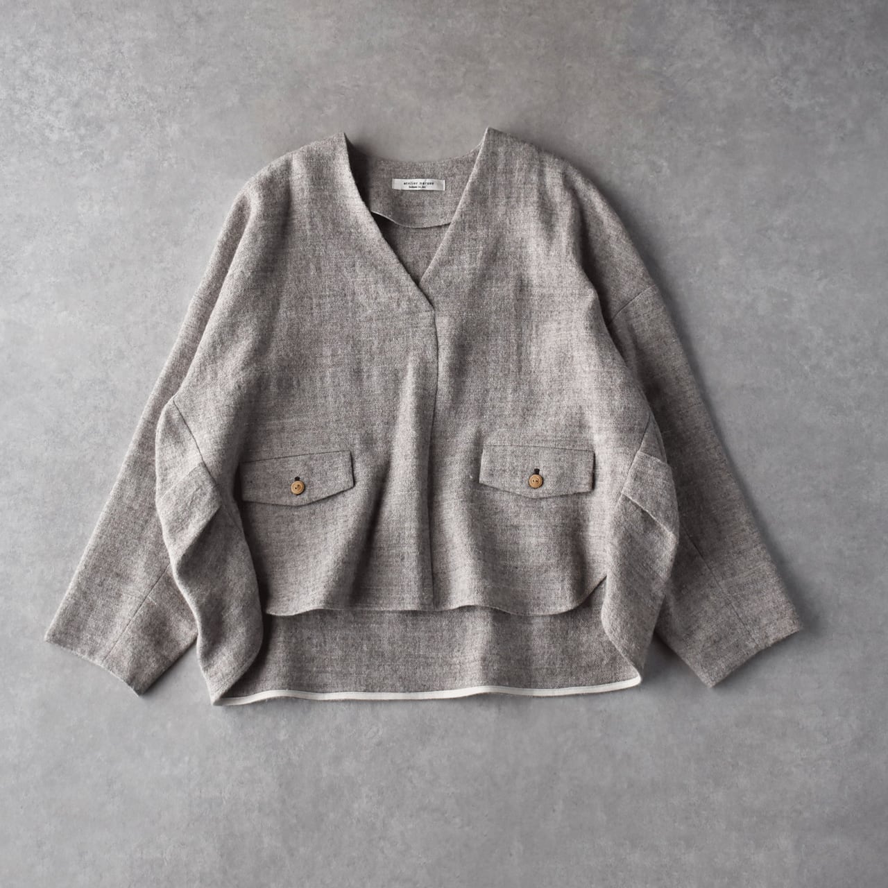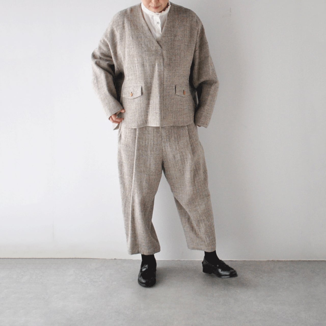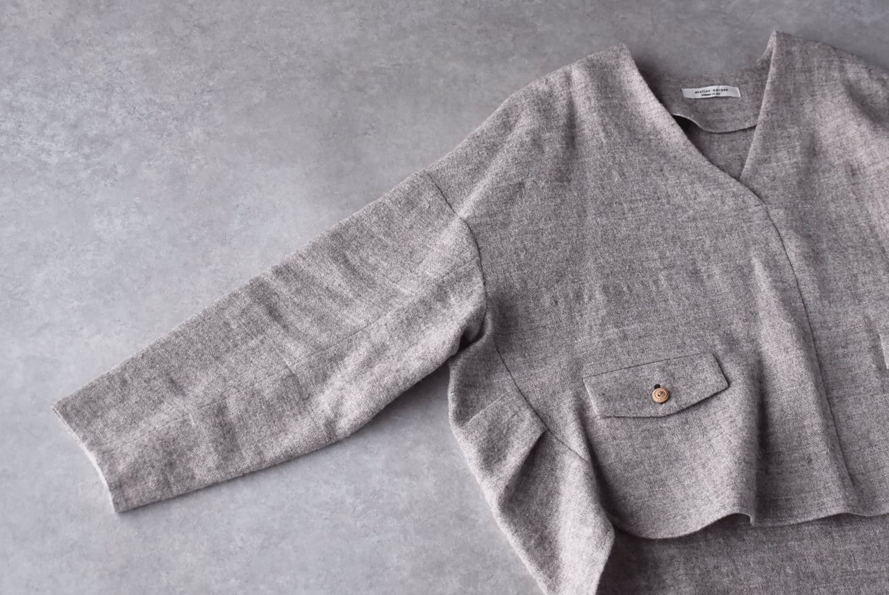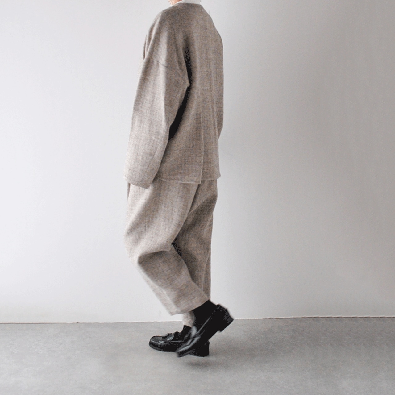 atelier naruseから、トップスとしても、アウターのようにも着て頂ける、スモックタイプのシャツジャケットが届きました。ヘリンボン柄に織り上げたリネンウール素材を使用した、愛らしさの中にも少し渋さのある一着。ゆったりとした肩幅、身幅で、これからの季節Tシャツやブラウス、タートルニットなどにサッと重ねるといい雰囲気に仕上げてくれますよ。同素材のタックワイドパンツとのセットアップもオススメ。