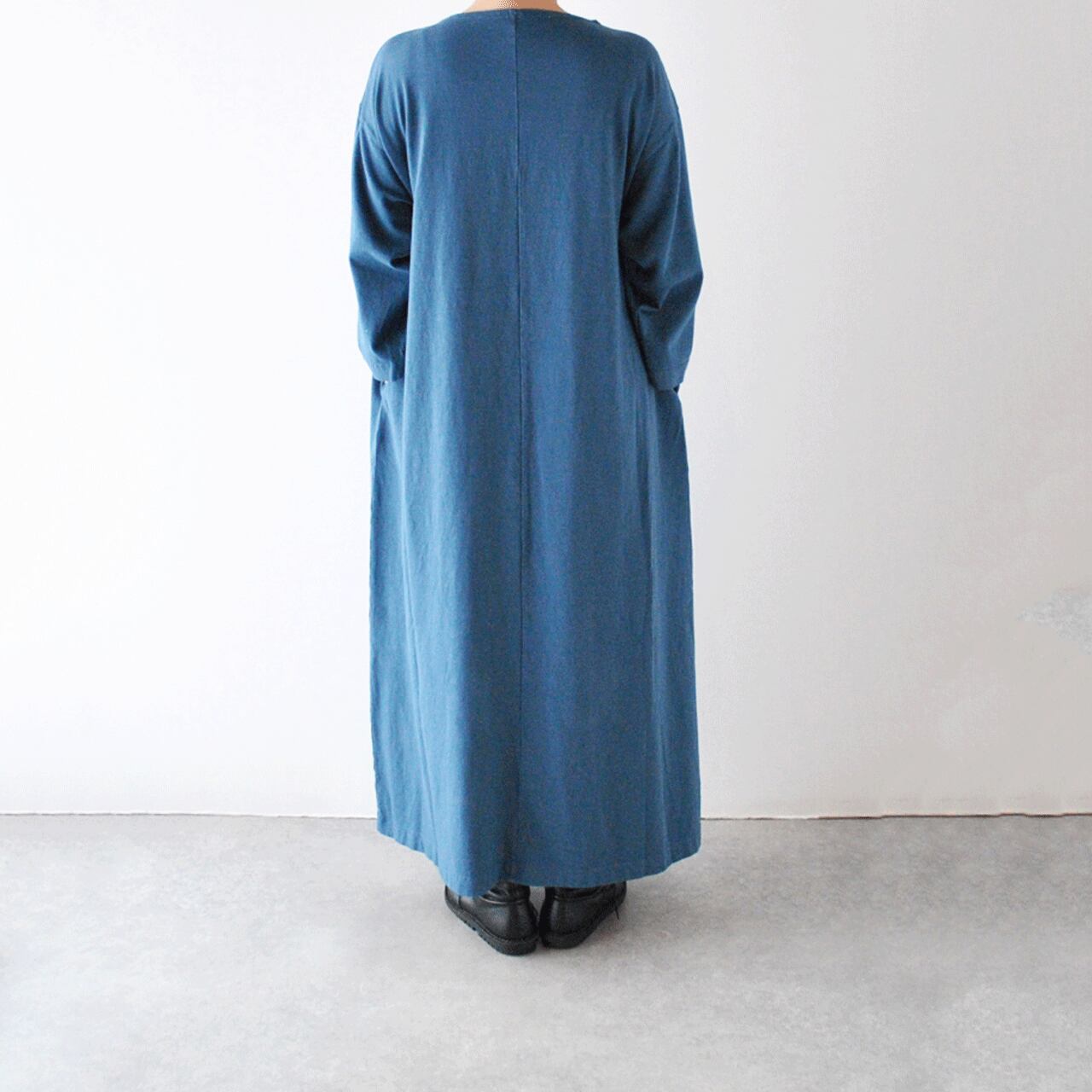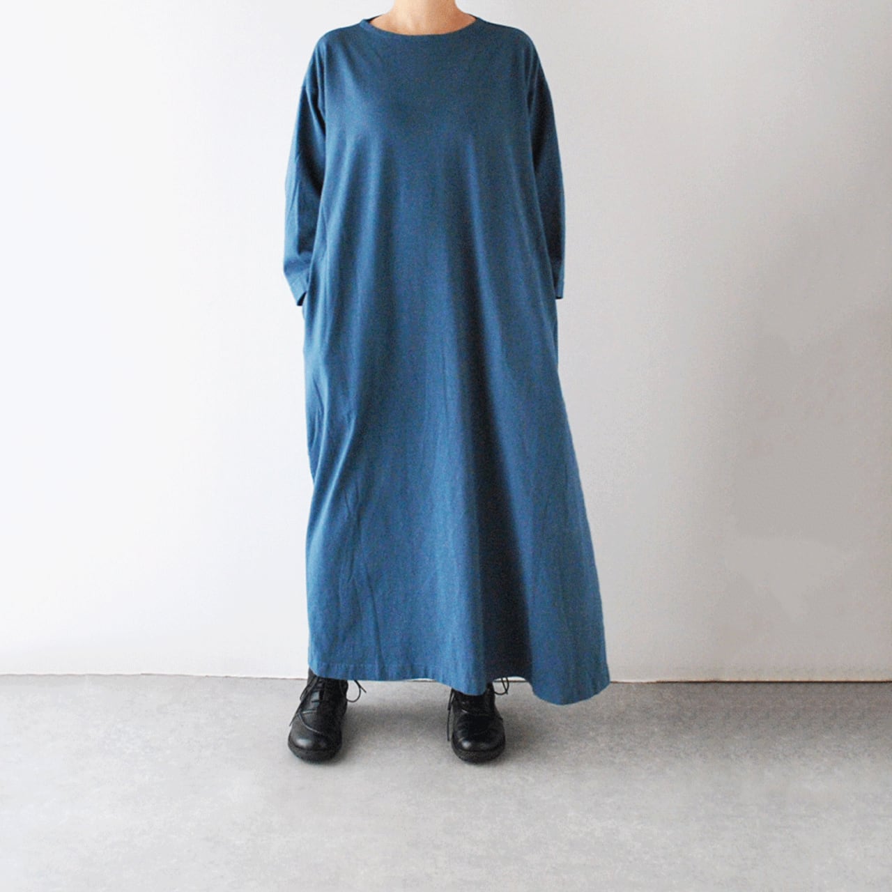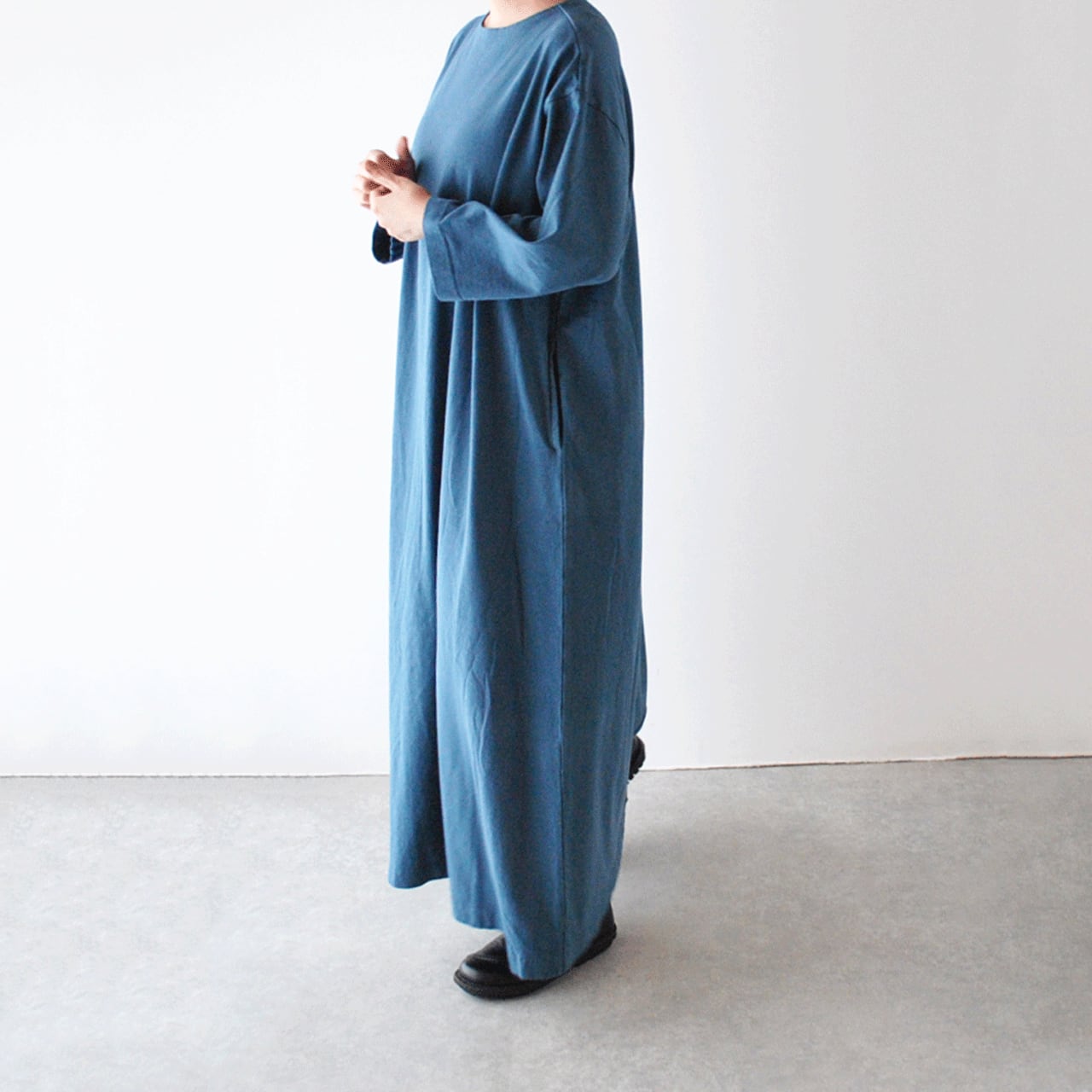 pritからたっぷりの丈感とシンプルなAラインシルエットが雰囲気満点のマキシワンピースが入荷しました。肩幅、身幅、袖幅をたっぷりとったゆとりのあるデザインで、大人の女性にリラックスして楽しんで欲しい一枚です。程よい厚みの天竺コットン素材はとても良い風合いで、ニュアンスのある色味も本当に素敵。ボートネックの襟元がデコルテを美しく見せてくれるのも嬉しいポイントです。