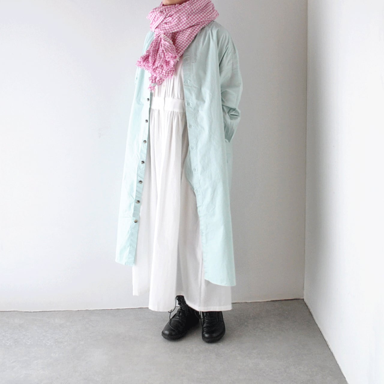 pritから毎シーズン人気の高いスタンドカラーのシャツワンピースが届きました。自然なシワ感とゆったりとしたフォルムが本当に良い雰囲気の一枚ですよ。ボタンを留めてシンプルにワンピースとして着て頂くのはもちろん、ボタンを開けてコートのように着て頂くのもオススメ。程よい厚みのあるコットン素材ですので、長い期間楽しんで頂けますよ。