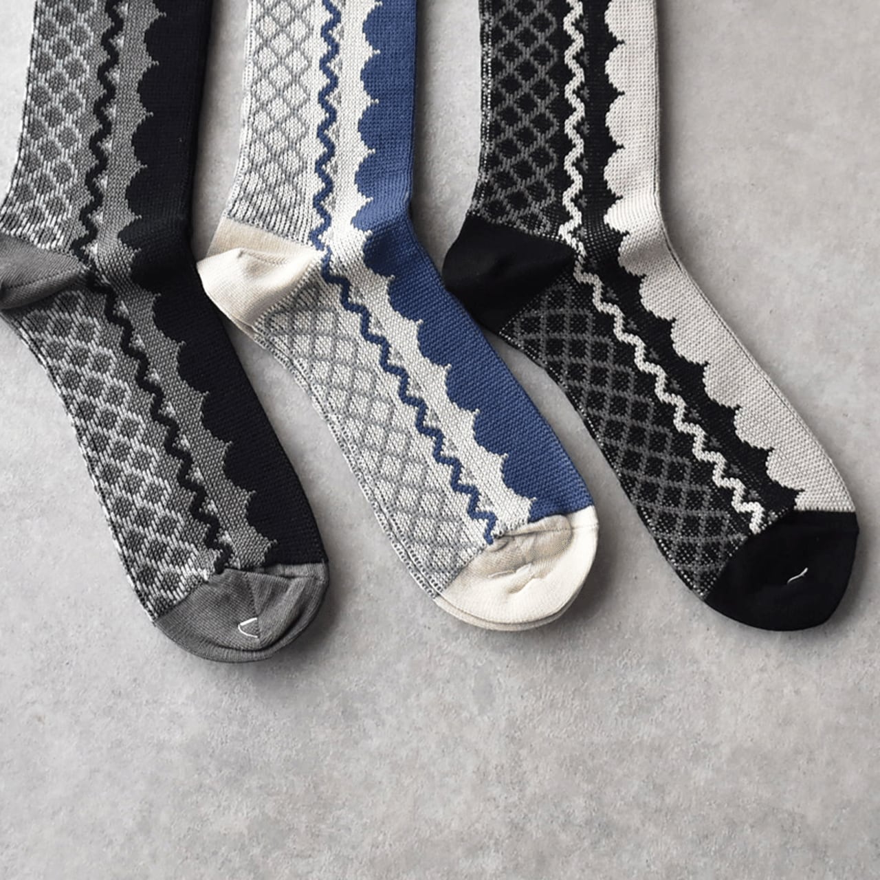 フレンチブルから春の新作ソックスが届きました。3種類のレースをモチーフにした女性らしい印象の一足です。落ち着いた配色なので甘くなりすぎず、モノトーンコーデのワンポイントにもオススメ。ジャガード編みで程よい厚みがありますので、春先の早い時期から着用頂けますよ。