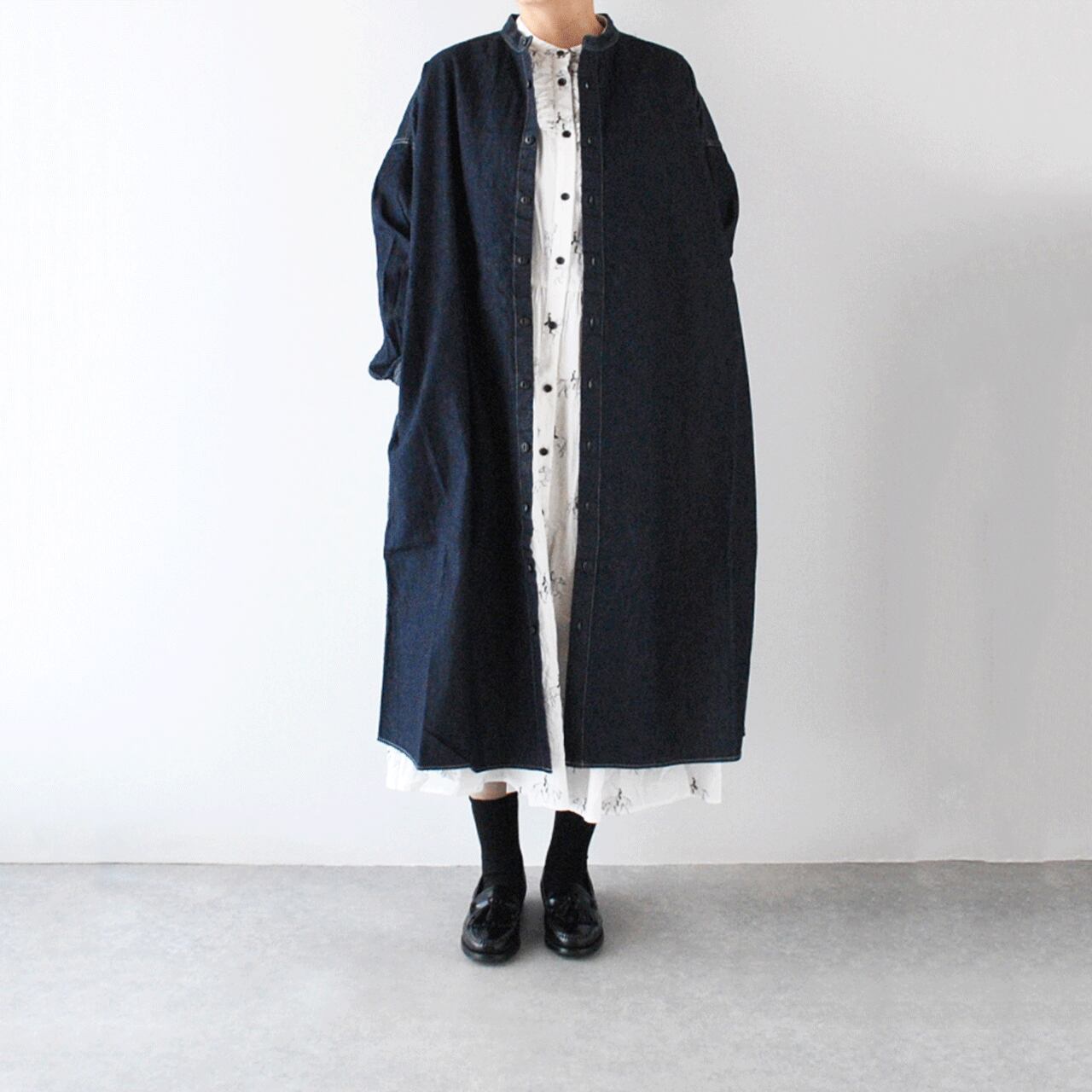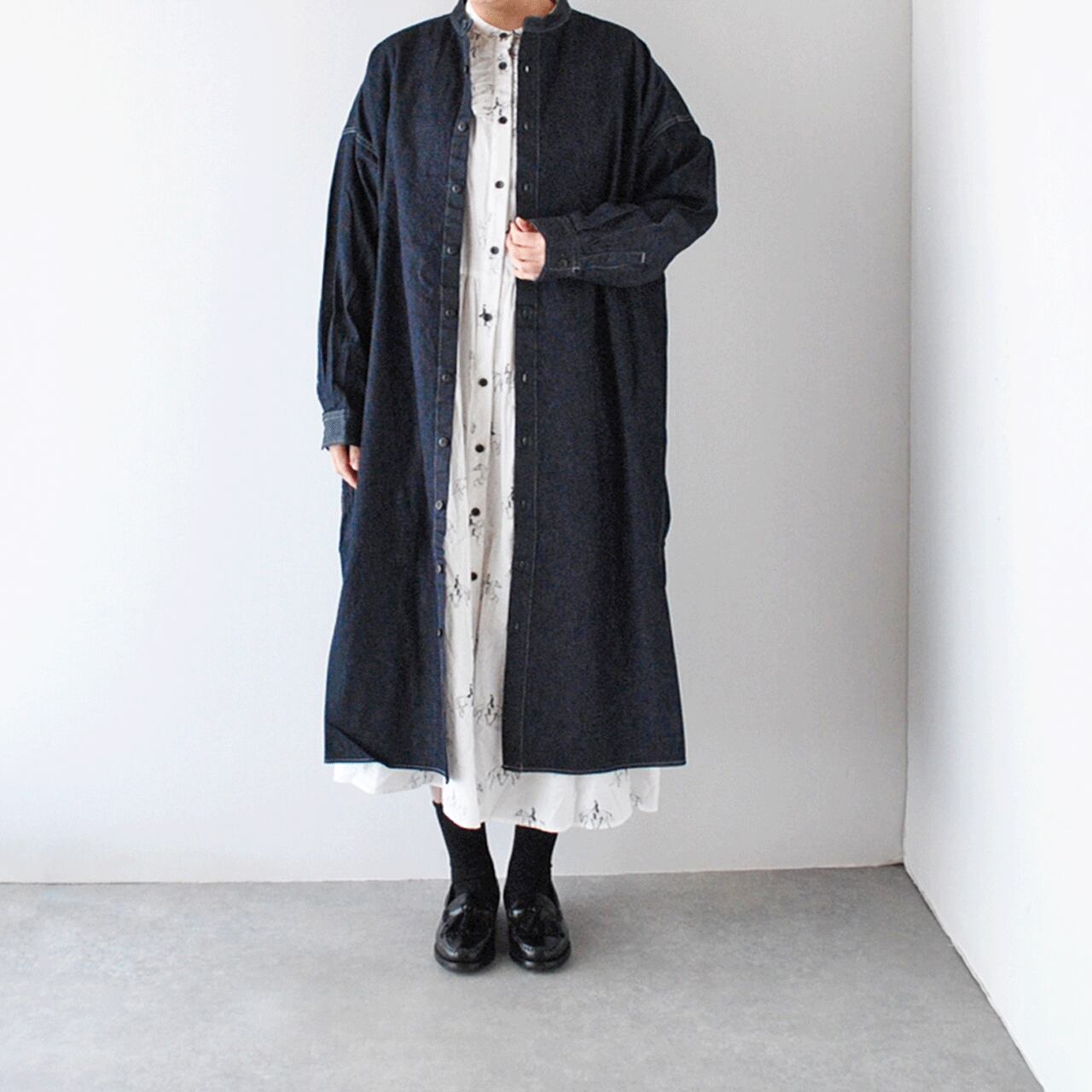 pritから6オンスのライトデニムで仕立てたシャツワンピースが入荷しました。「デニムは好きだけど堅くて重いのは苦手」という方に、しなやかな軽い着心地で楽しんで頂ける一枚です。肩幅・身幅を広くとったワイドシルエットもストレスフリー。シンプルに一枚でブーツと合わせたり、インナーパンツで大人っぽく変化をつけたり、前ボタンを開けてコートの様に羽織ったりと、本当に使い勝手が良いですよ。着るたびに身体に馴染んでくる経年変化も楽しみ。一年を通して大活躍してくれると思いますよ。